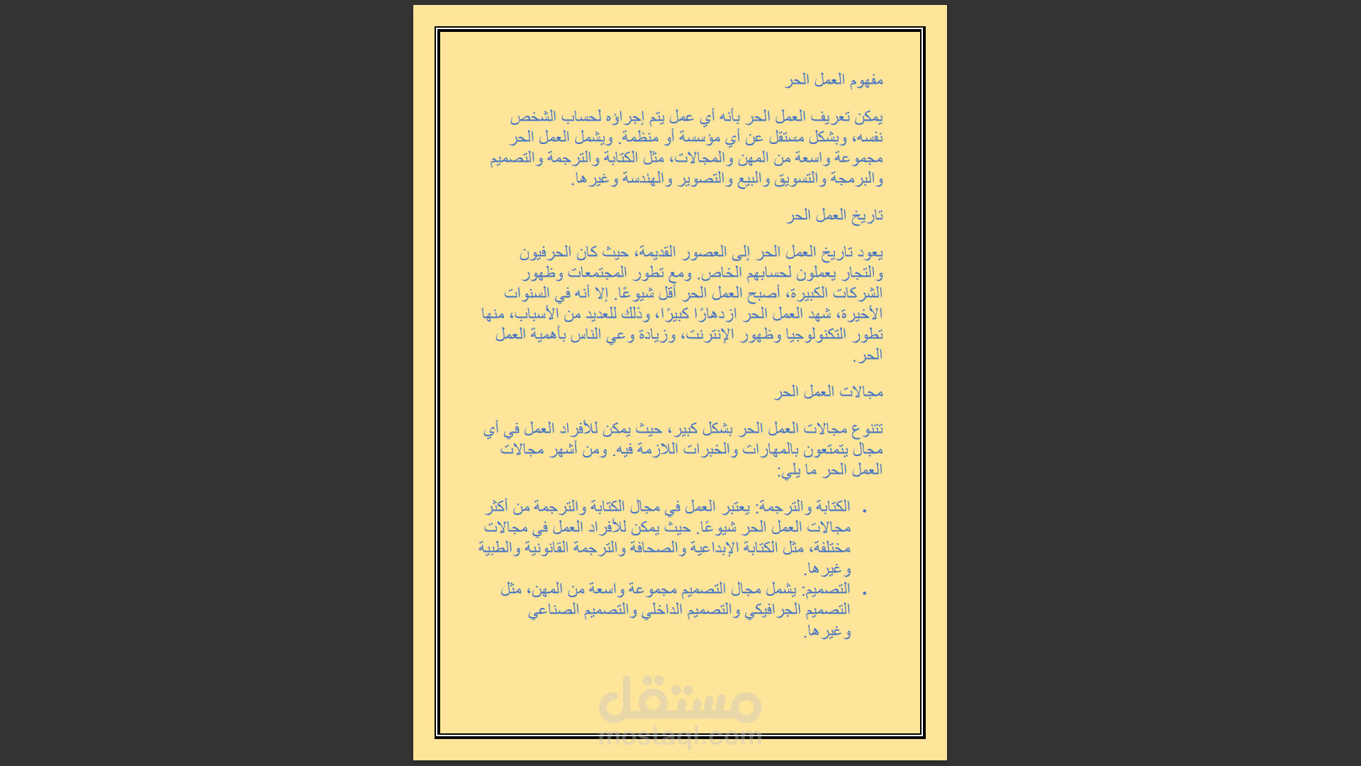 العمل الحر هو نموذج عمل يسمح للأفراد بالعمل لحسابهم الخاص، وتقديم خدماتهم أو منتجاتهم إلى العملاء دون الحاجة إلى عقد عمل ثابت مع صاحب عمل. وقد برز العمل الحر في السنوات الأخيرة كخيار جذاب للعديد من الأشخاص، وذلك للعديد من الأسباب، منها المرونة والاستقلالية وإمكانية تحقيق دخل مرتفع.