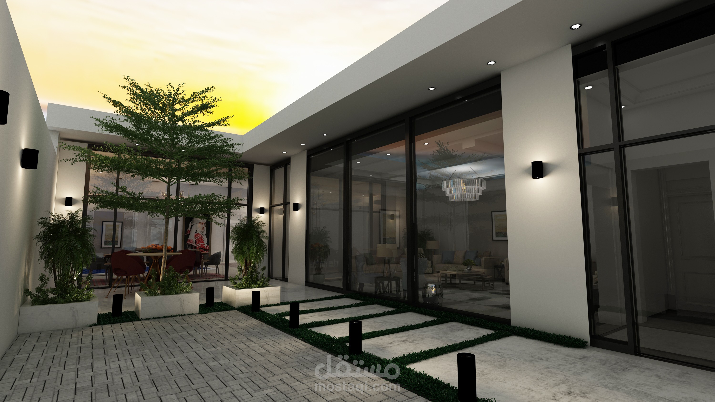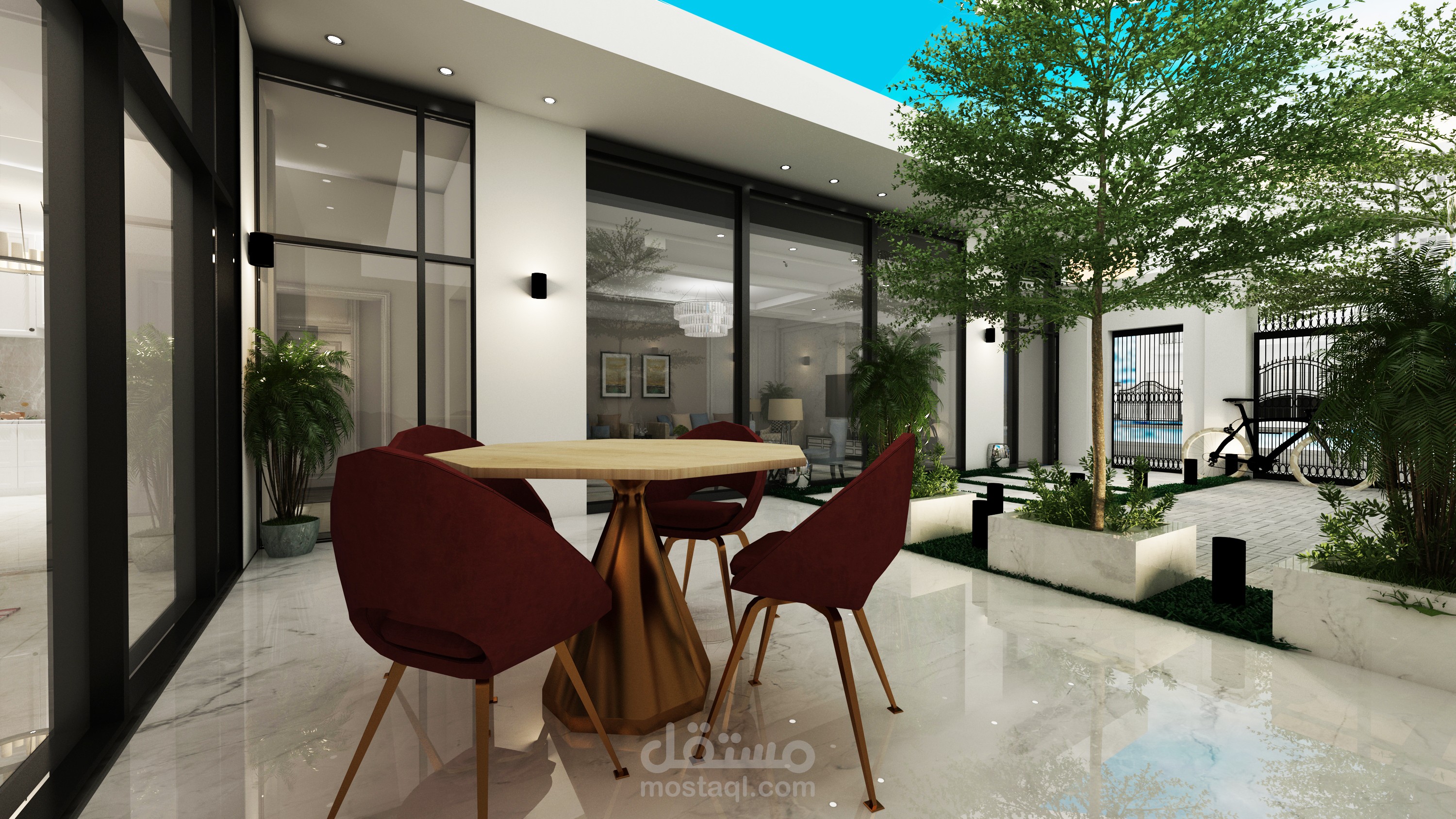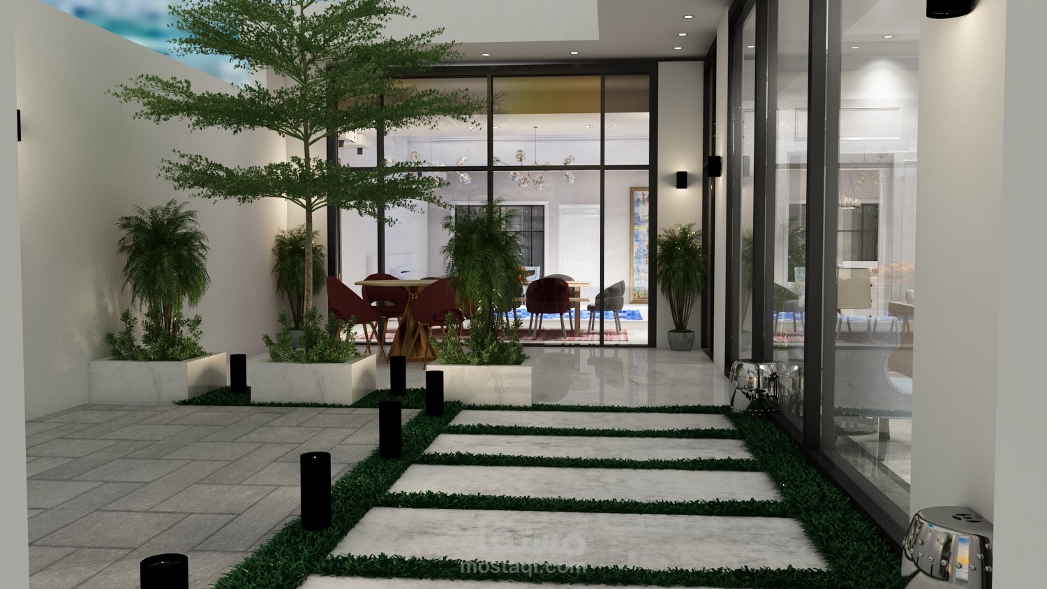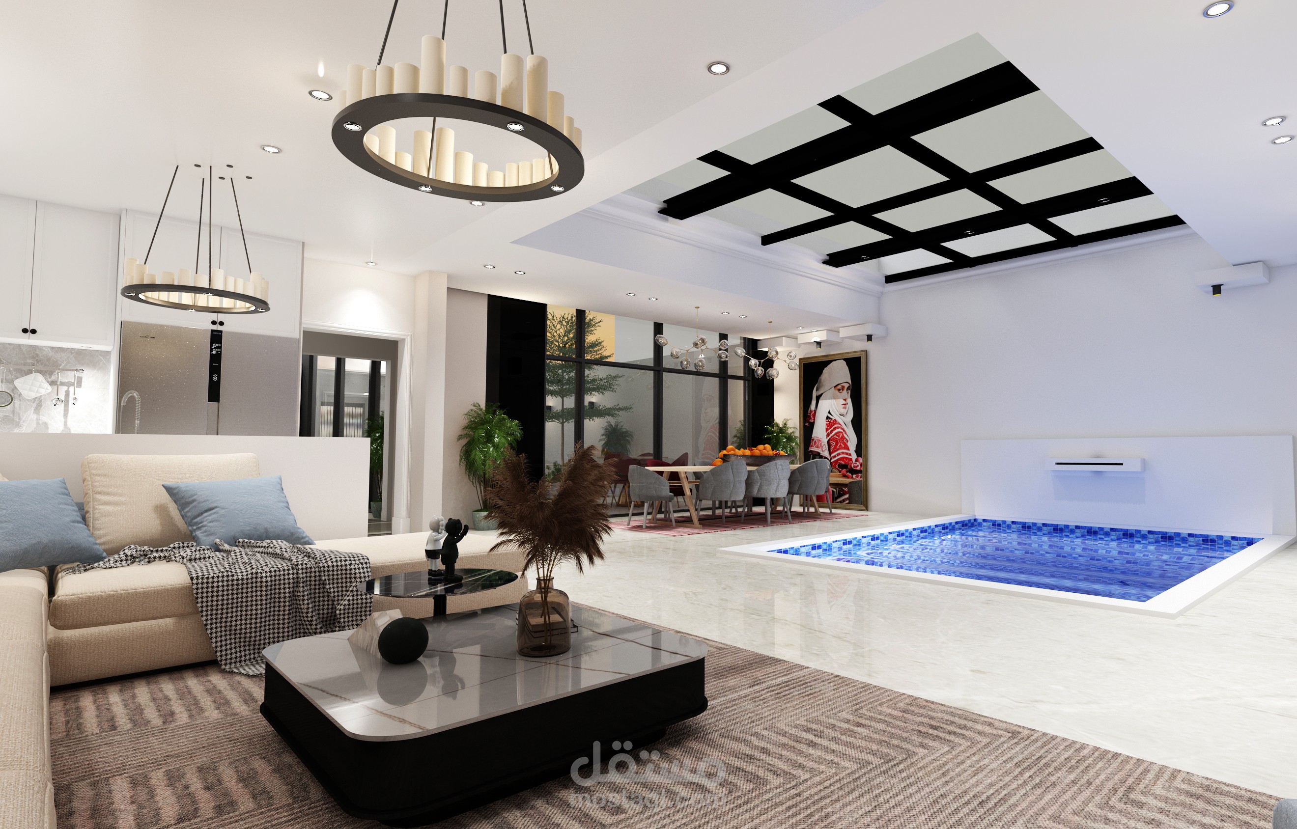 وواجهات زجاجية بانورامية مطلة بالكامل على الحديقة الخارجية والفراغات الداخلية مطلة على المسبح الداخلي