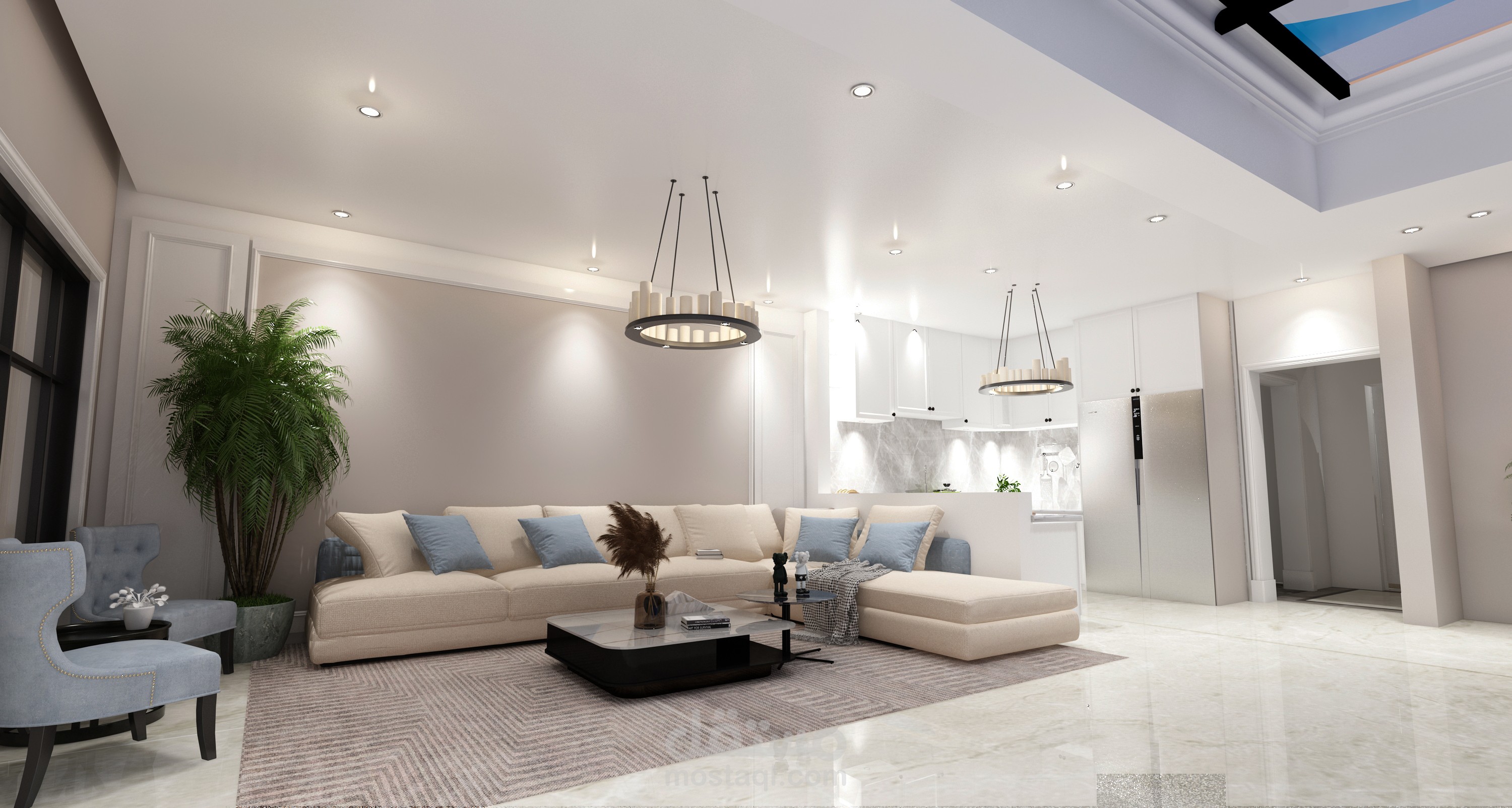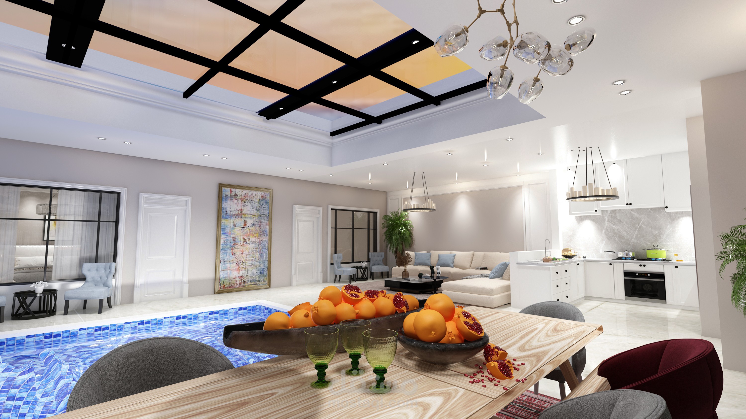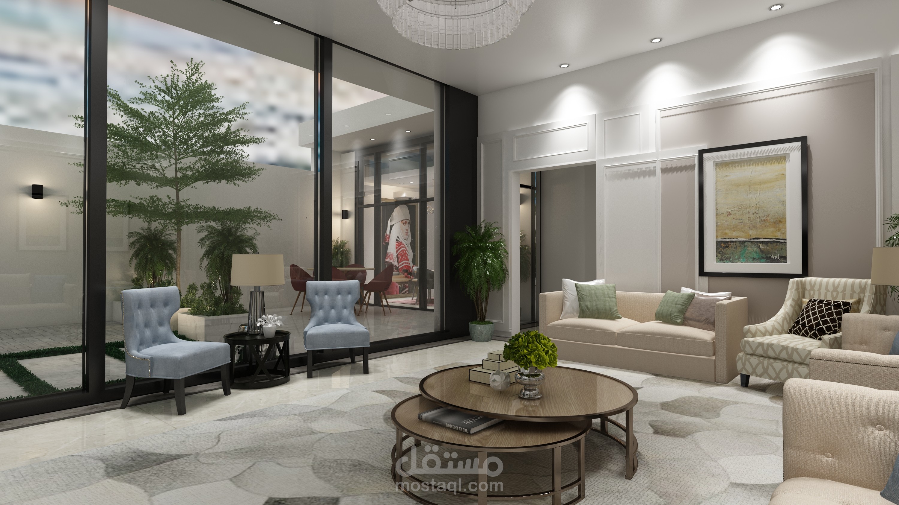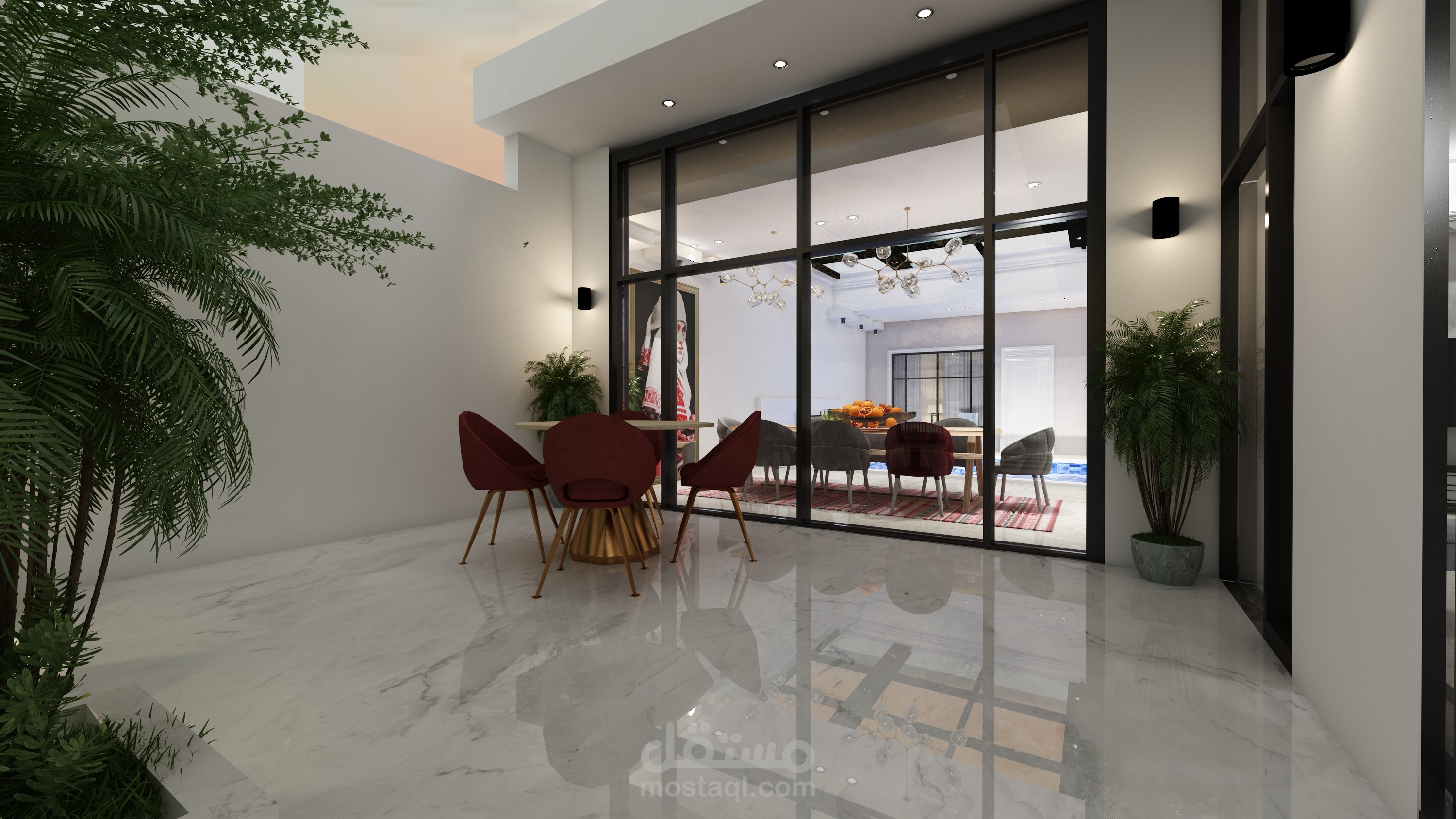 وواجهات زجاجية بانورامية مطلة بالكامل على الحديقة الخارجية والفراغات الداخلية مطلة على المسبح الداخلي