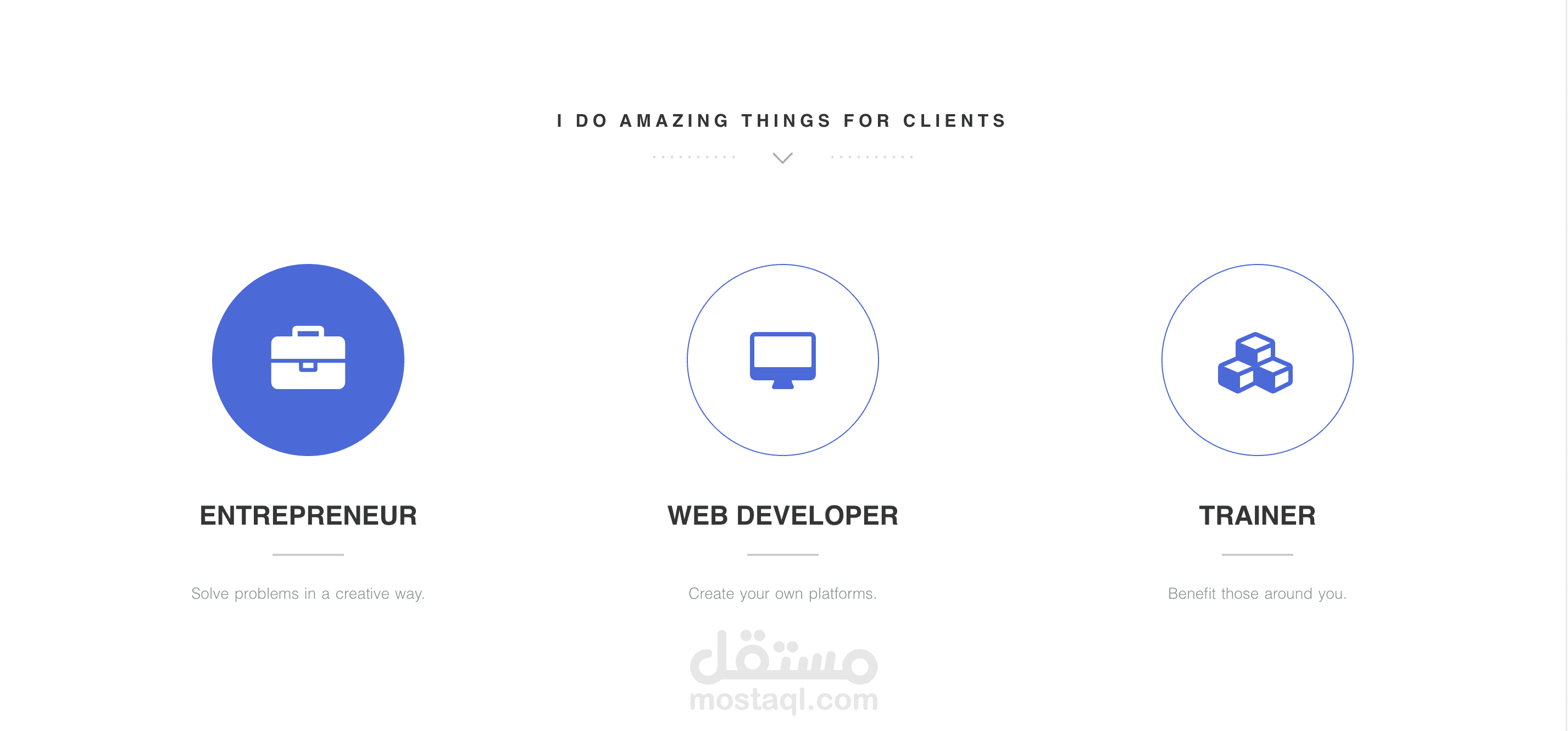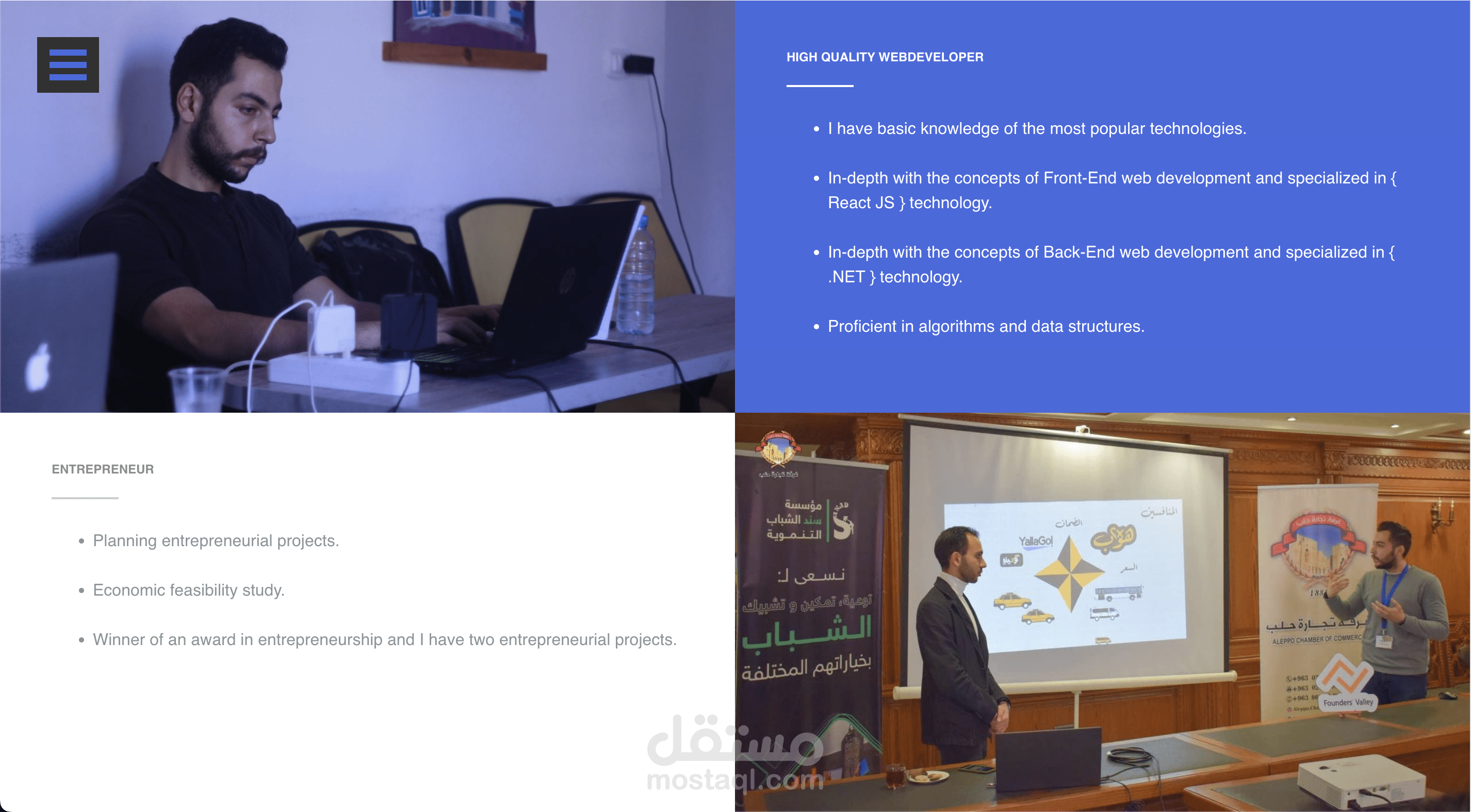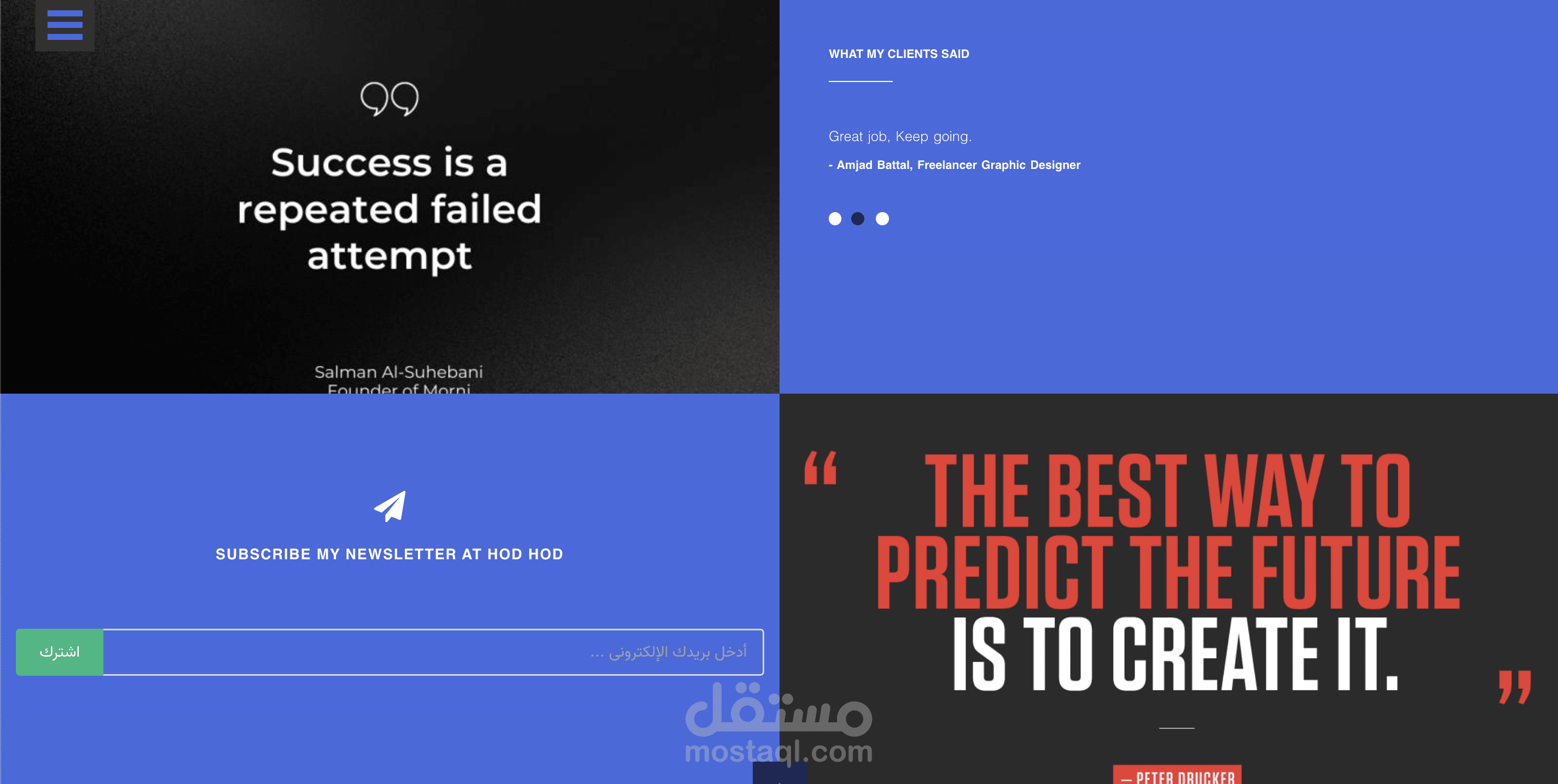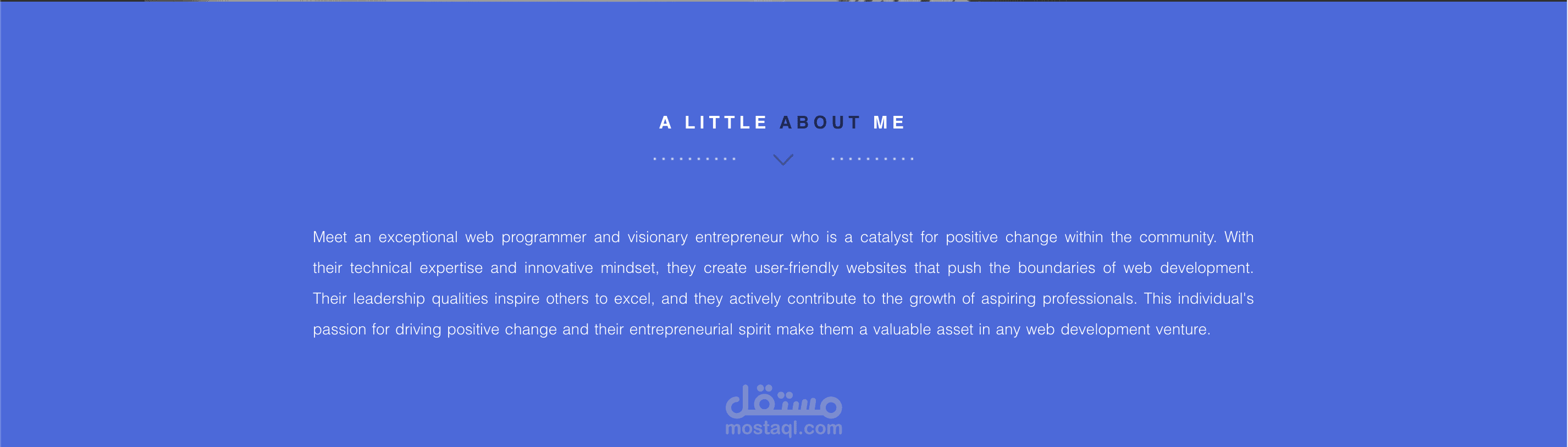 يعد موقع الويب هذا بمثابة صفحة هبوط لموقع شخصي فيه خدمات وخبرات واعمال الشخص ومنسقة بشكل واضح للمستخدمين وفيه مختلف الأنواع والتفضيلات. يتكون الموقع من الأقسام التالية: