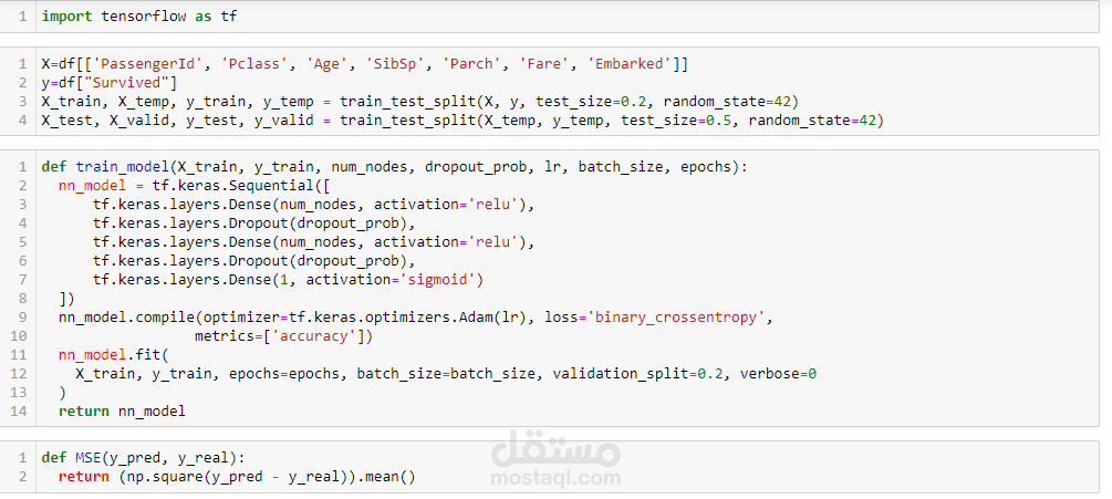 هذا عبارة العمل عن محاولة عمل موديل باستخدام بيانات عن تايتنك للوصول لافضل موديل يستطيع عمل prediction باكبر دقة ممكنة وذلك باستخدام لغة بايثون وNN و tf model