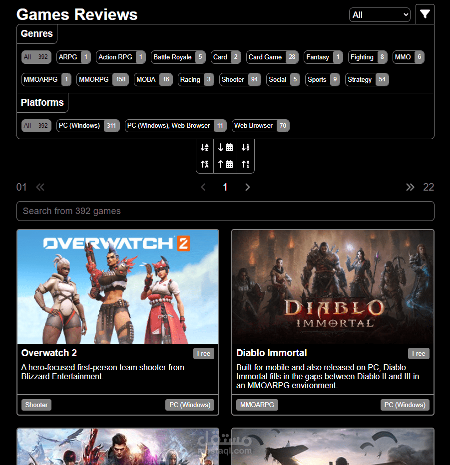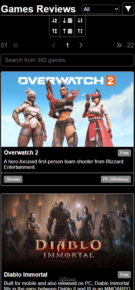 موقع مطور بالجافاسكريبت ويستخدم api لعرض بيانات الالعاب من قاعدة بيانات. بيه مزايا متعددة مثل التصفية حسب النوع ونظام التشغير المدعوم. ويدعم أيضا الترتيب الأبجدي والترتيب حسب تاريخ الإطلاق والبحث ومزايا اخرى.