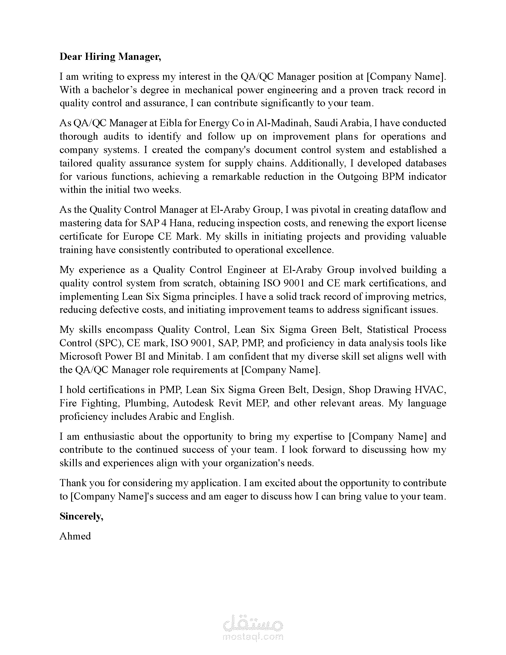 ; writing a resume cover letter for an engineering, point out his previous experiences, skills, Motivations, without specifying company name to use it for applying to Different companies.