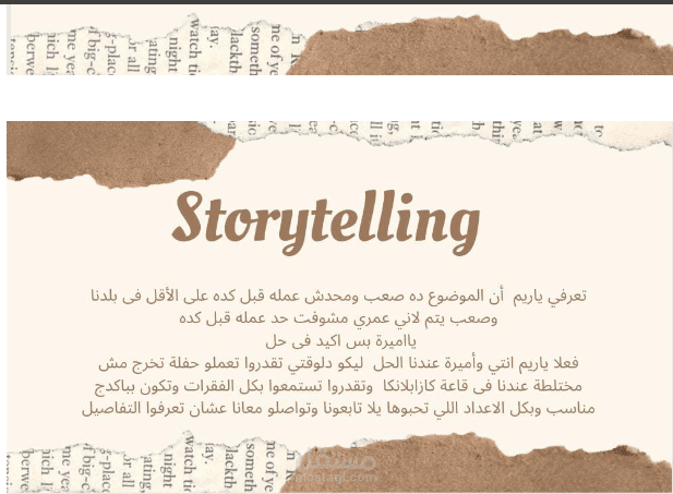 محتوى سرد قصصي (ستوري تيلنج) لجذب العميل ومشاركته اّلامه وانه ليس وحده وتقديم له الحل بكل سلاسه بعد توضيح والقاء الضوء على المشكلة والحرص على التشويق وكشف الامر فى نهاية تسلسل السرد ،ويتكون السرد القصصي من شخصيات وقصة وحبكة القصة