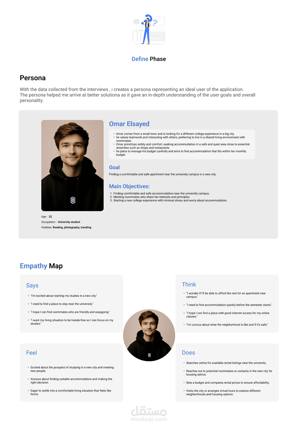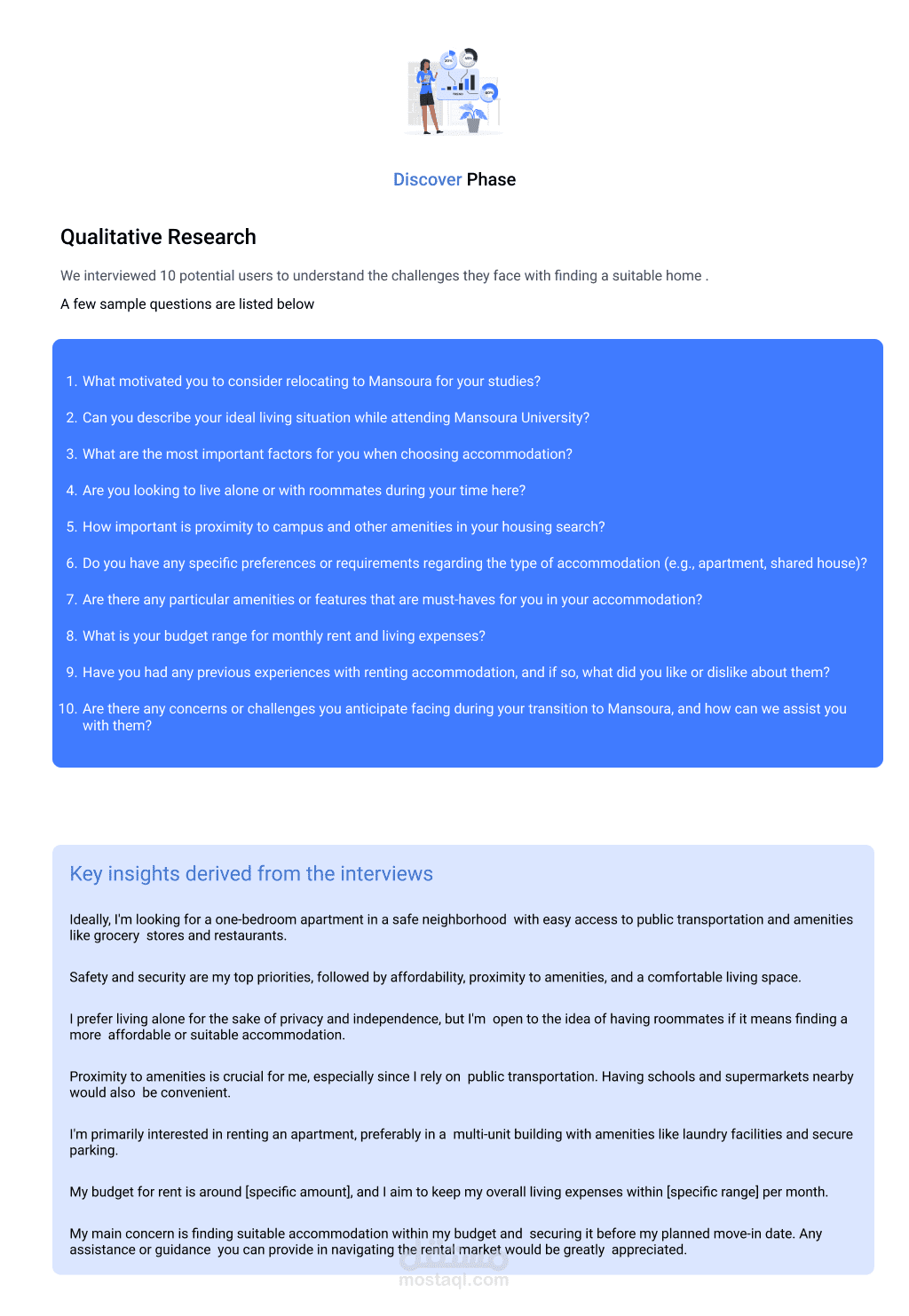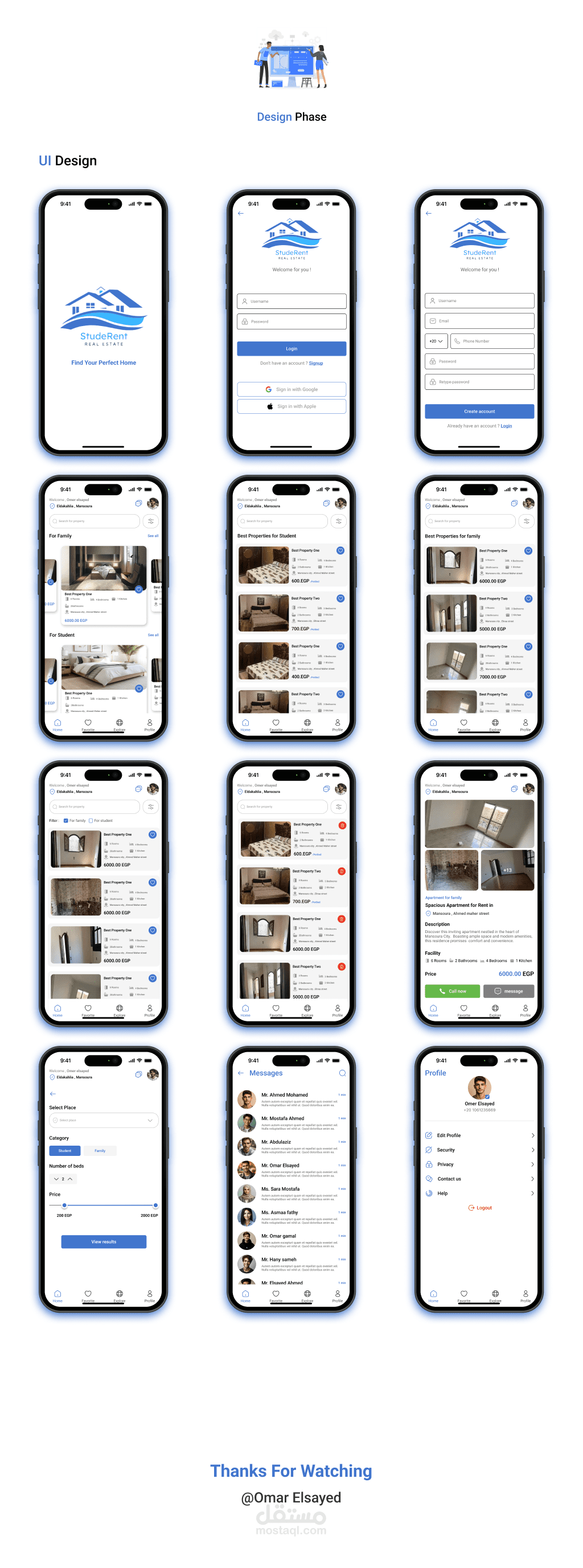 موبايل ابلكيشن خاص بتأجير الشقق والسكن الطلابي ل العائلات والطلاب المغتربين الذين اتوا من الخارج للدراسه في جامعه المنصوره , في هذا المشروع كنت مسؤول عن تصميم تجربه المستخدم وتصيميم الواجهة , في هذا المشروع ايضا كانت هناك مشكله في استغلال بعض السماسره ل الطلاب ف حاولت ان اوفر علي الطلاب والعائلات اسعار السماسره المبالغ فيها عن طريق تأجير الشقق من اصحاب الشقق ذاتهم عن طريق الابلكيشن دا .