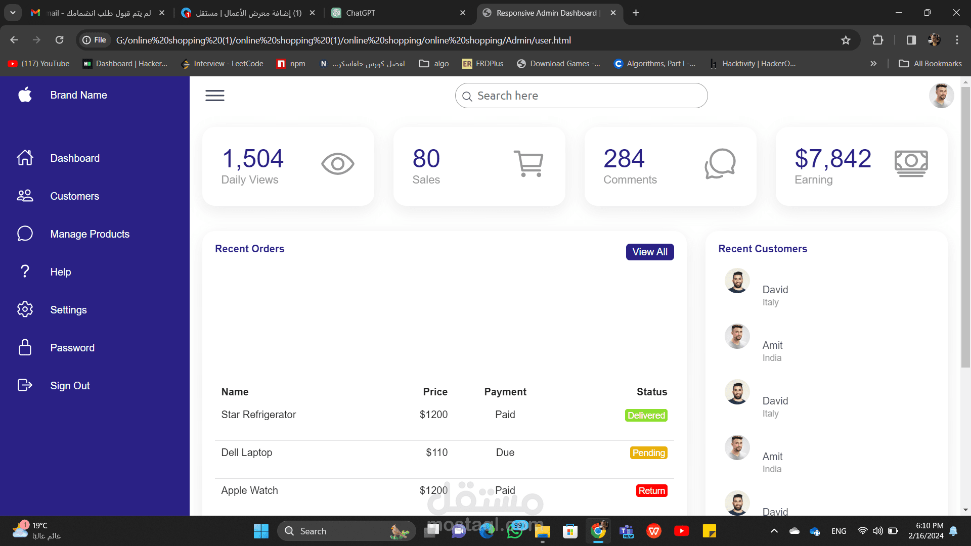 On the front-end, I design and implement user interfaces using HTML, CSS, and JavaScript to ensure a visually appealing and intuitive shopping experience. This includes building responsive layouts that adapt to different screen sizes and devices, as well as integrating interactive elements such as product carousels, image galleries, and dynamic filters.