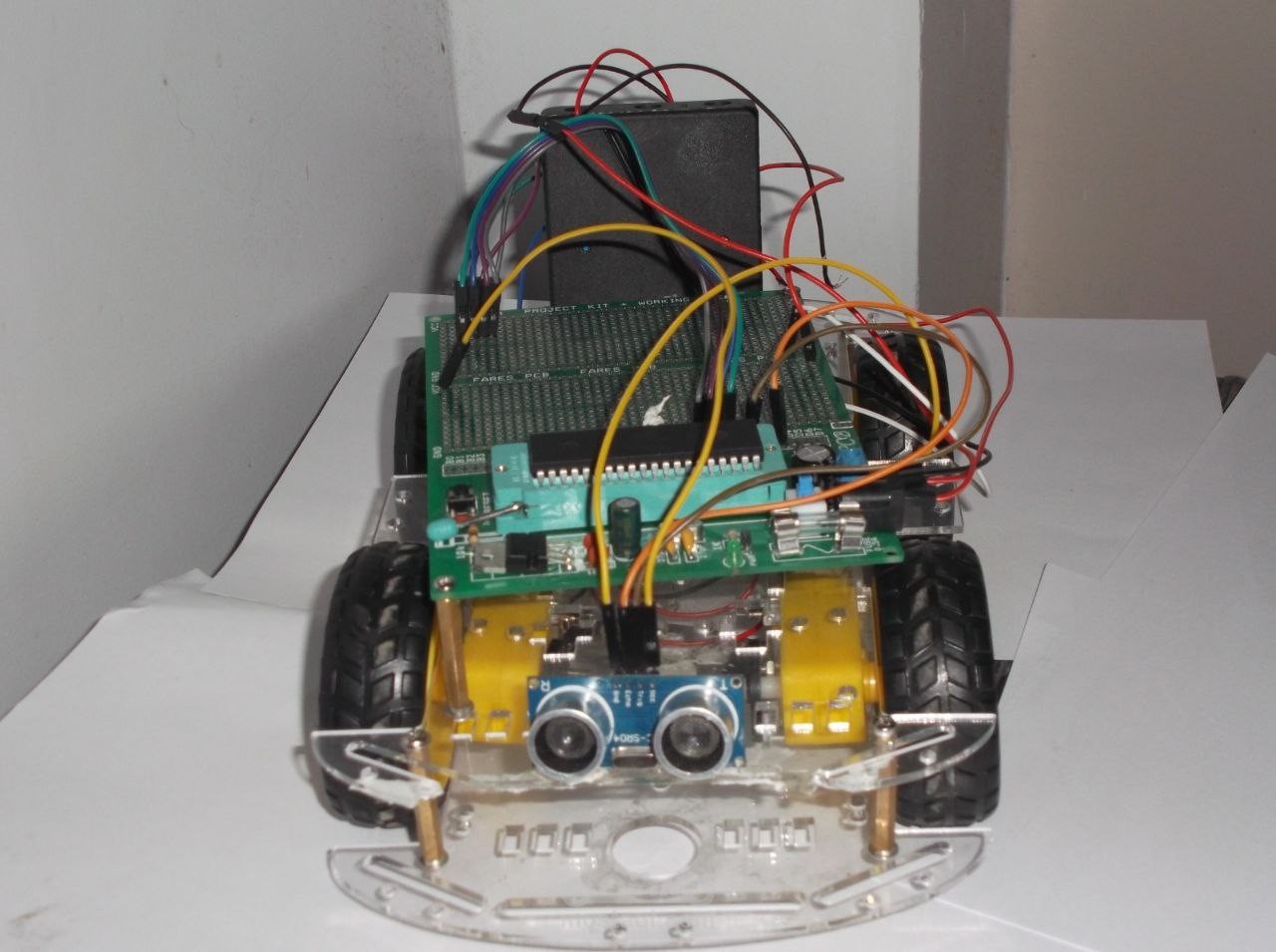 هذا الروبوت يقيس المسافة عن طريق الالتراسونيك ومن ثم بتخذ قرار اذا كان المكان امامه غير مغلق سيسير فيه واذا كان هنالك عوائق سيتخذ قرار بالالتفاف يمنة ويسرة ويختار الطريق الخالي من العوائق ويسير فيه تم استخدام atmega32 في التحكم في هذا الروبوت ويتم قياس المسافة عن طريق ارسال الاشارات من الالتراسونيك للمتحكم لاتخاذ قرار حيال هذة البيانات