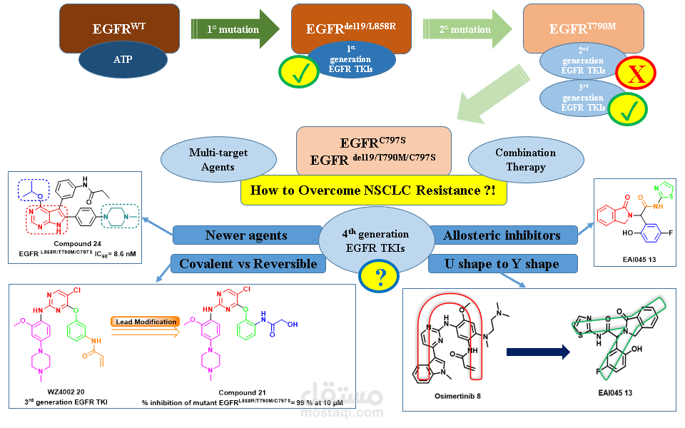 Lung cancer is the second most common cause of morbidity and mortality among cancer types worldwide, with non-small cell lung cancer (NSCLC) representing the majority of most cases. Epidermal growth factor receptor tyrosine kinase inhibitors (EGFR TKIs) are among the most commonly used targeted therapy to treat NSCLC. Recent years have seen the evaluation of many synthetic EGFR TKIs, most of which showed therapeutic activity in pertinent models and were classified as first, second, and third-generation. The latest studies have concluded that their efficacy was also compromised by additional acquired mutations, including C797S. Because second- and third-generation EGFR TKIs are irreversible inhibitors, they are ineffective against C797S containing EGFR triple mutations (Del19/T790M/C797S and L858R/T790M/C797S). Therefore, there is an urgent unmet medical need to develop next-generation EGFR TKIs that selectively inhibit EGFR triple mutations via a non-irreversible mechanism. This review covers the fourth-generation EGFR-TKIs' most recent design with their essential binding interactions, the clinical difficulties, and the potential outcomes of treating patients with EGFR mutation C797S resistant to third-generation EGFR-TKIs was also discussed. Moreover, the utilization of various therapeutic strategies, including multi-targeting drugs and combination therapies, has also been reviewed.