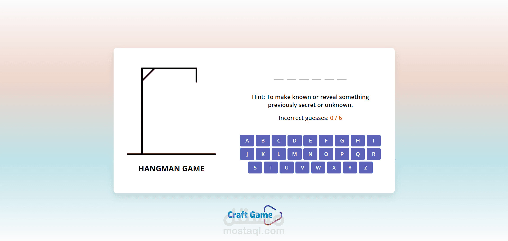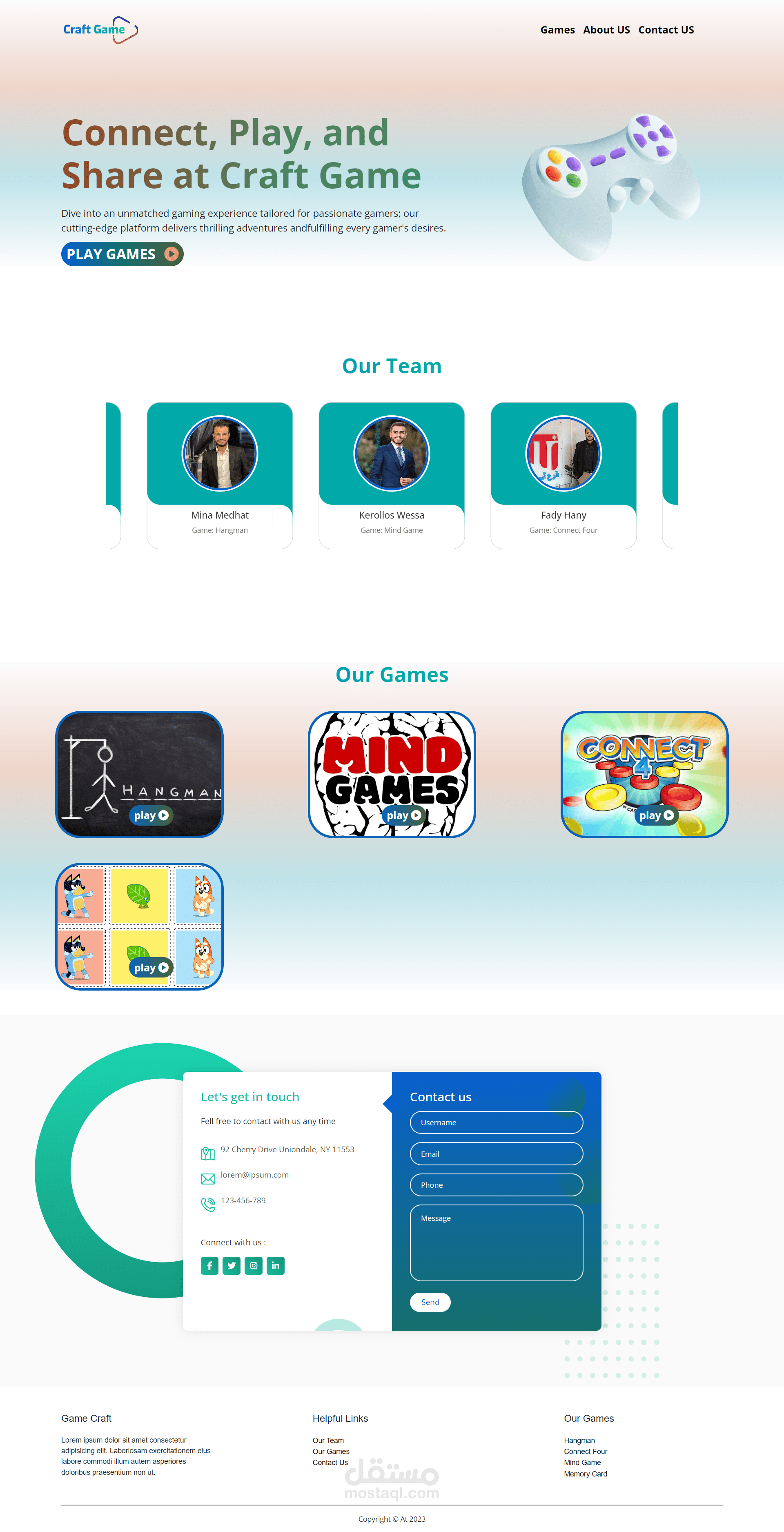 موقع العاب يتكون من خمس صفحات صفحة الهبوط بها الفريق الخاص بالمشروع وتواصل معنا ثم جزء الالعاب وبه اربع العاب كل لعبه بها صفحه مستقله والالعاب هي :