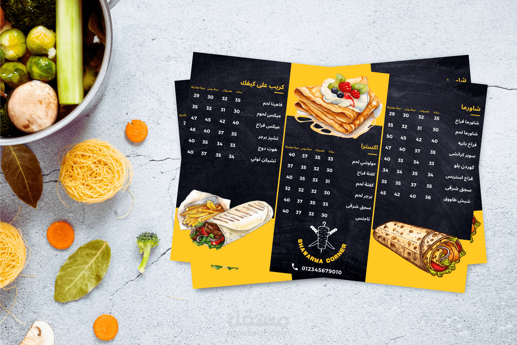 منيو مطعم شاورما ، و تم مراعاة استخدام الوان و صور و شعار مناسب للعمل.