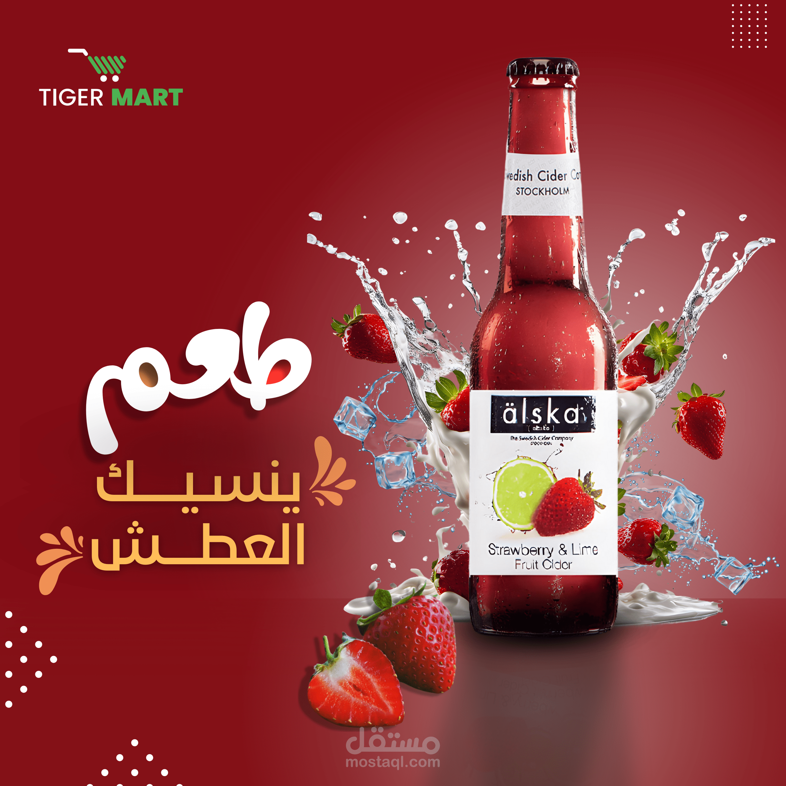 تصميم سوشيال ميديا لعصير فراوله لصالح TIGER MART حسب الهويه البصريه للمنتج ةالوان اللوجو