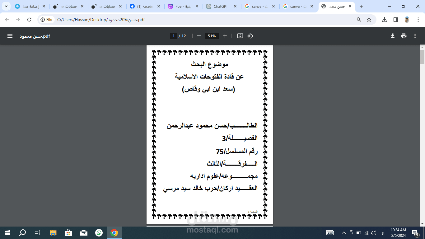 بحث عن قادة الفتوحات الاسلامية وعن دور اصحابي سعد بن ابي وقاص ودورة في الفتوحات الاسلامية واهم المواقف التي تعرض لها وانشاء الدروس المستفادة منها وجعله في مكانة القدوة لدى الاجيال القادمة ودوره العظيم في مواقع الحروب مثل بدر واحد وقيادته للحرب في سن صغير كل هذا واكثر يشمله البحث بشكل مفصل في ما لا يقل عن 12 صفحة