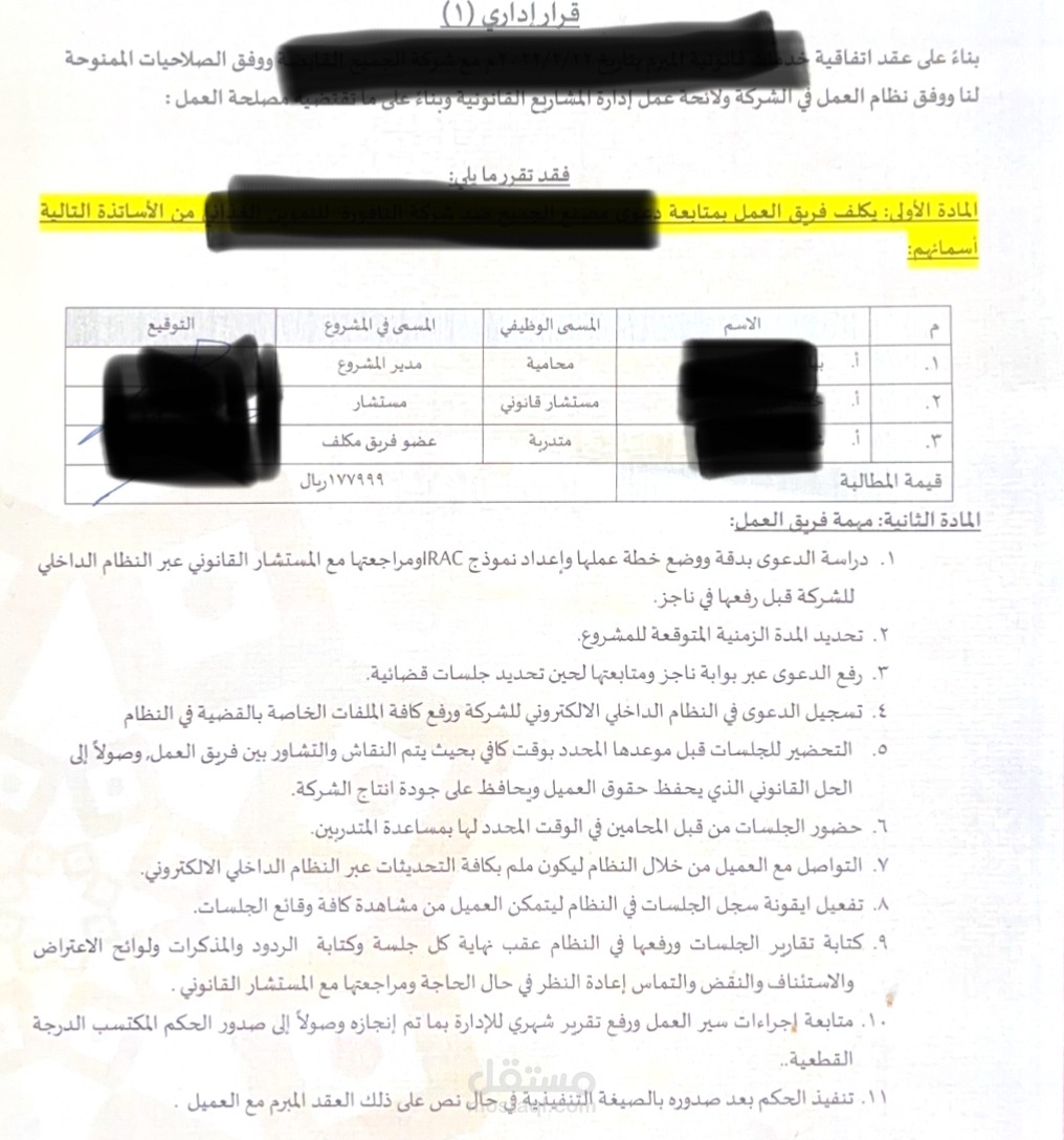 كتابة خطابات ادارية تكليف وتشكيل فرق عمل للعمل على المشاريع القانونية والقضايا والاستشارات القانونية