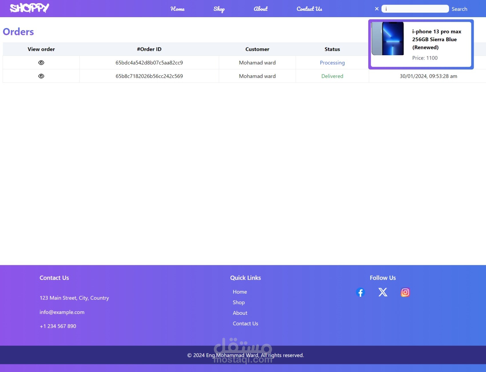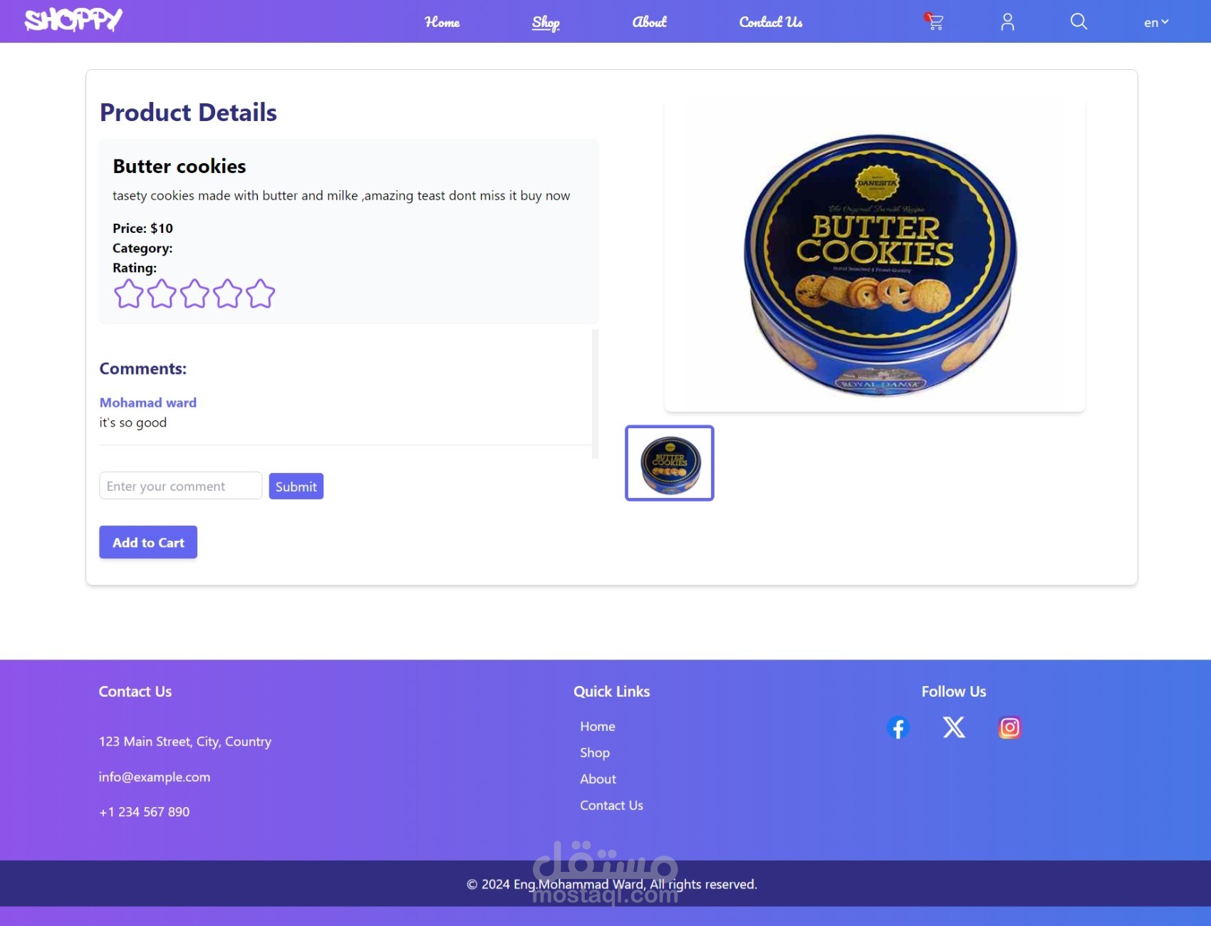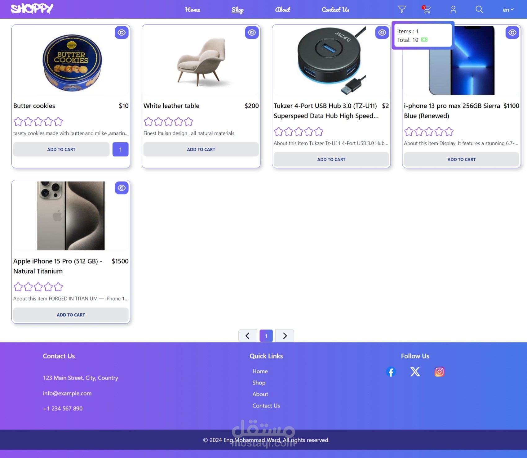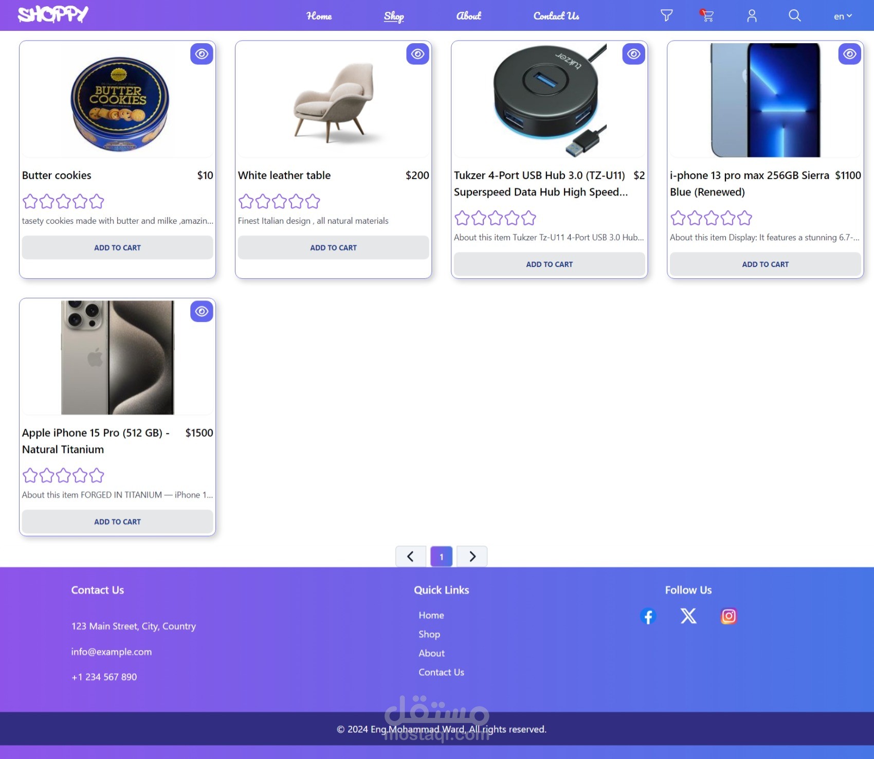 - صفحة التسوق تحوي كل المنتجات مرتبة حسب أحدث منج تم إضافته - وجود فلاتر للمنتجات و خاصية البحث و عرض المنتج بشكل تفصيلي