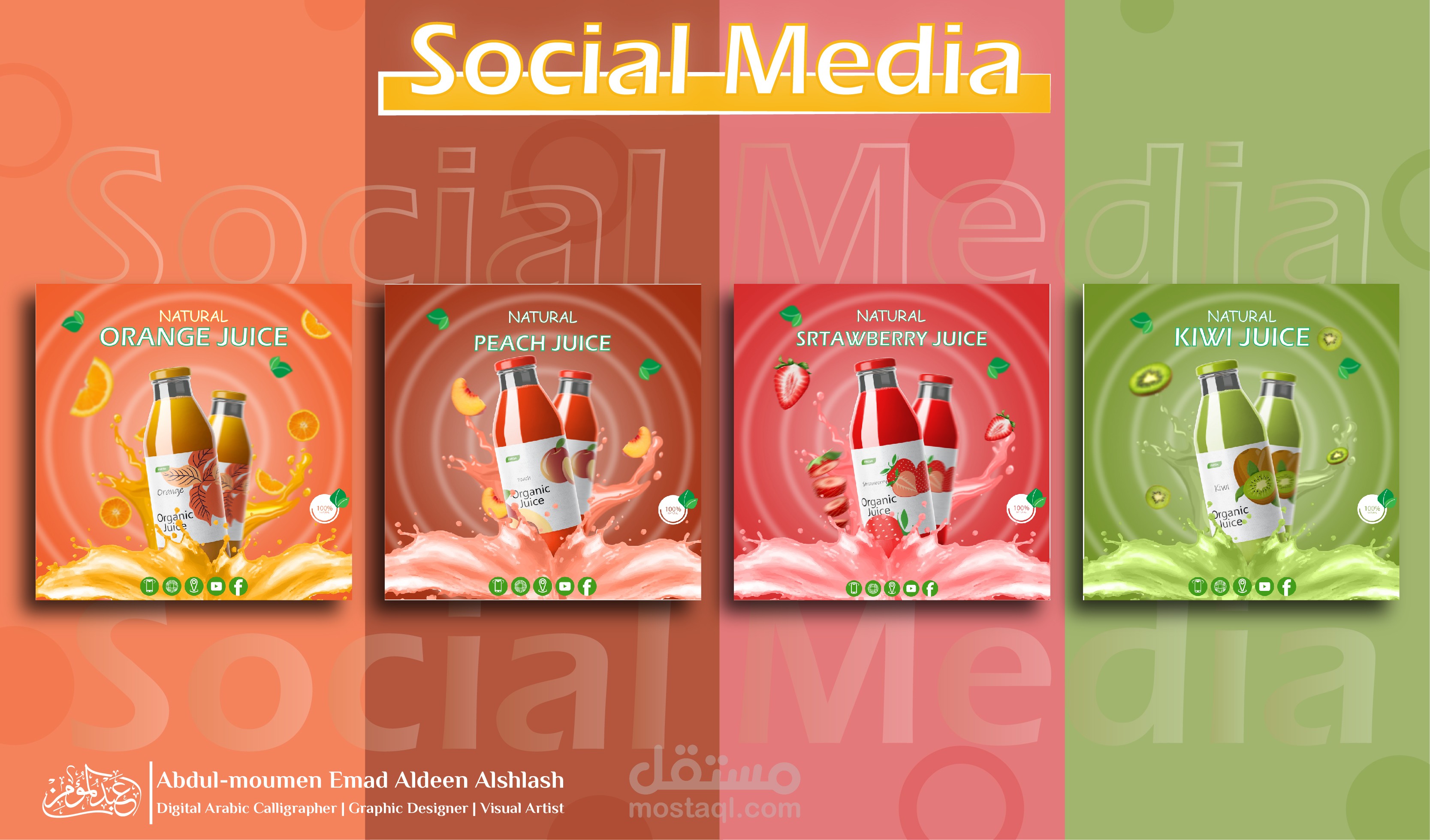 مرحبا وأهلا وسهلا بكم في معرض أعمالنا My Juice | Social Media Design 03 لتصميم منشورات التواصل الاجتماعي، نحن ملتزمون بتقديم خدمات تصميم بمهارة وإبداع باستخدام أفضل البرامج والتقنيات والأدوات، نحن نقدّر جداً ونفهم أهمية المنشورات كوسيلة عرض منتجاتكم وعروضكم لنشاطكم التجاري، كما سنعمل بكل جد واحترافية وإبداع لتقديم منشورات تعكس جوهر عملكم بشكل مميز جداً، سيكون لدينا تركيز كامل على فهم رؤيتكم ومتطلباتكم لتصاميم فريدة تلبي توقعاتكم وتميز علامتكم التجارية عن الآخرين.