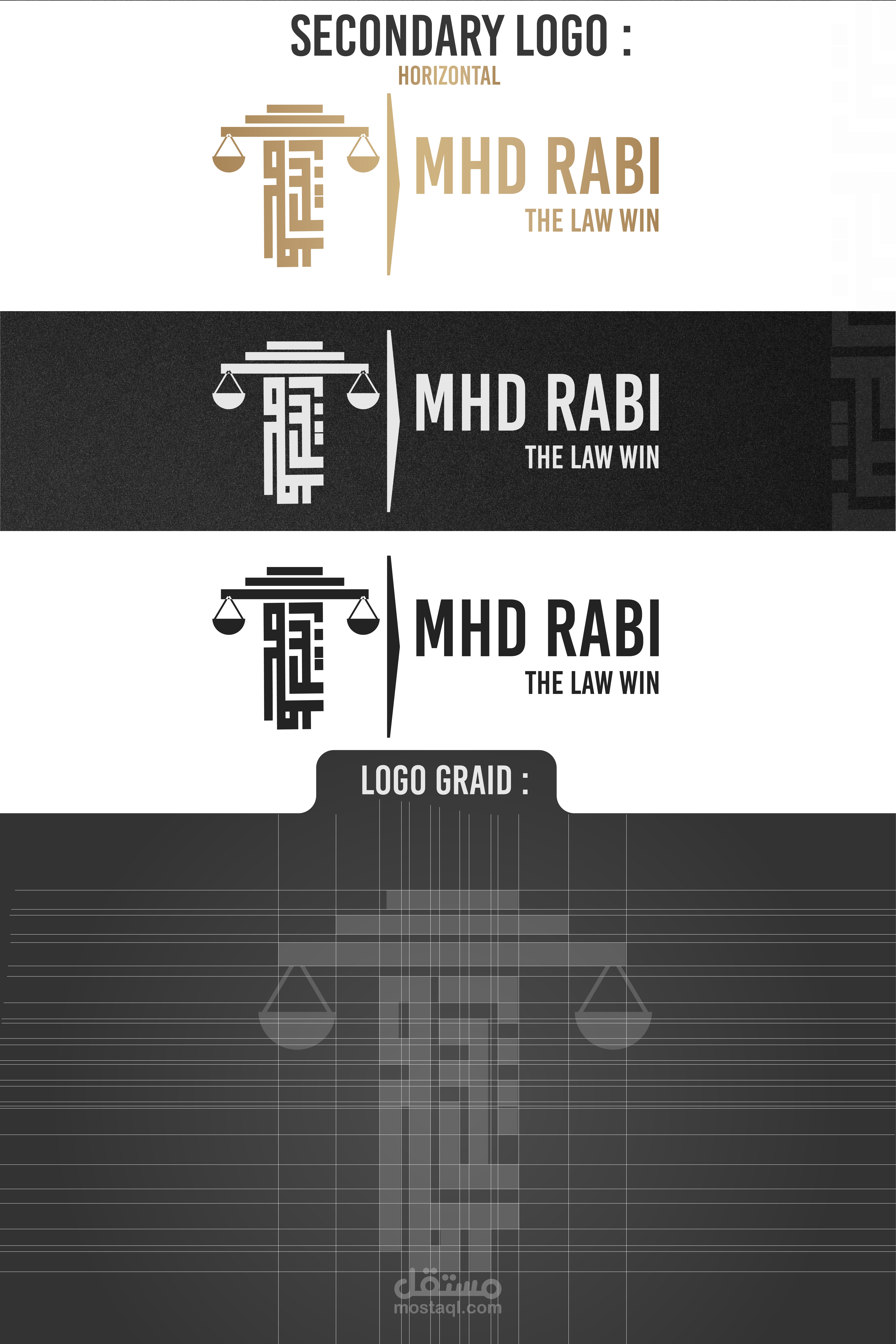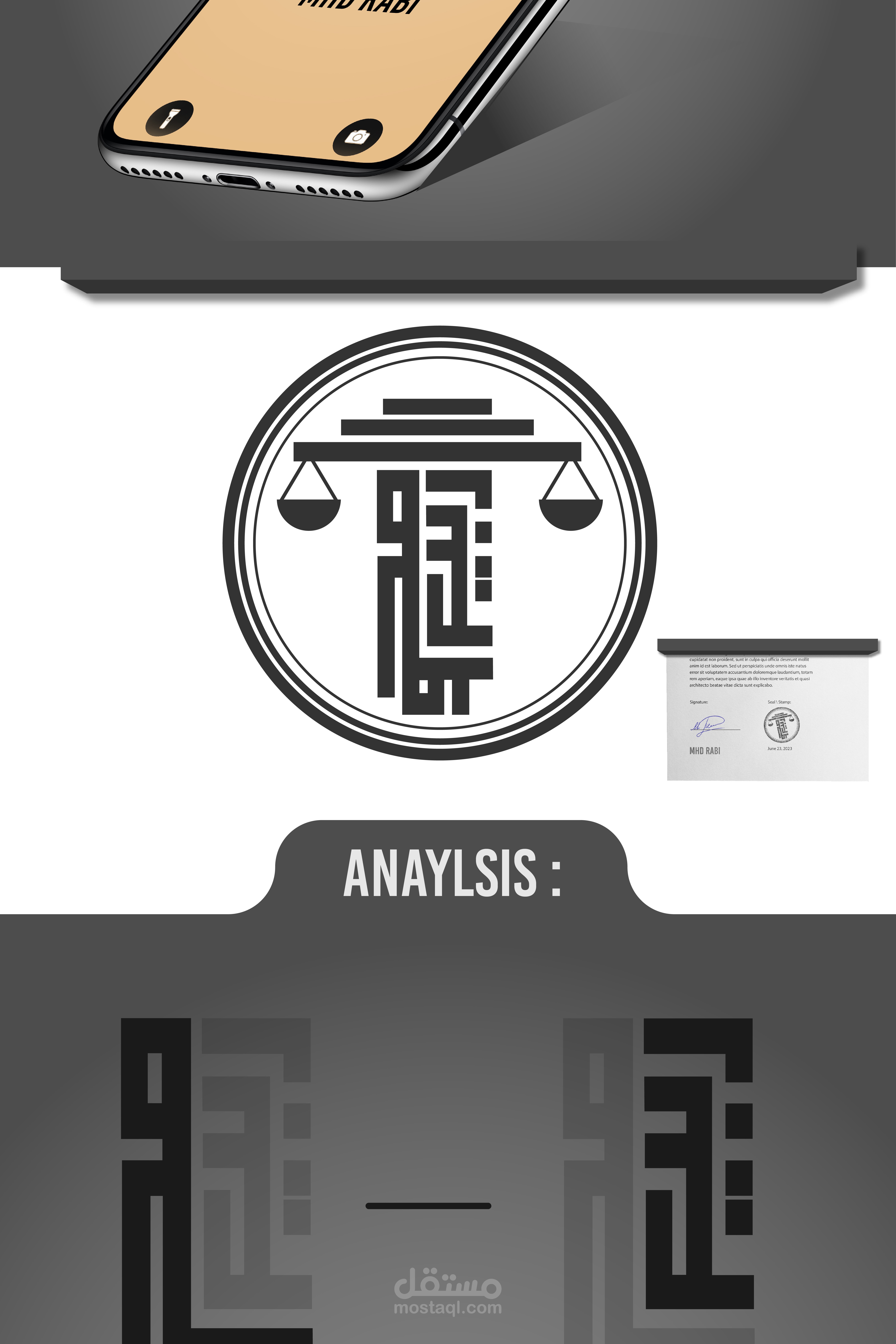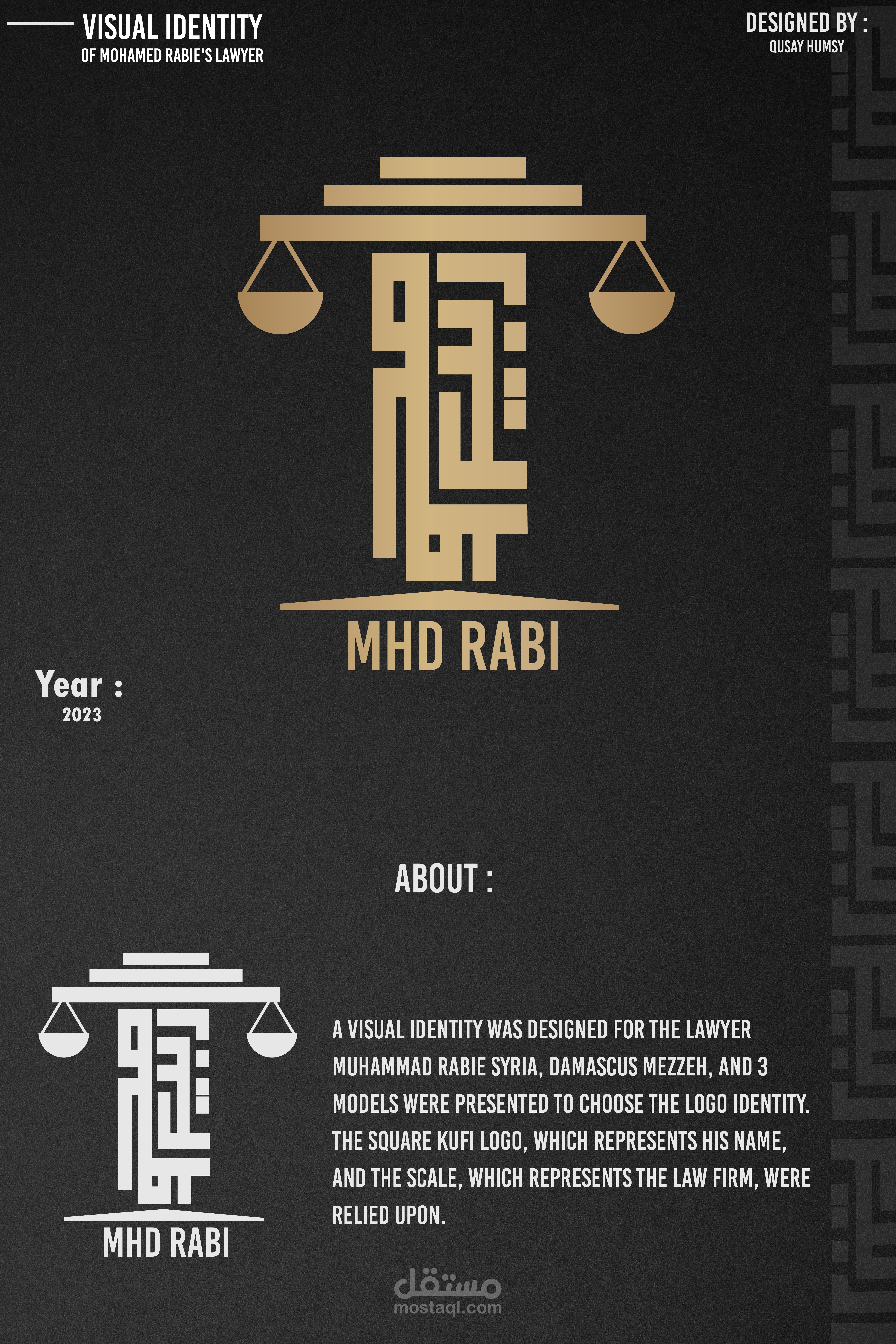 A visual identity was designed for the lawyer Muhammad Rabie Syria, Damascus Mezzeh, and 3 models were presented to choose the logo identity. The square Kufi logo, which represents his name, and the scale, which represents the law firm, were relied upon.