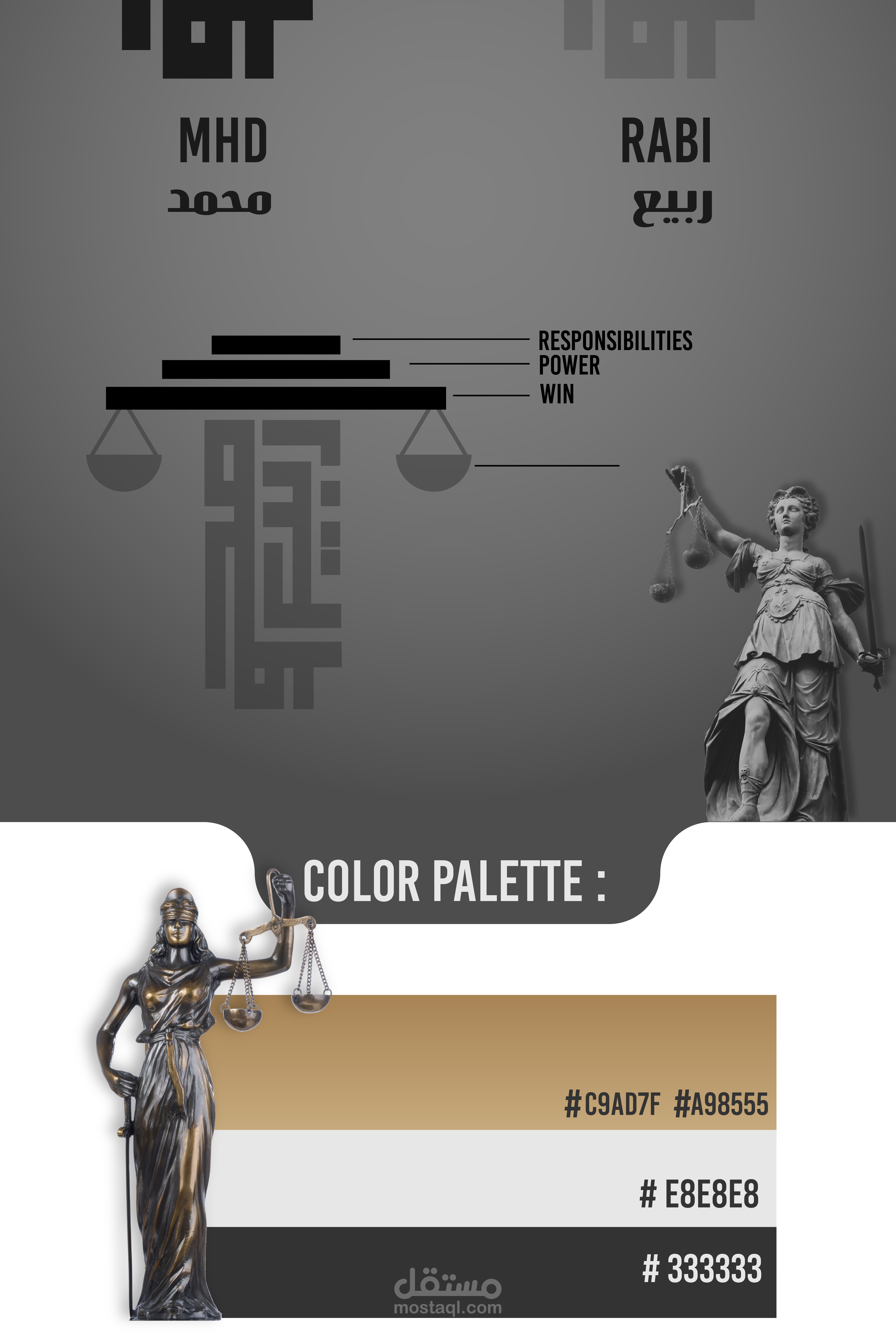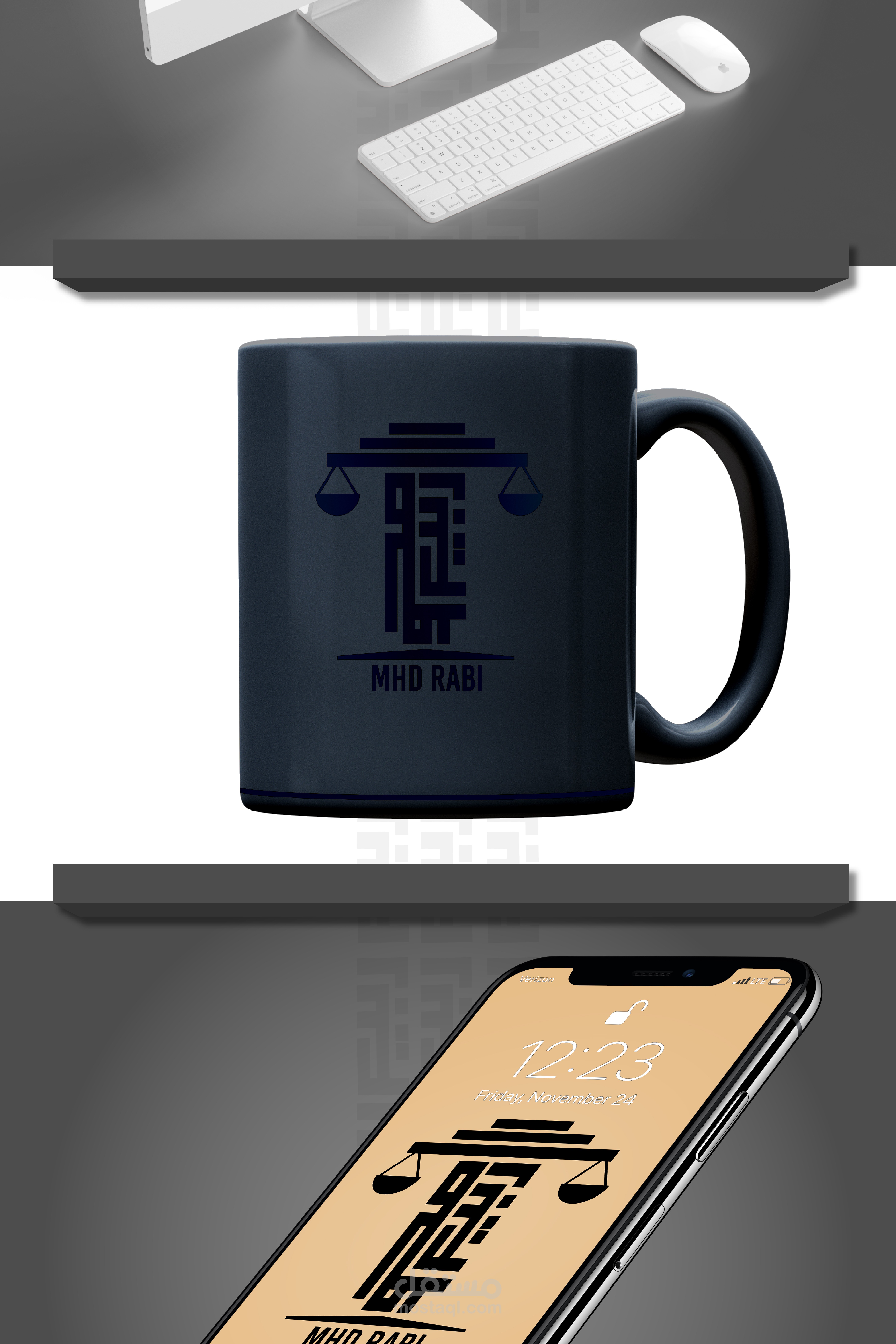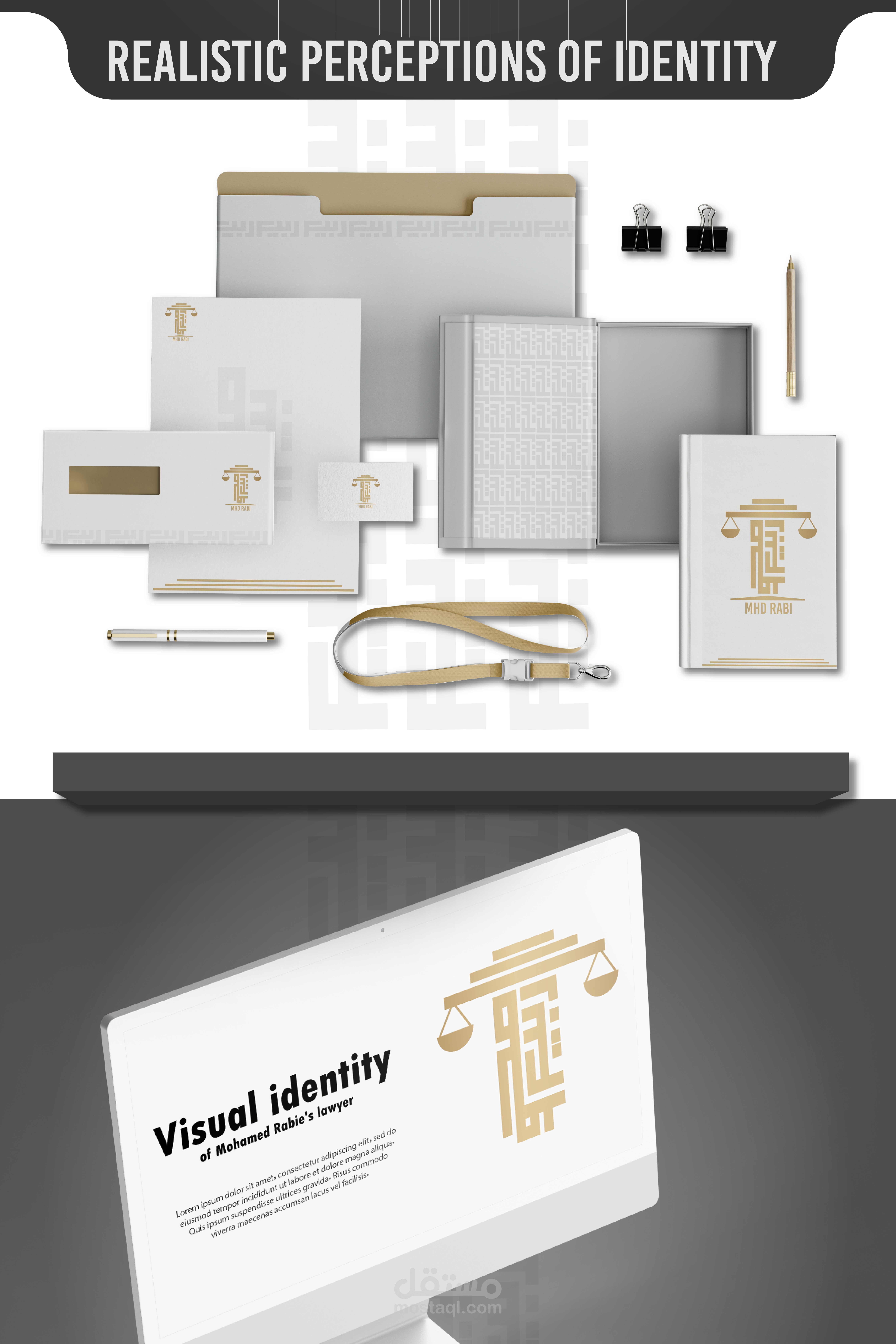 A visual identity was designed for the lawyer Muhammad Rabie Syria, Damascus Mezzeh, and 3 models were presented to choose the logo identity. The square Kufi logo, which represents his name, and the scale, which represents the law firm, were relied upon.