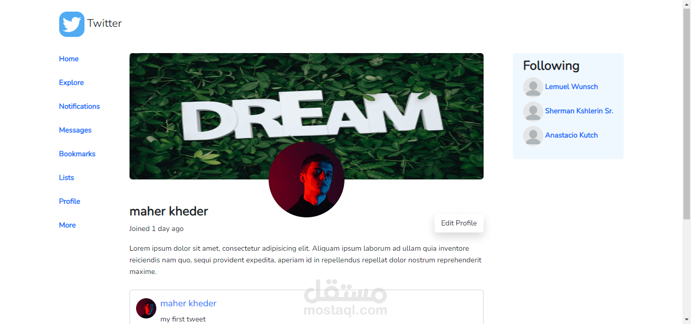 تطبيق ويب تم برمجته بإطار العمل لارافيل وهو نسخة عن منصة تويتر ويحوي الميزات التالية: