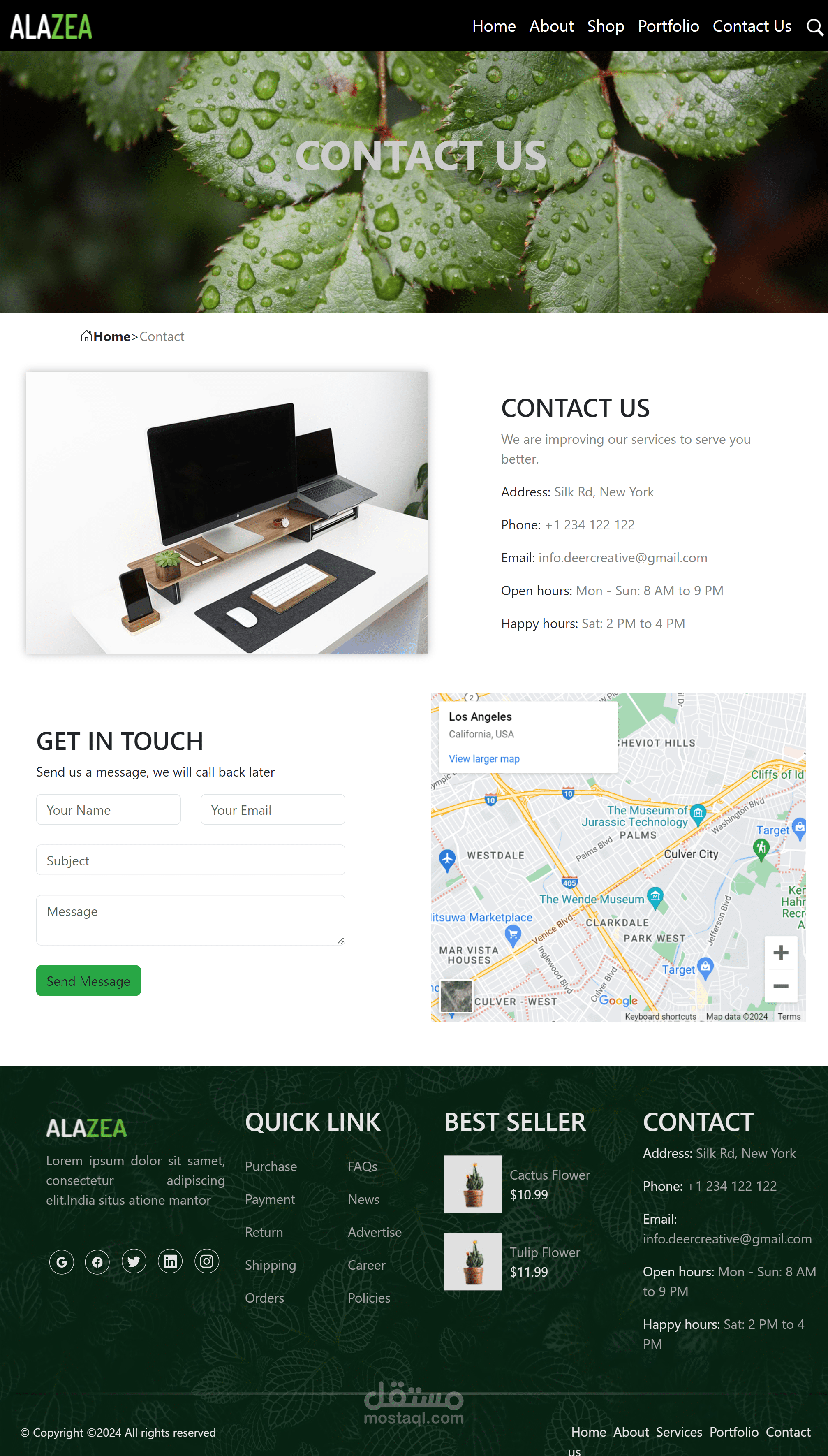 الصفحة هي صفحة اتصل بنا (Contact Us) توفر وسيلة للزوار للتواصل مع صاحب الموقع أو الشركة. تحتوي الصفحة على معلومات الاتصال مثل العنوان، ورقم الهاتف، والبريد الإلكتروني، وساعات العمل. بالإضافة إلى ذلك، تتيح الصفحة للزوار ملء نموذج اتصال يمكنهم من خلاله إرسال رسالة مباشرة. تحتوي الصفحة أيضًا على صورة لخريطة جوجل تظهر الموقع الجغرافي للشركة، وروابط لوسائل التواصل الاجتماعي، بالإضافة إلى روابط سريعة للقوائم المفيدة مثل الشراء، والدفع، والإرجاع، والشحن، والأسئلة الشائعة.