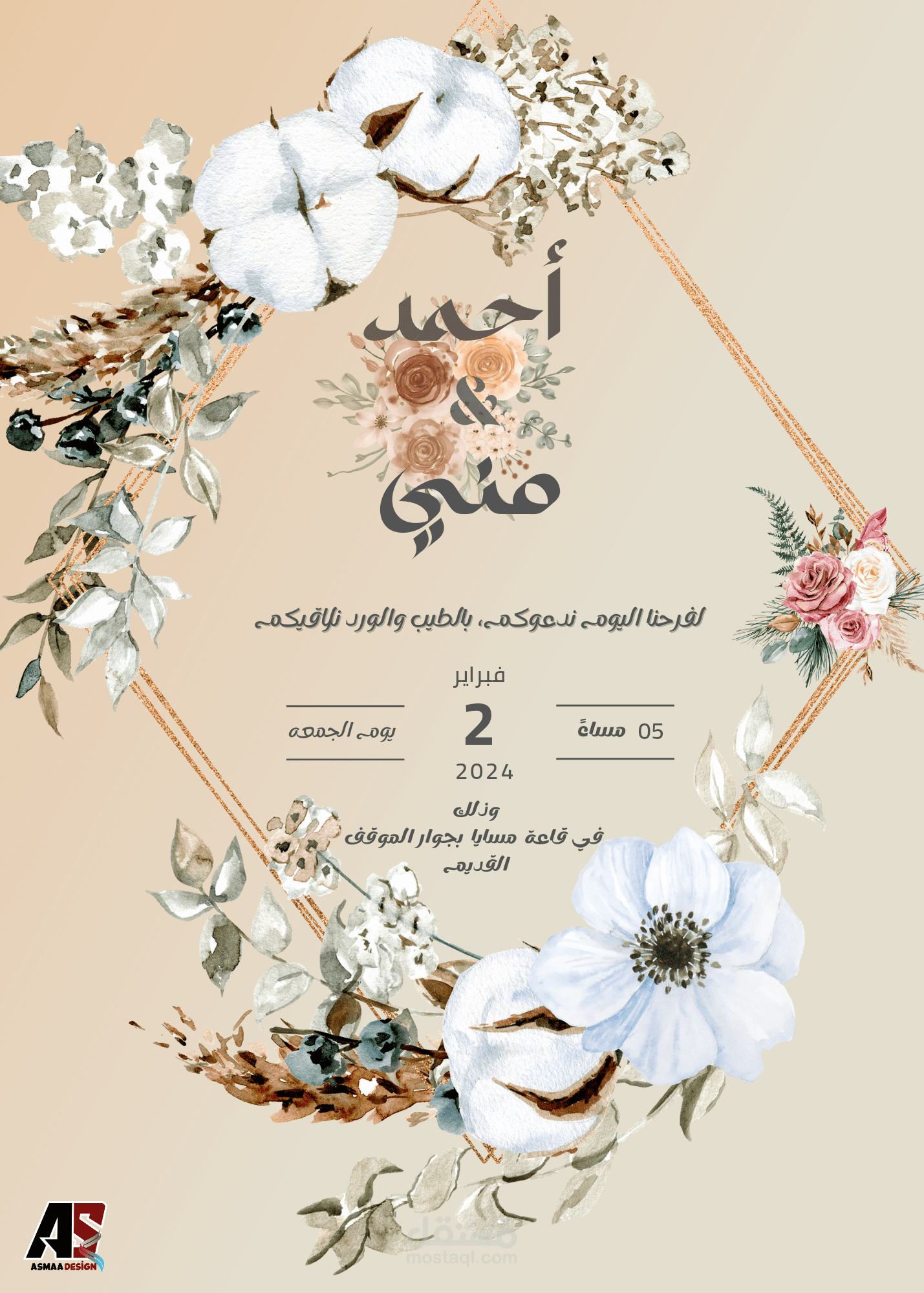 لقد قمت بعمل دعوة فرح وكانت الدعوة مقاسها ١٤٢٩×٢٠٠٠بيكسل وهي صورة PNG ولقد استخدمت الالوان الهادئه مع بعض باقة من الورود وكانت الالوان المستخدمه الابيض والبينك والمينىت جرين مع لون الخلفيه وهو البيج مما ادي الي تناسق ف الالوان