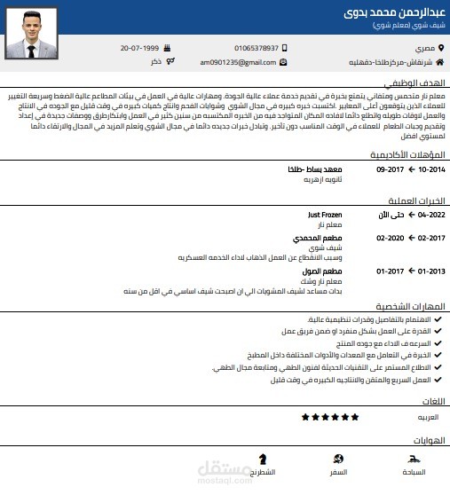 cv احترافي قمت بعمله بعد التواصل مع العميل ومعرفه اساسيات عمله والبيانات الخاصه به وتم بعدها تصميمه ليكون موافيا لكل الاعمال والمهارات التي يقوم بها