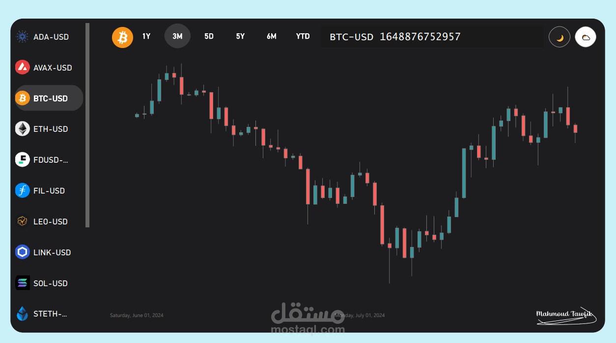 - Cryptocurrency List: A vertical list of different cryptocurrencies (e.g., BTC-USD, ETH-USD, AVAX-USD, LINK-USD) allows you to select and view specific market data for each.