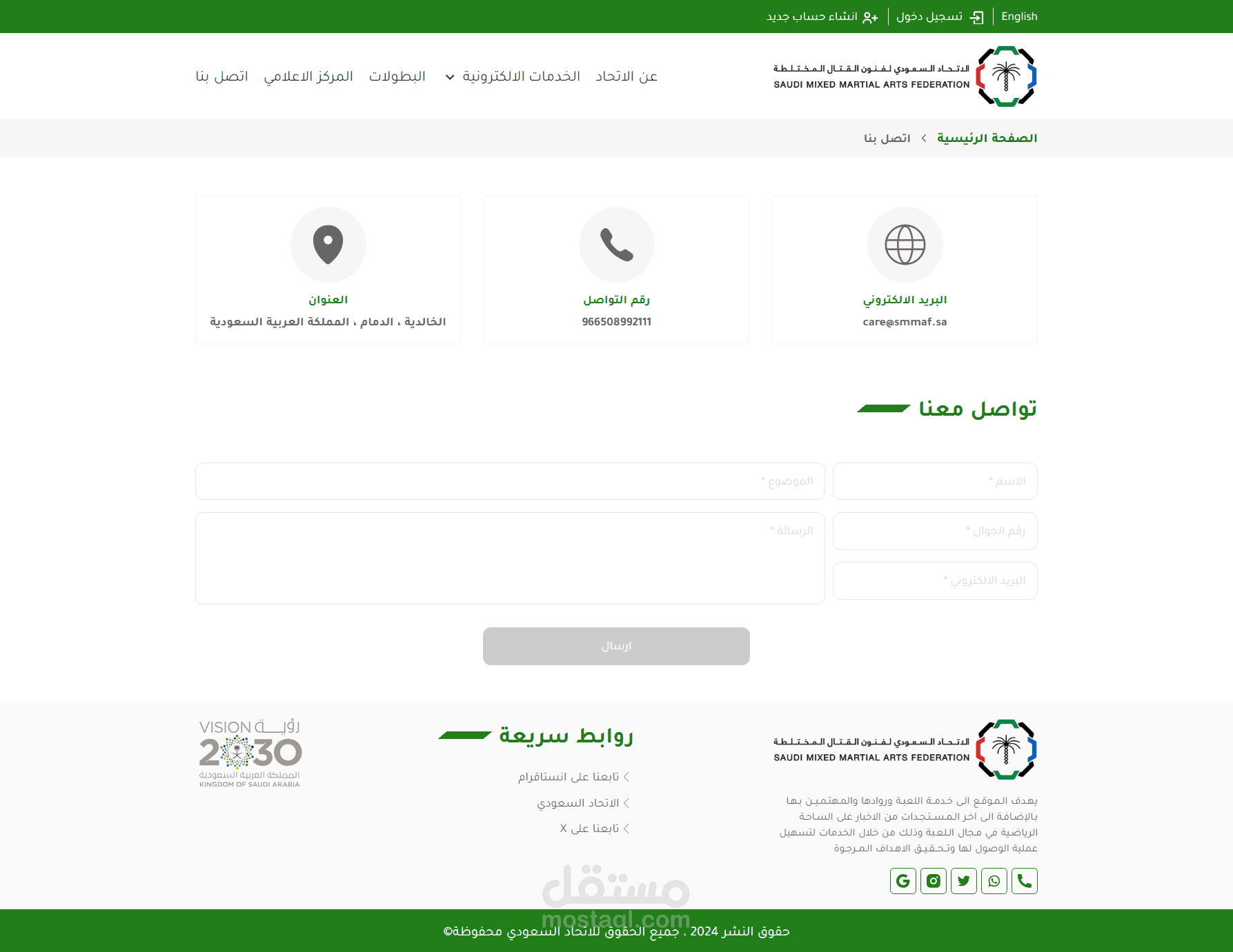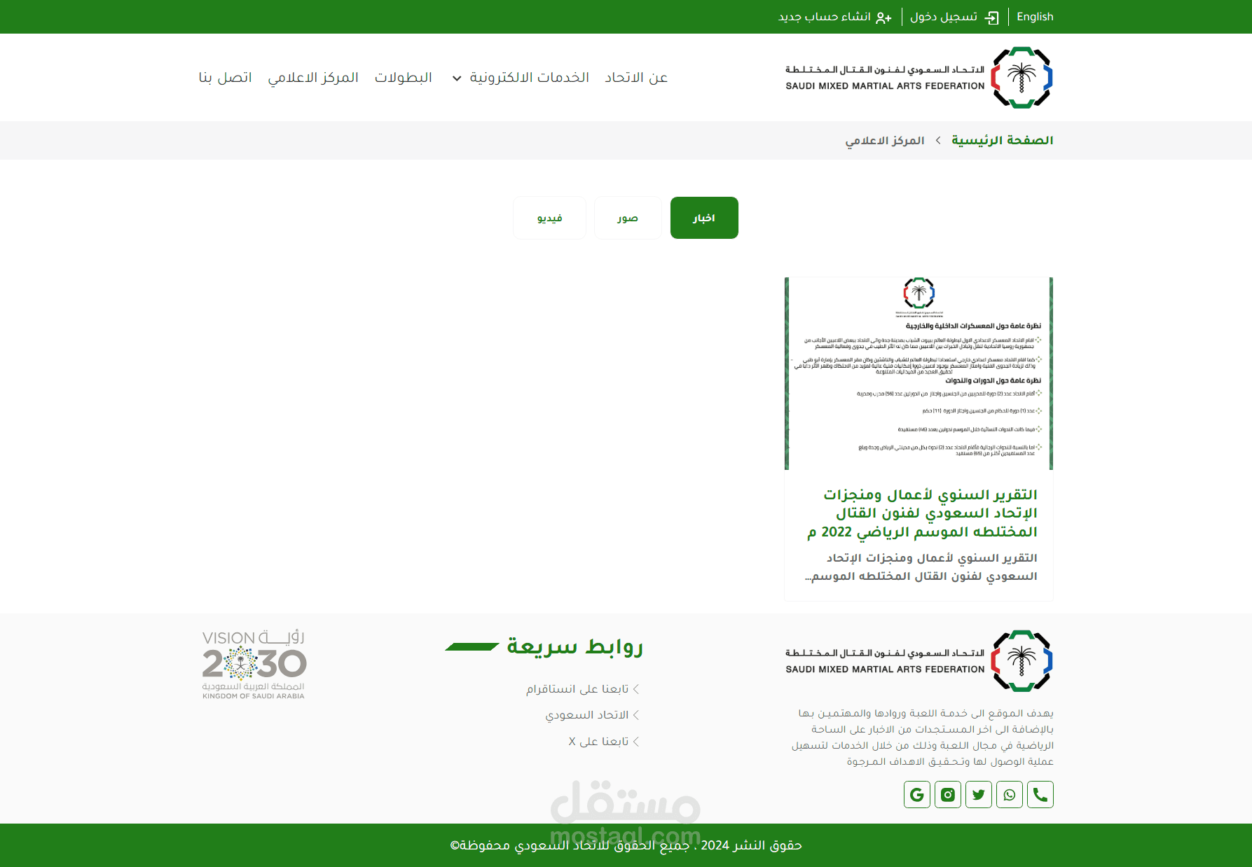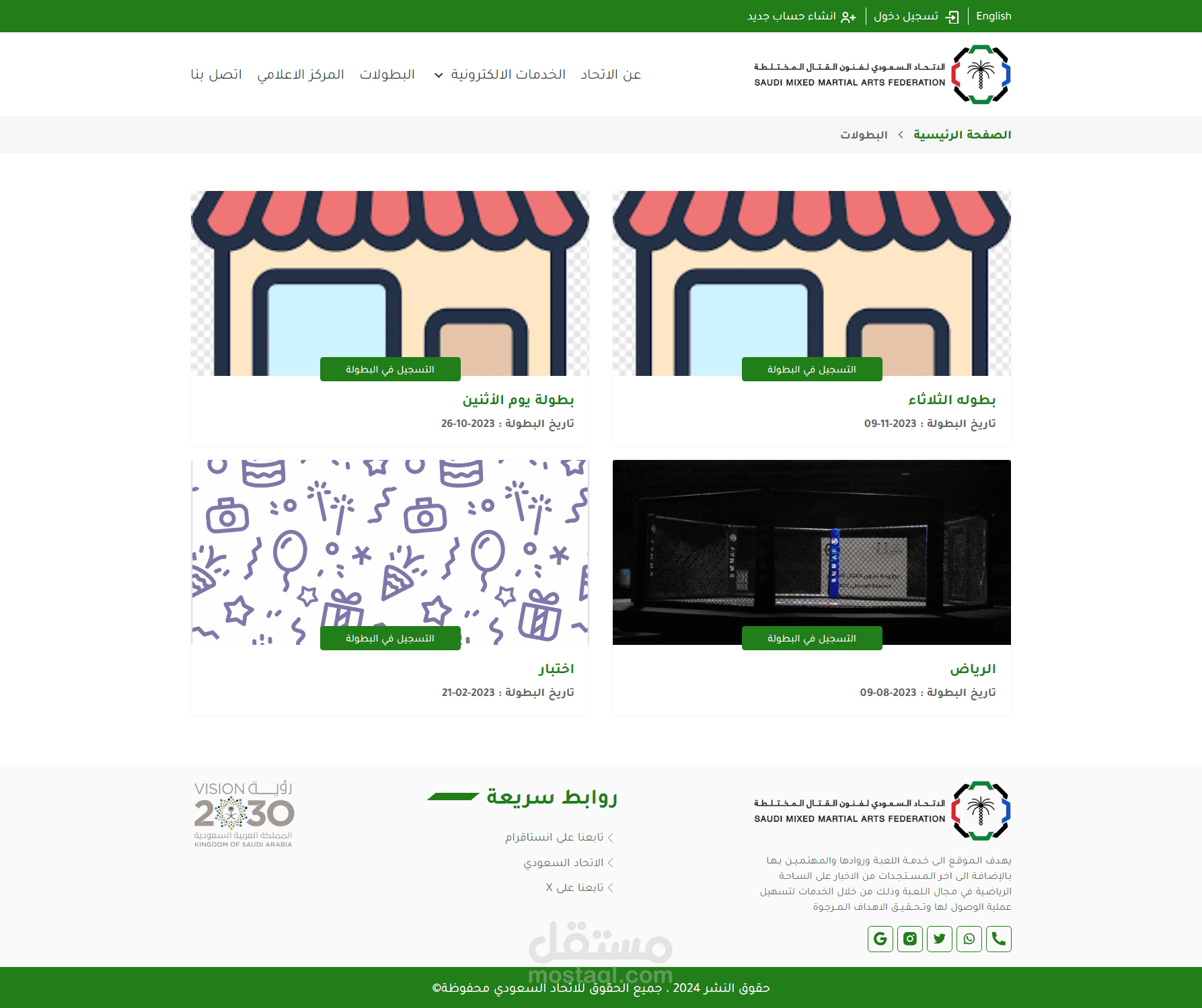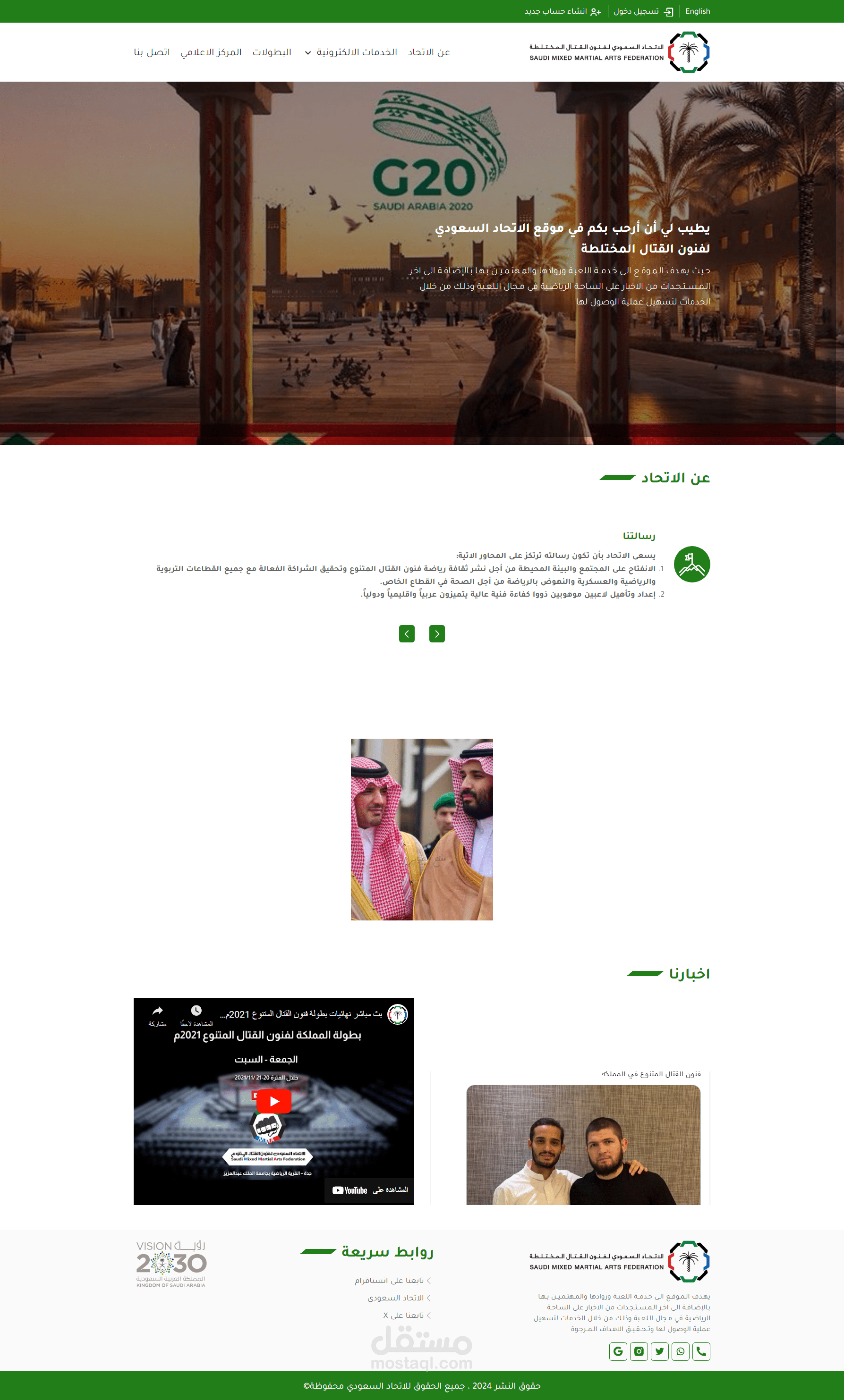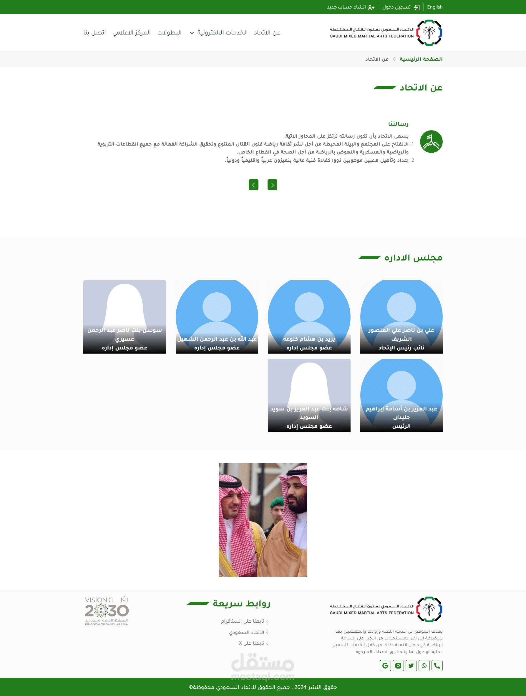 يتضمن الموضع التعريفي على عدة صفحات وهي "الرئيسية" وتتضمن على: (هيدر للشعار وحسابات التواصل الاجتماعي) وليسته بالصفحات الاخرى المتبقية. "عن الاتحاد" وتتضمن على : (صور ونصوص)، "الخدمات الإلكترونية" وتتضمن على (المتجر + العضويات)، "البطولات" وهي صفحة تتضمن على عرض قائمة البطولات (اسم البطولة، تاريخ بدء البطولة، صورة البطورة، وزر للتسجيل في البطولة *التسجيل للاشخاص المشتركين في الاتحاد فقط* "المركز الإعلامي" ويتضمن على (صور ونصوص). "اتصل بنا" ويتضمن على فورم للتواصل(الاسم، البريد، رقم الجوال، وفورم الرسالة وفي اسفل الصفحة بيانات التواصل + بيانات التواصل الاجتماعي.) ، اللغة (لتغيير اللغة من العربي للإنجليزية) اللغة الأساسية للموقع هي العربية.