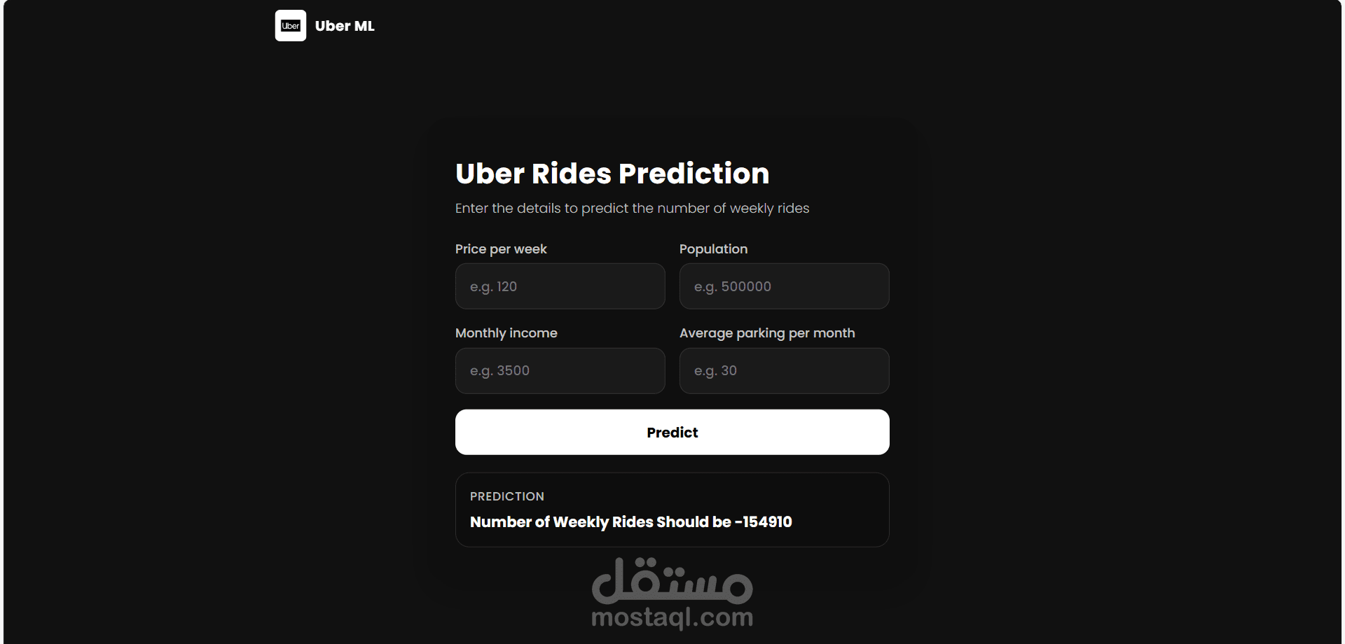 قمت بتطوير مشروع Uber Rides Prediction، وهو تطبيق ويب متكامل لتوقع عدد الرحلات الأسبوعية لـ Uber بناءً على بيانات بسيطة، مع واجهة مستخدم مستوحاة من تطبيق Uber.