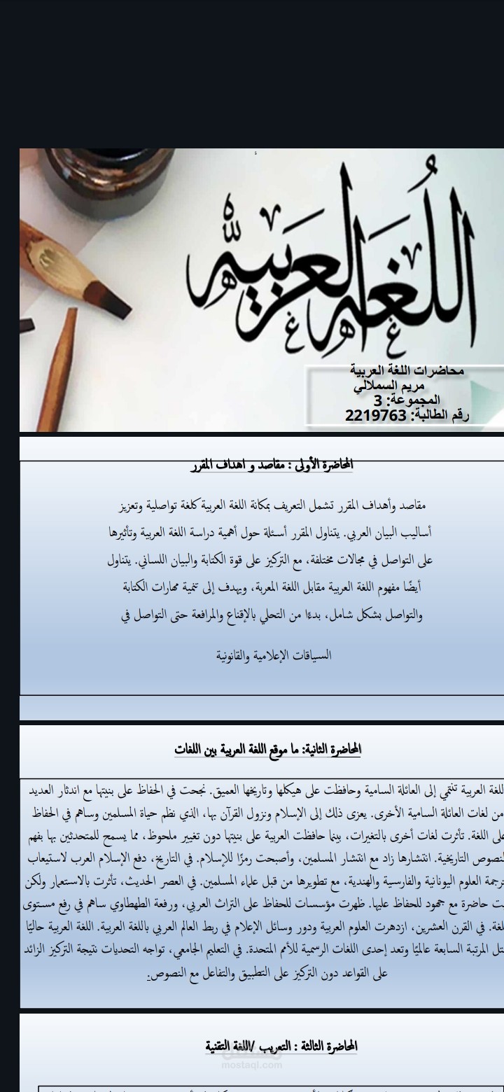 تقرير المحاضرات في مادة اللغة العربية هو وثيقة تلخص محتوى وملاحظات المحاضرات التي تم تقديمها خلال الفترة الزمنية المحددة. يهدف التقرير إلى توثيق وتلخيص المفاهيم والمعلومات الأساسية التي تم تناولها في المحاضرات، وإعطاء لمحة شاملة عن الموضوعات المطروحة والنقاط الرئيسية التي تم تسليط الضوء عليها.