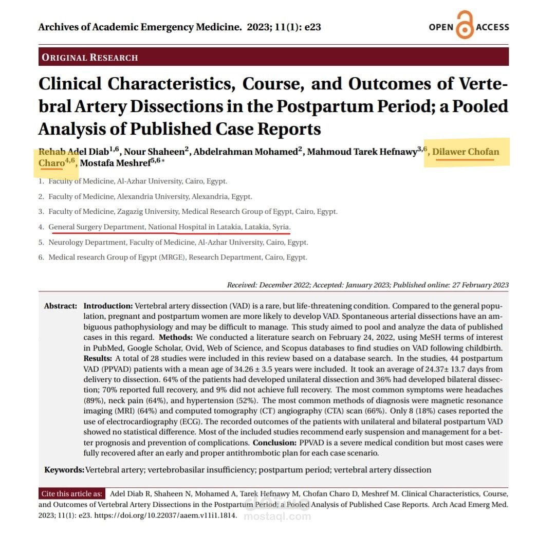 I have c-authored of a systematic review & meta-analysis research paper under the title: Clinical Characteristics, Course, and Outcomes of Vertebral Artery Dissections in the Postpartum Period; a Pooled Analysis of Published Case Reports " published in the Archives of Academic Emergency Medicine". 2023