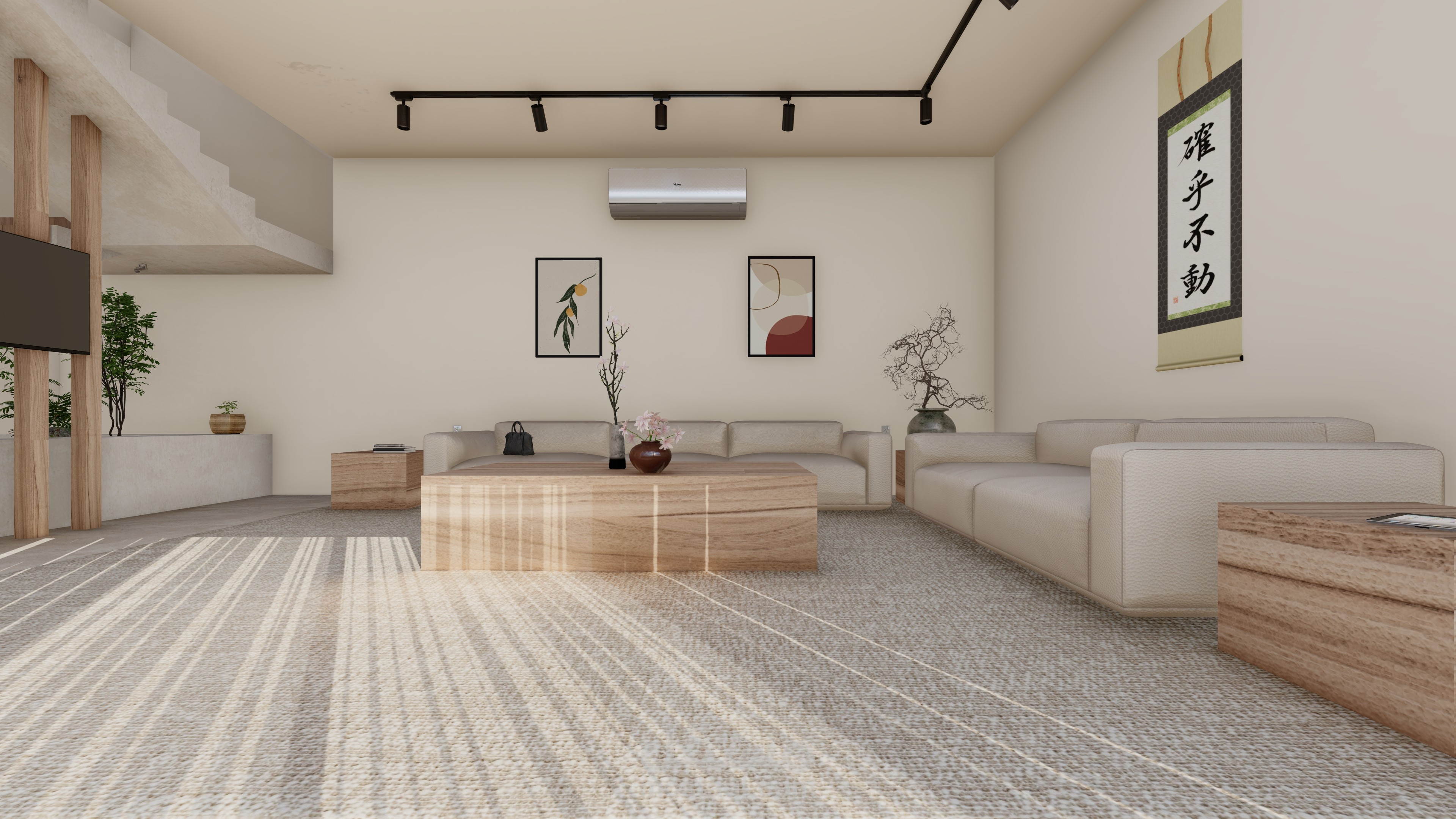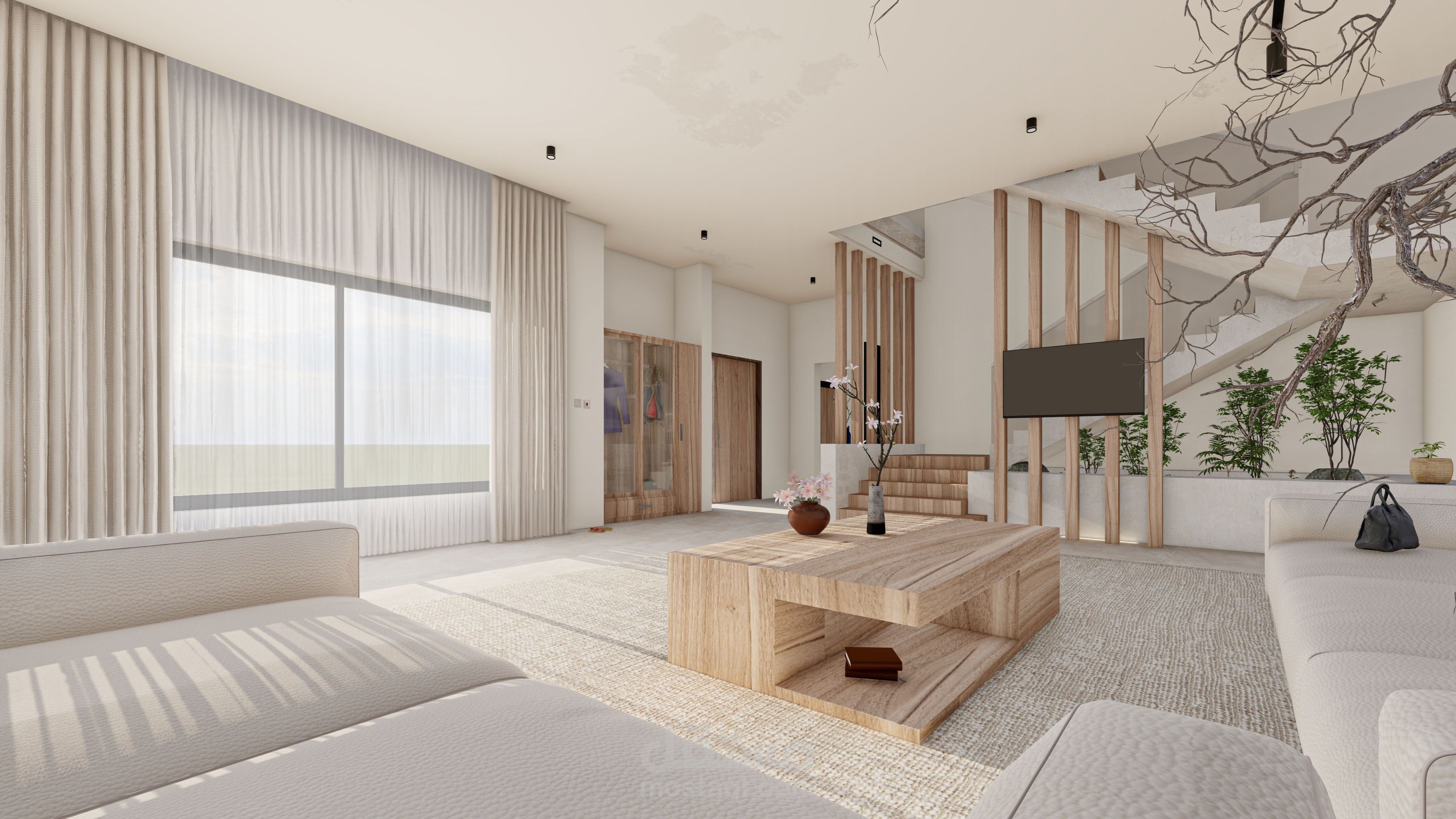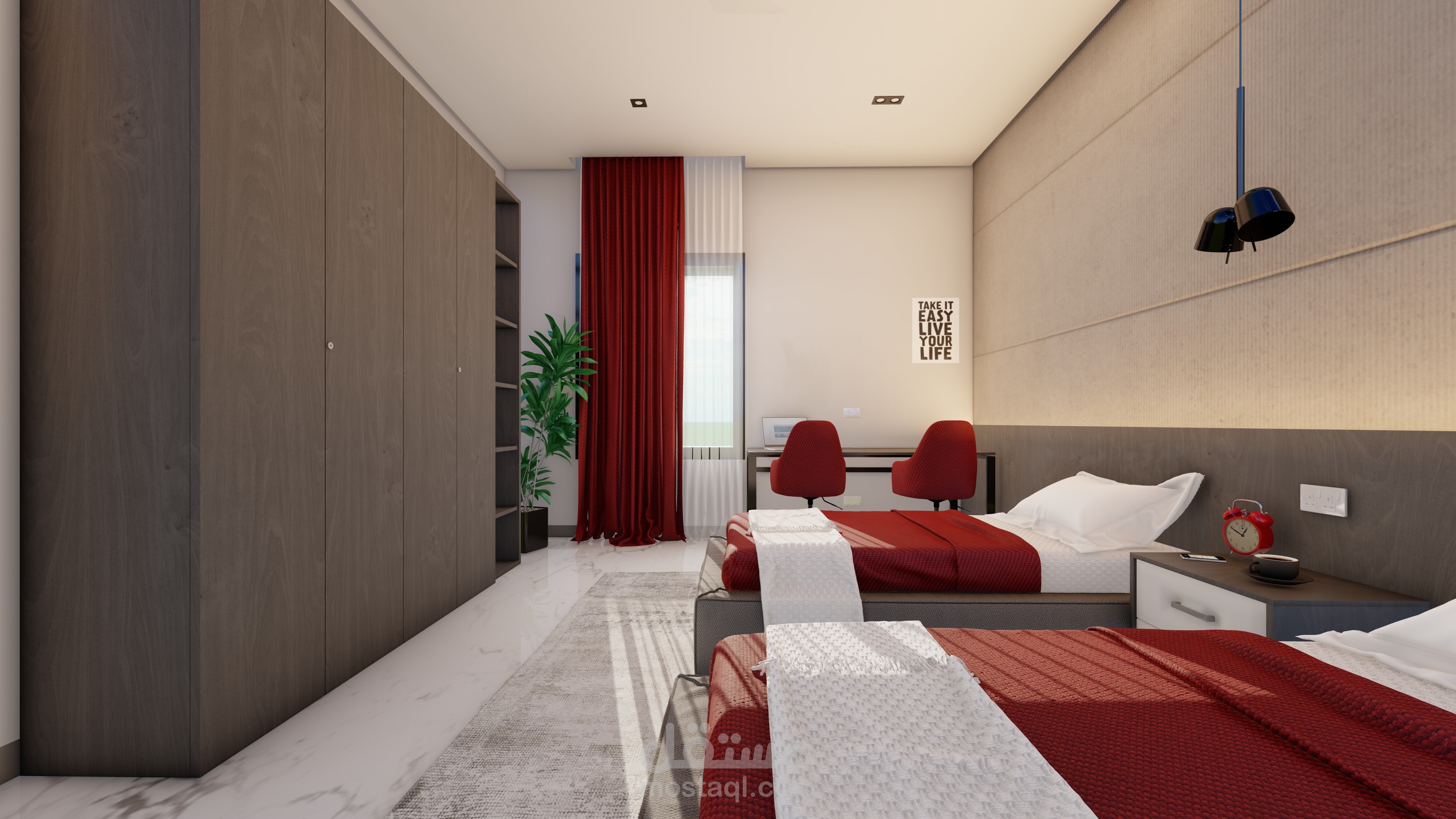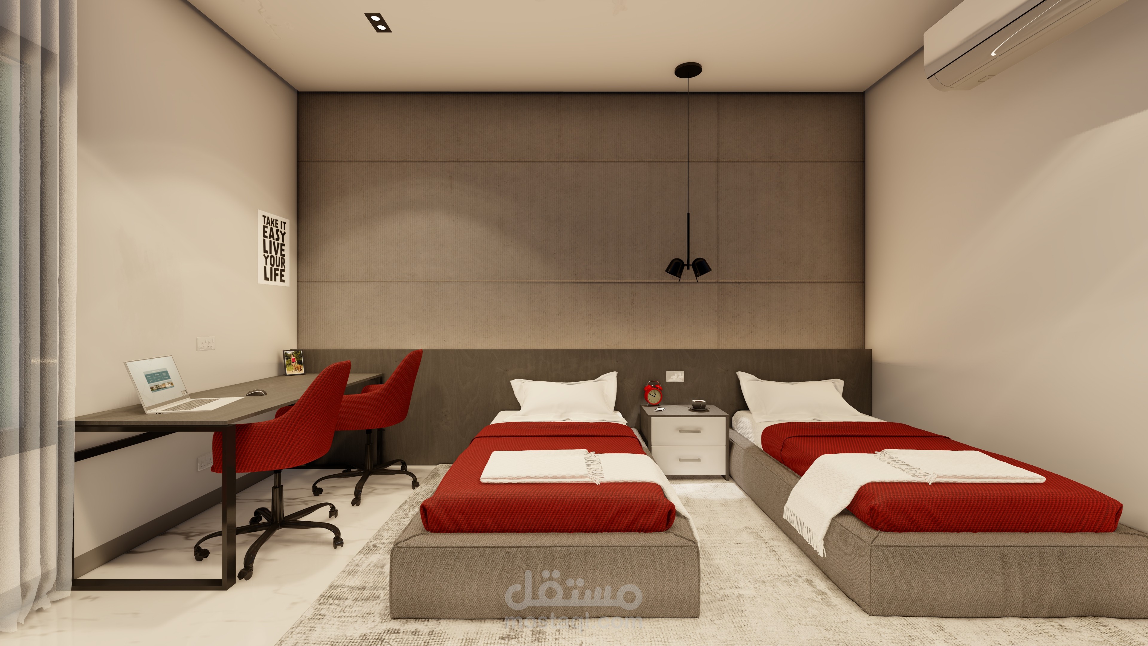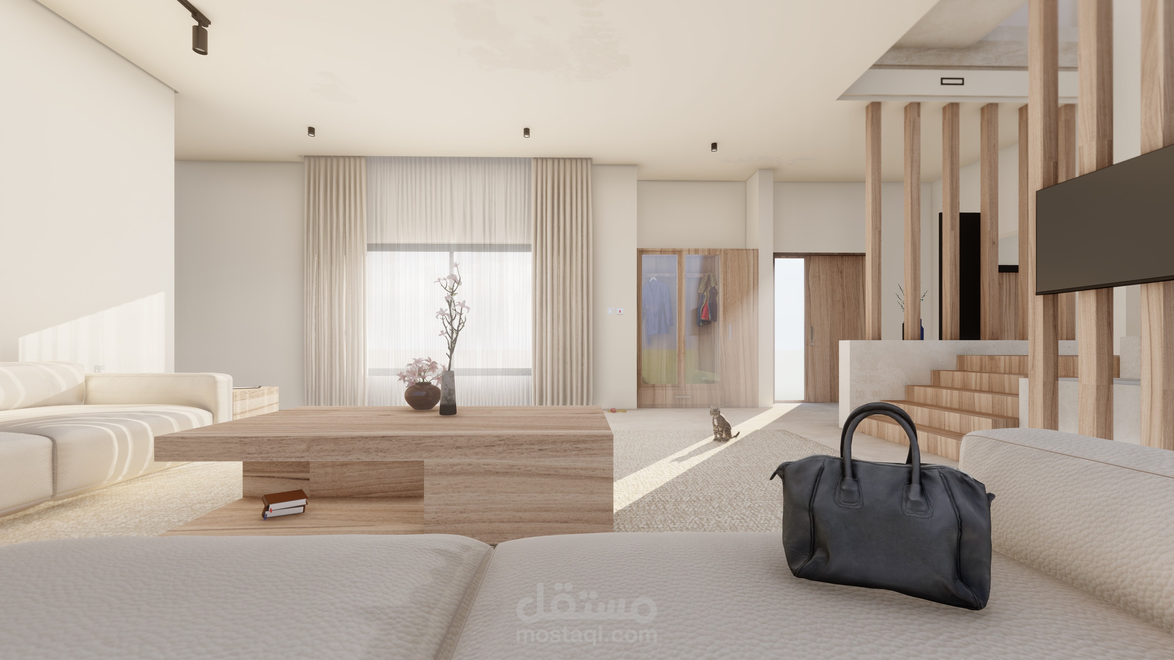 مشروعين مختلفين، تصميم داخل لغرفة نوم بطابع عصري فندقي، وتصميم صالة بسيط مستوحى من الأسلوب الياباني.