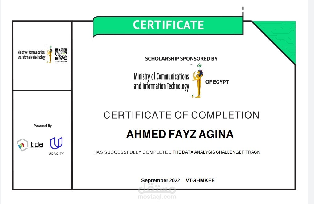 حصلت علي شهادة udacity fwd لتحليل البيانات وعرضها علي هيئه رسومات تم التطبيق علي مجموعه كامله من المشاريع داخل الموقع