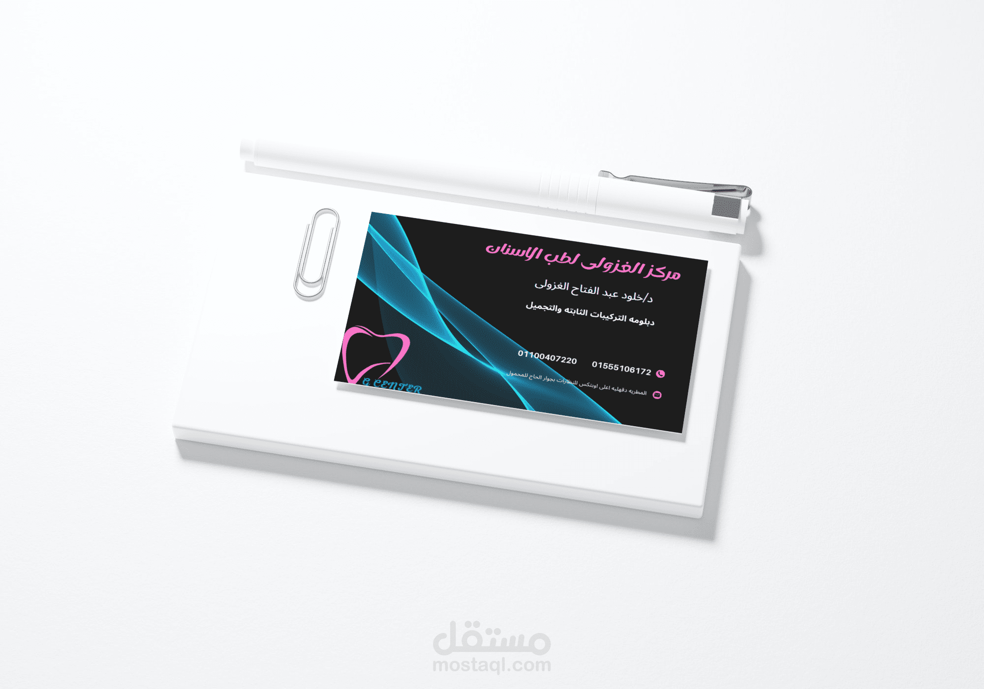 بطاقه عمل لطبيبه اسنان تم اختيار اللون الاسود الجذاب مع لوجو بسيط