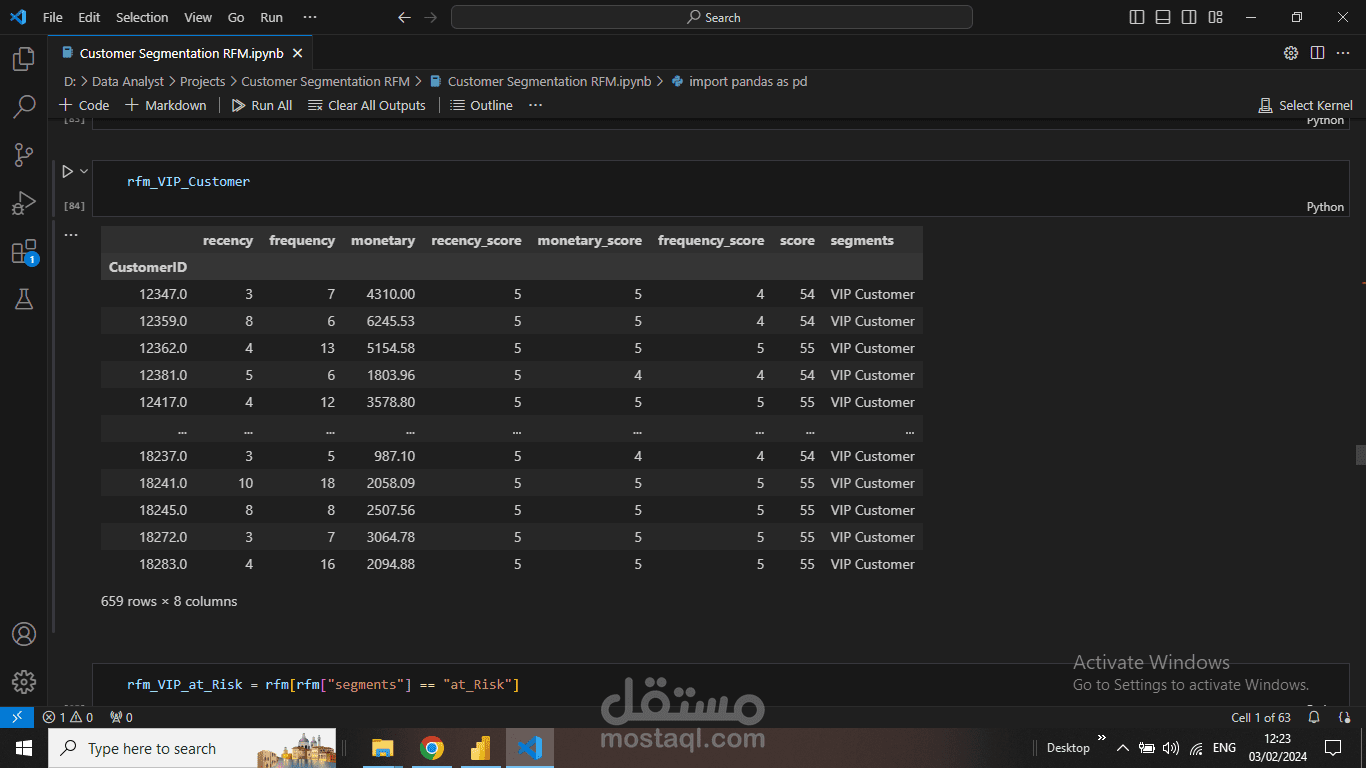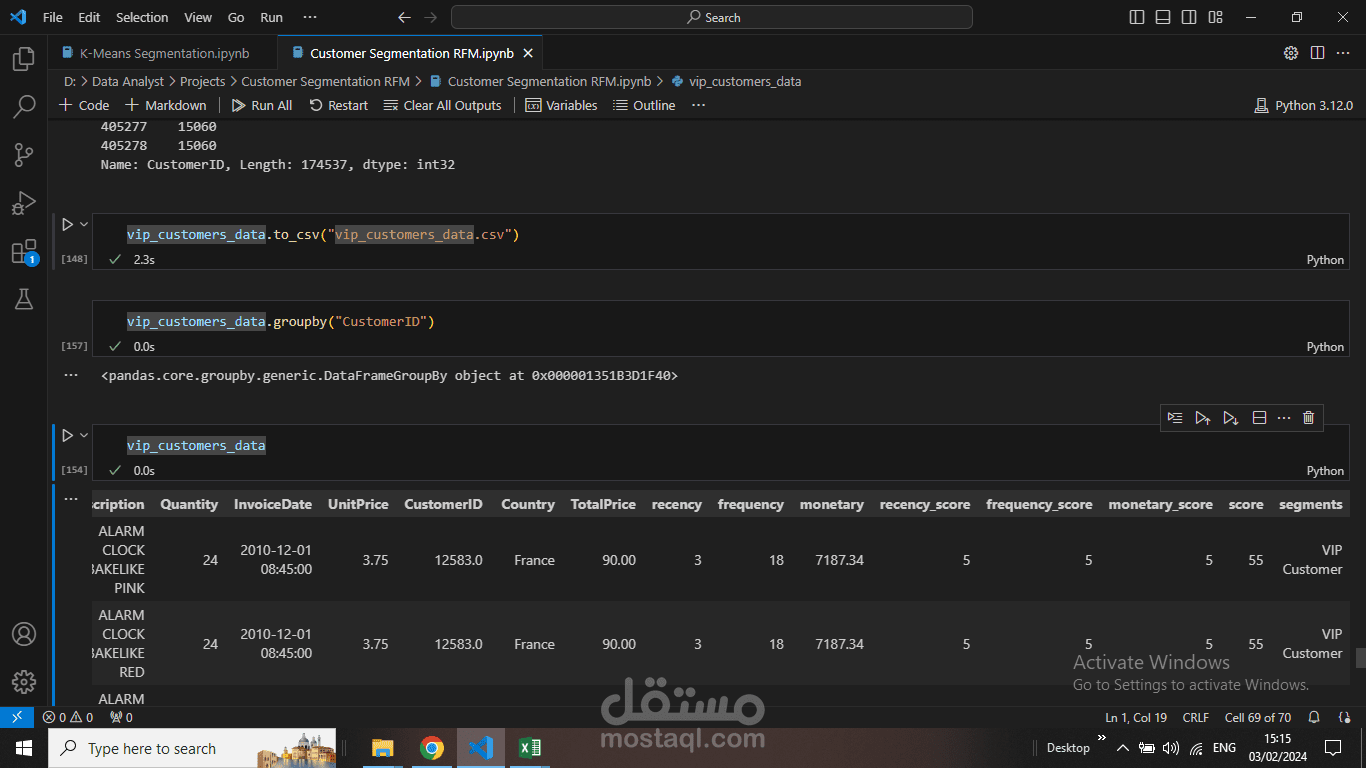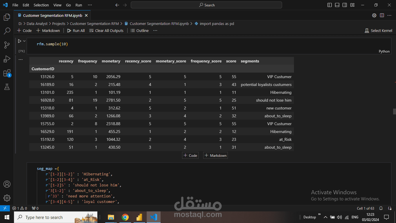 تم تقسيم العملاء عن طريق استراتيجة RFM باستخدام python For data analysis و استخراج بيانات كل شريحة حسب القوة الشرائية وتسليم ال Final