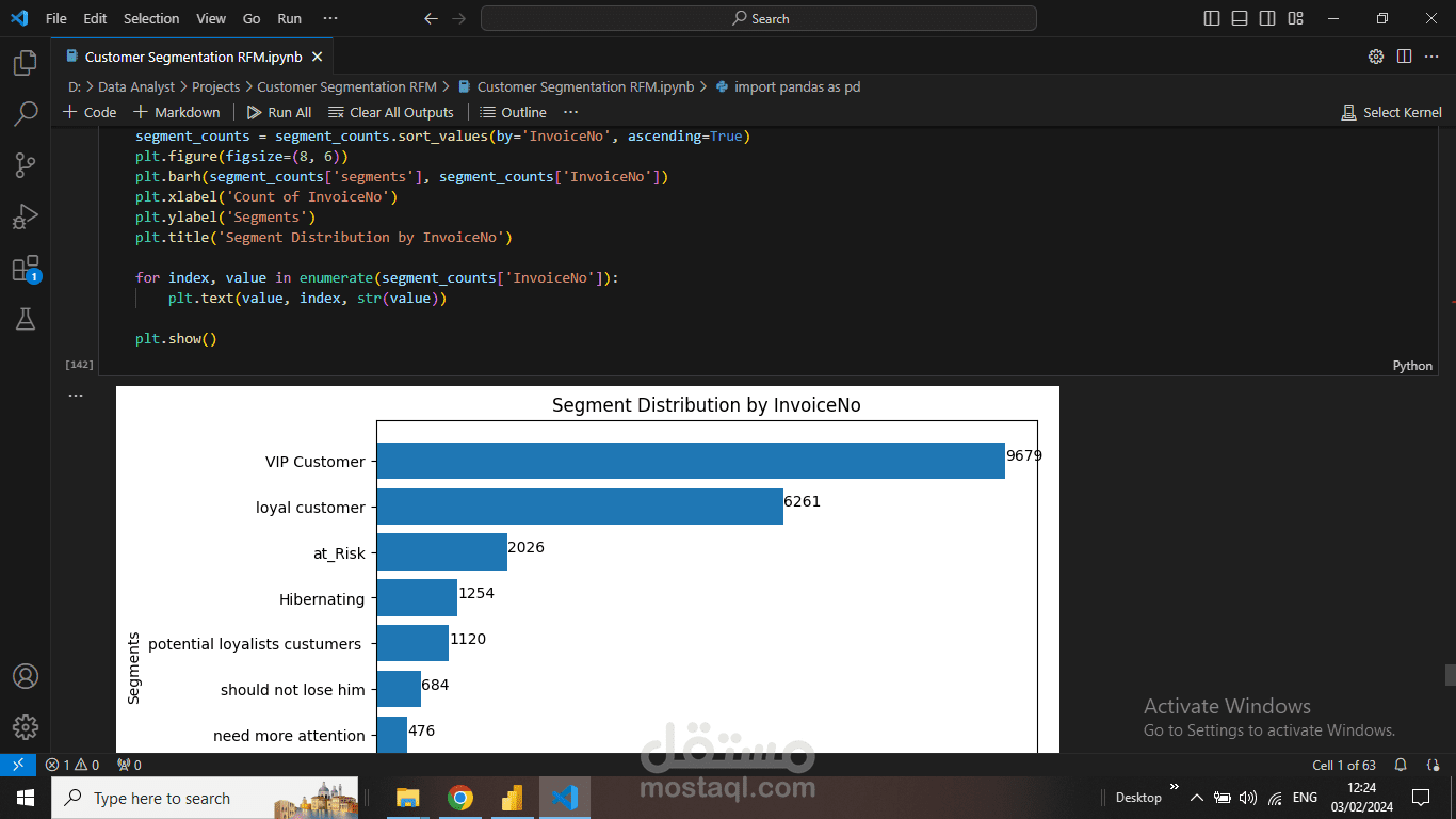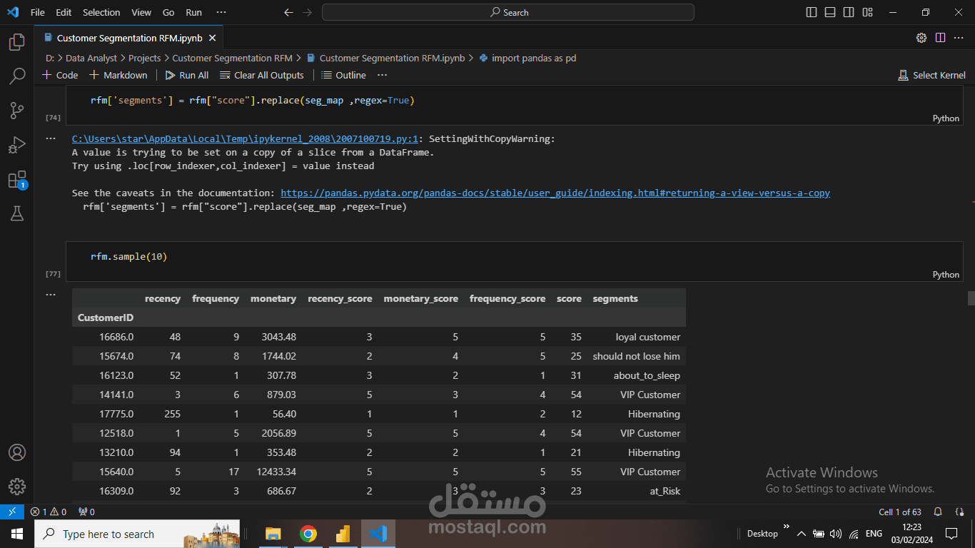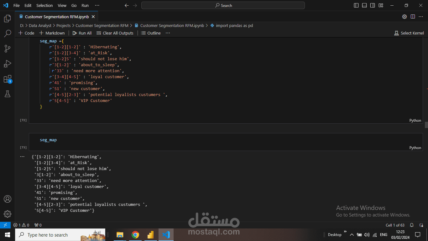 تم تقسيم العملاء عن طريق استراتيجة RFM باستخدام python For data analysis و استخراج بيانات كل شريحة حسب القوة الشرائية وتسليم ال Final