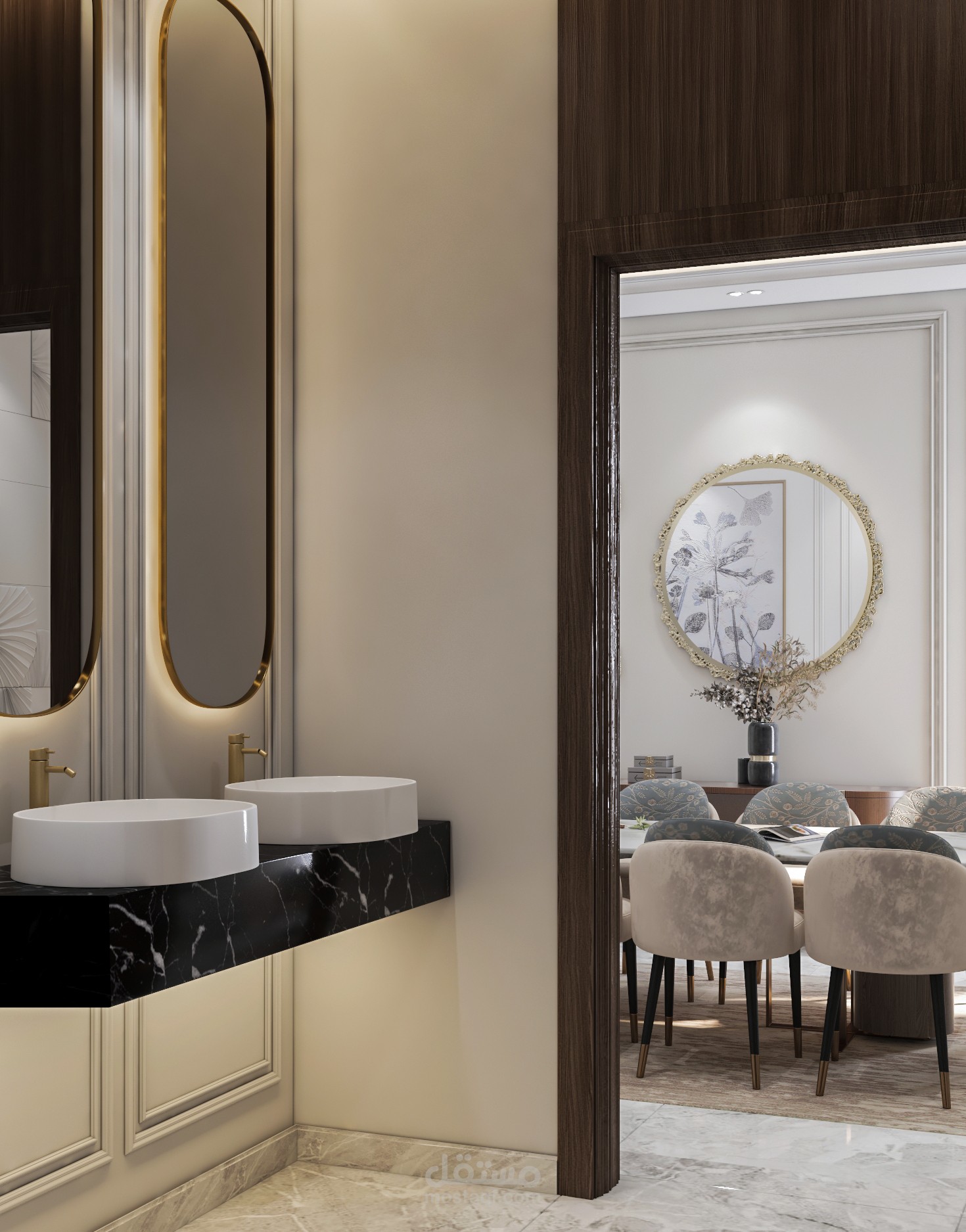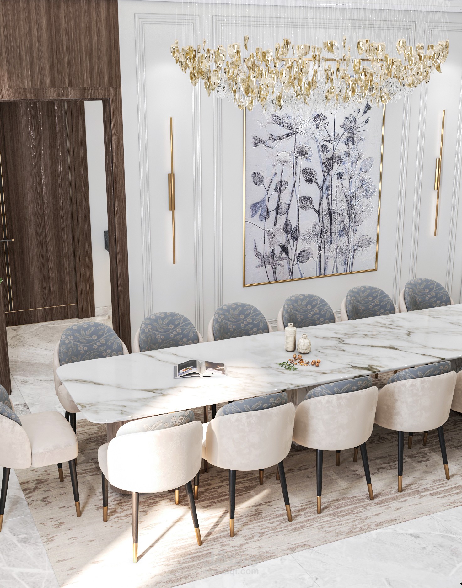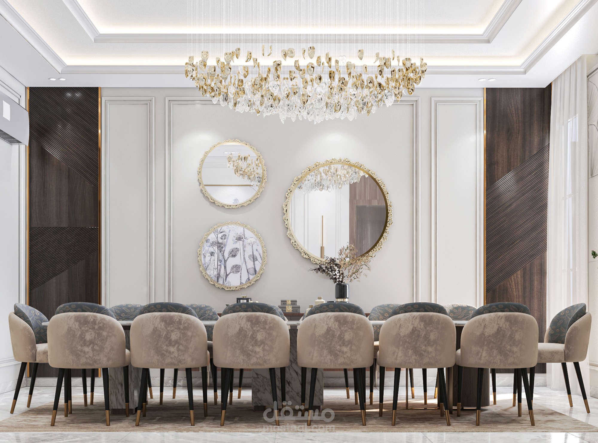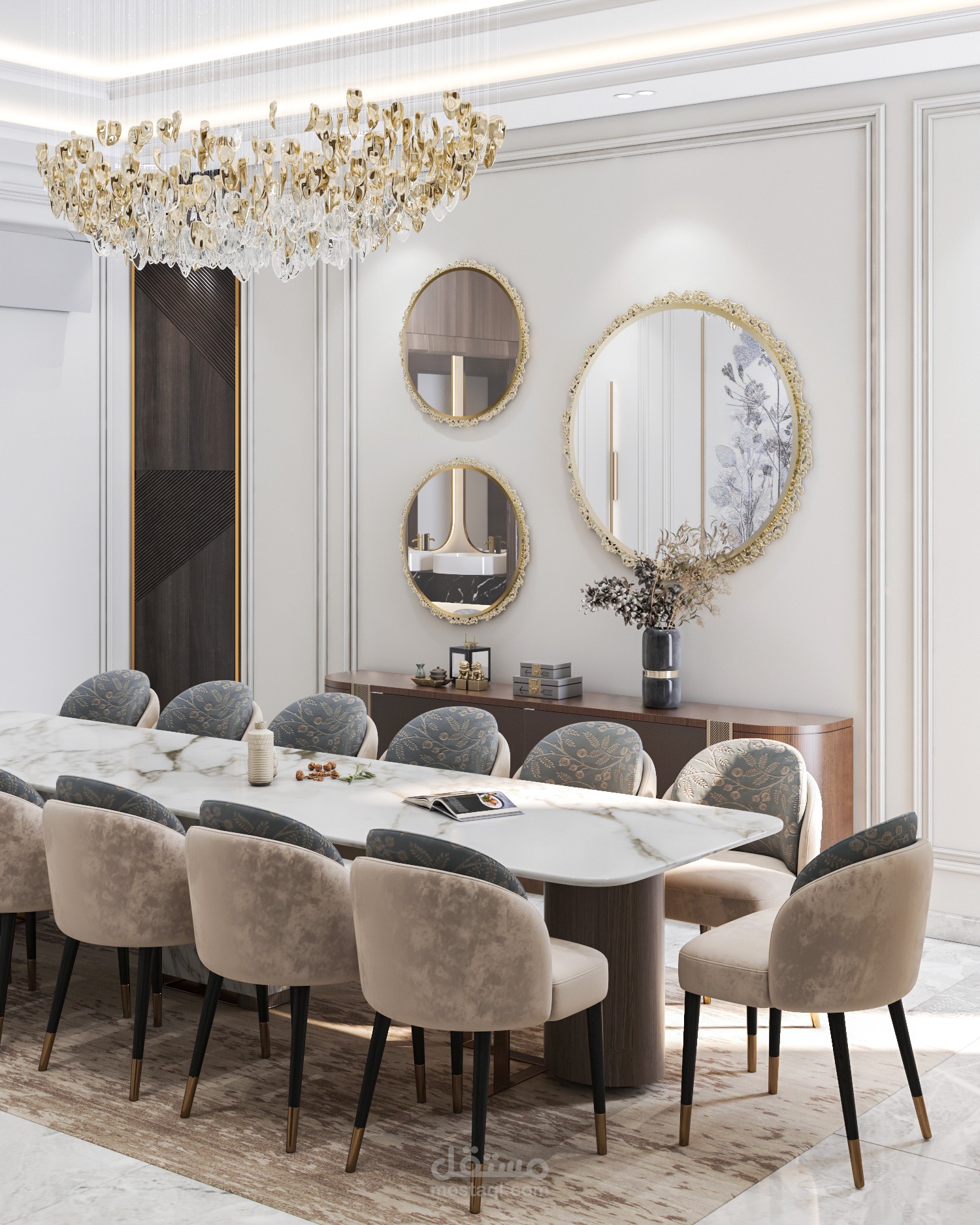 تصميم نيو كلاسيك مع لمسات موديرن لغرفة طعام بفيلا بالسعودية
