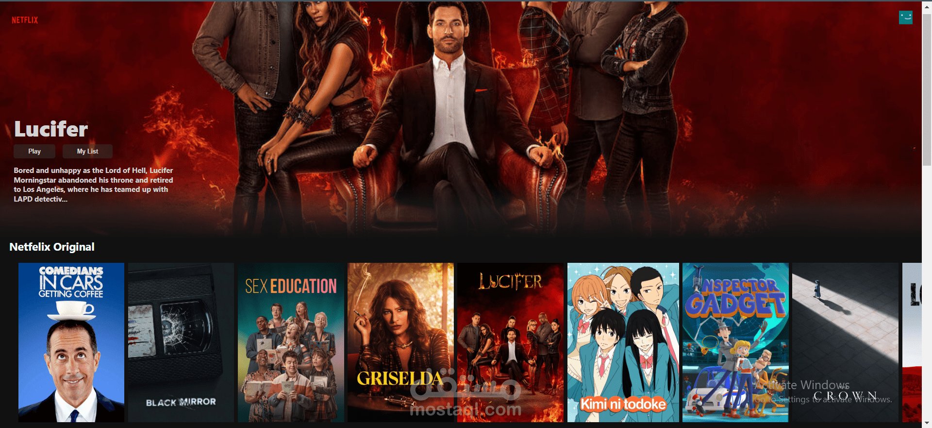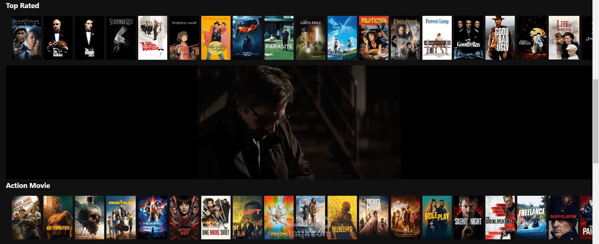 Then, the movies are displayed according to their categorization, with rows resembling Netflix's layout. The largest row represents Netflix's featured products.