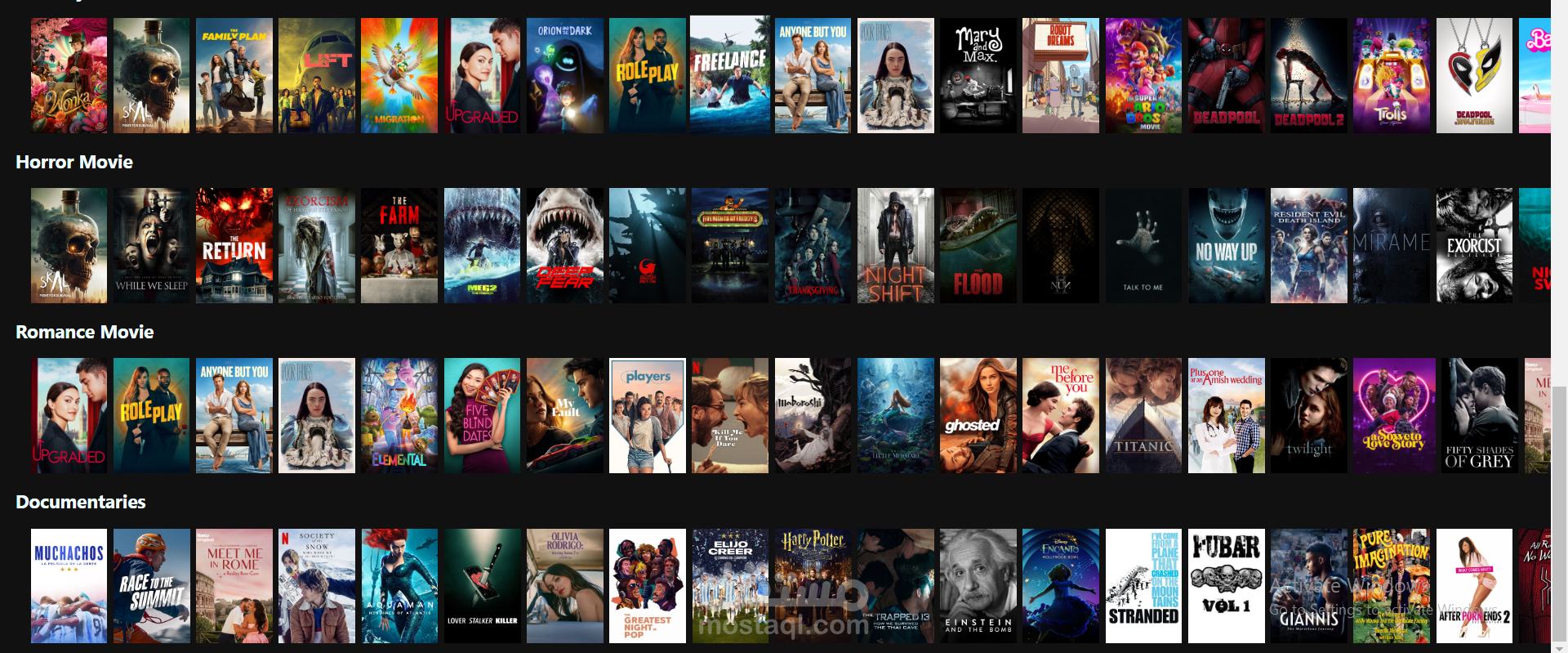 مجرد Clone لعرض الافلام مثل Netflix حيث يتم عرض بانر عشوائي في كل مره يتم تحميل الموقع او فتحه ولهذا البانر ناف بار متحرك يتحول للون الاسود بعد ارتفاع 100px
