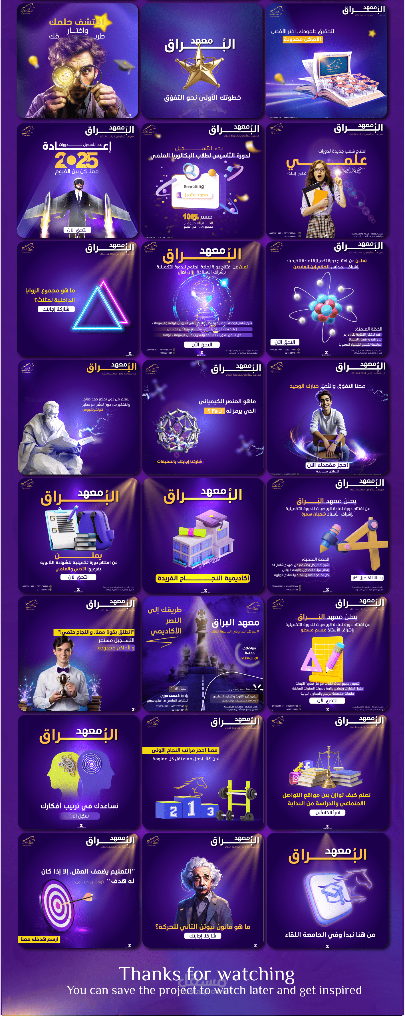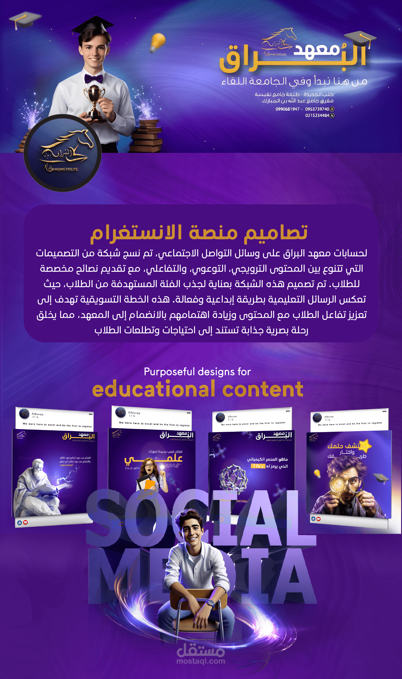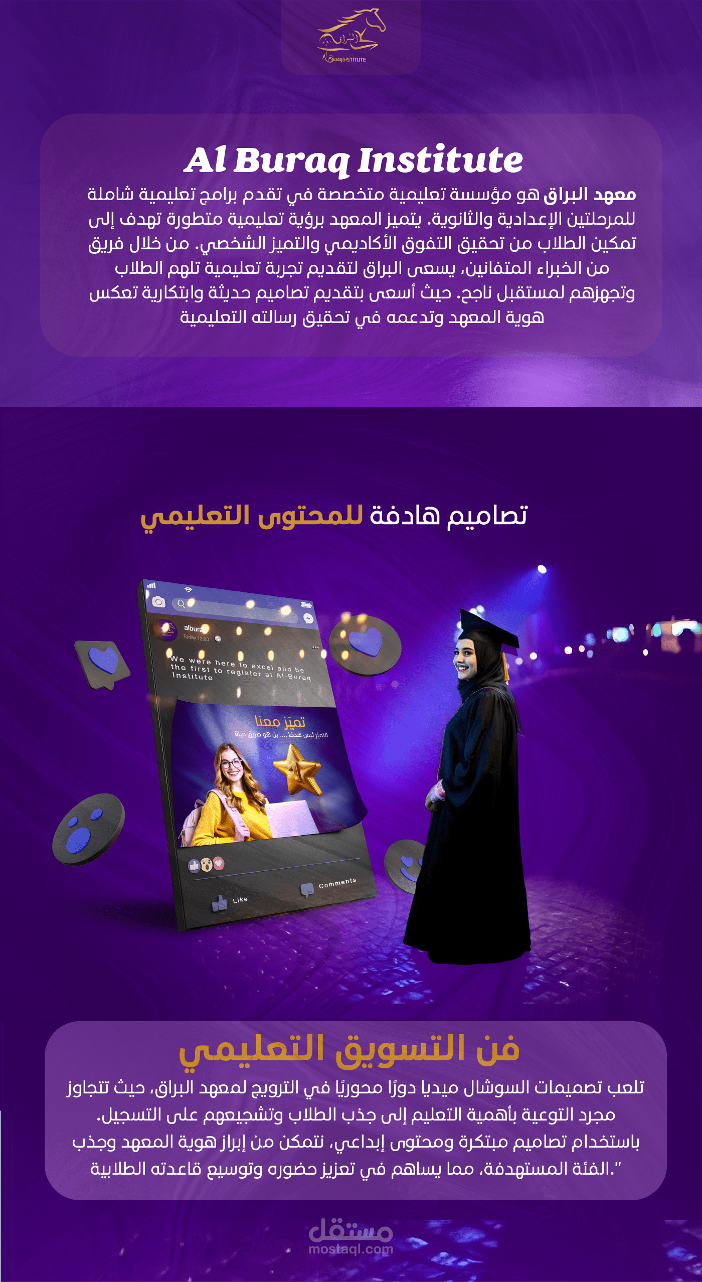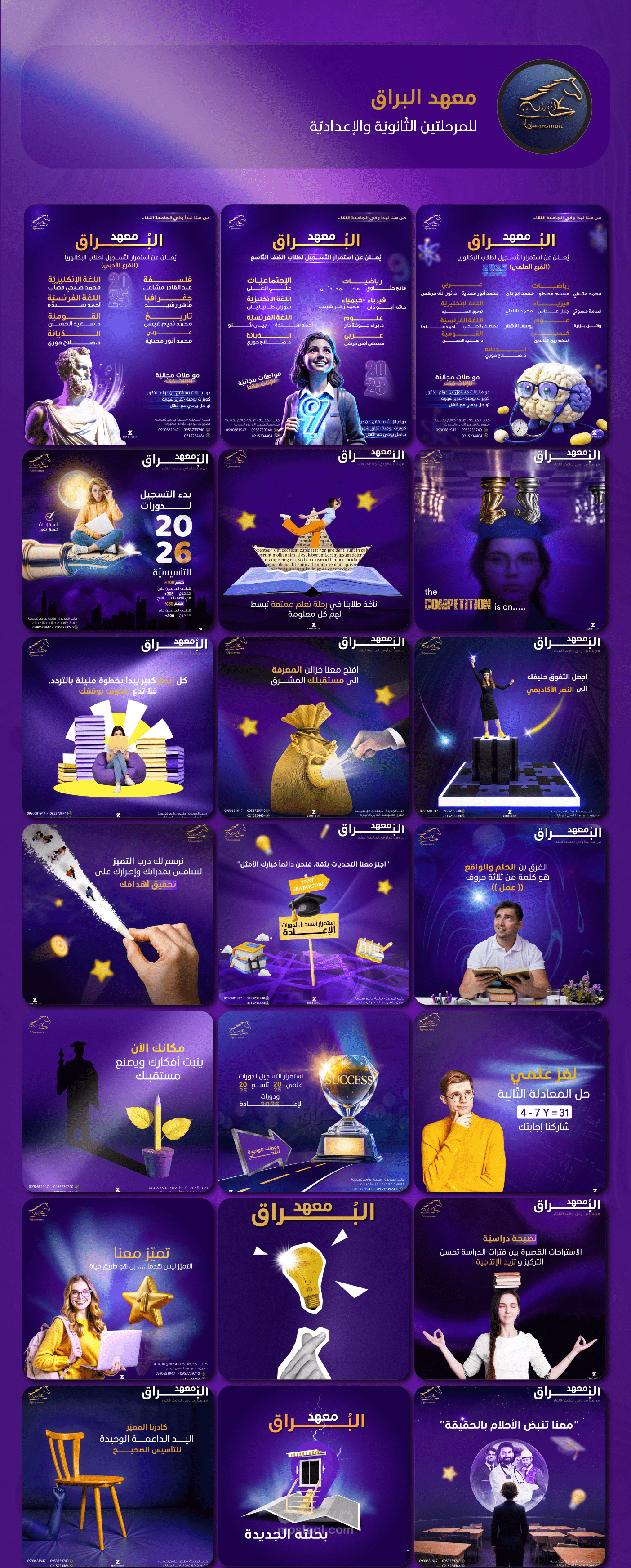 "تم تطوير خطة تسويقية متكاملة لحسابات معهد البراق على السوشال ميديا، حيث تم تصميم سلسلة من المحتويات التي تتنوع بين الترويج للمعهد، التوعية الأكاديمية، والتفاعل مع الطلاب من خلال نصائح وإرشادات تعليمية. هذه الشبكة من التصميمات تم بناؤها بعناية لاستهداف الطلاب بشكل مباشر وجذب انتباههم بطرق مبتكرة. الخطة تهدف إلى تعزيز التواصل مع الطلاب وتقديم المعهد كخيار تعليمي رائد من خلال محتوى إبداعي يلامس اهتماماتهم وأهدافهم التعليمية."