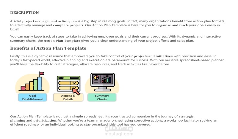 تعد خطة العمل القوية لإدارة المشروع خطوة كبيرة في تحقيق الأهداف. في الواقع، تستفيد العديد من المنظمات من تنسيقات خطط العمل لإدارة المشاريع وإكمالها بشكل فعال . قالب خطة العمل الخاص بنا موجود هنا لتتمكن من تنظيم أهدافك وتتبعها بسهولة في برنامج Excel!
