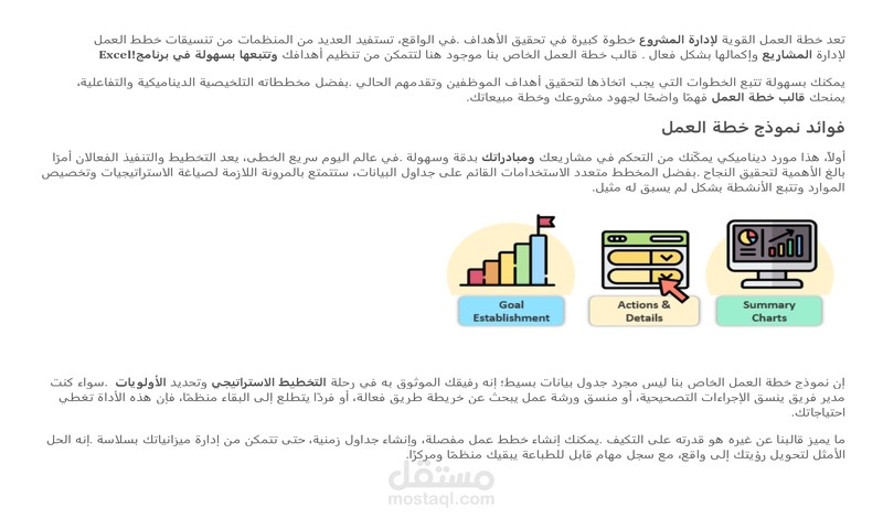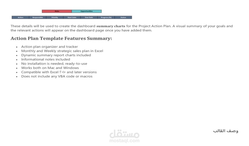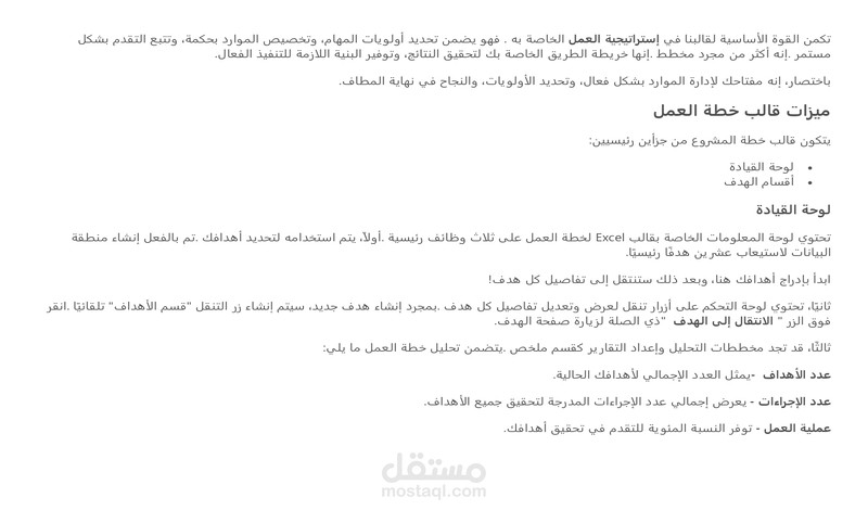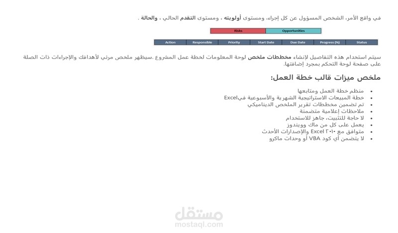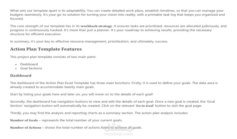 تكمن القوة الأساسية لقالبنا في إستراتيجية العمل الخاصة به . فهو يضمن تحديد أولويات المهام، وتخصيص الموارد بحكمة، وتتبع التقدم بشكل مستمر. إنه أكثر من مجرد مخطط. إنها خريطة الطريق الخاصة بك لتحقيق النتائج، وتوفير البنية اللازمة للتنفيذ الفعال.