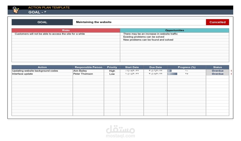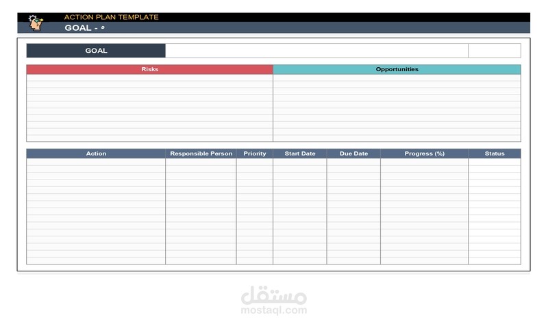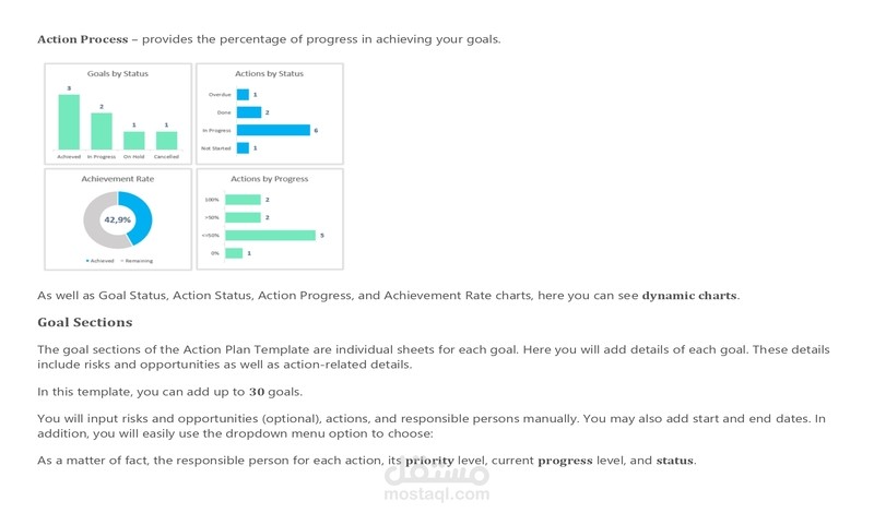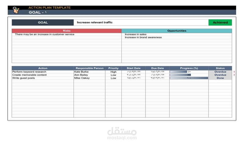 أقسام الأهداف في نموذج خطة العمل عبارة عن أوراق فردية لكل هدف. هنا ستضيف تفاصيل كل هدف. تتضمن هذه التفاصيل المخاطر والفرص بالإضافة إلى التفاصيل المتعلقة بالإجراء.