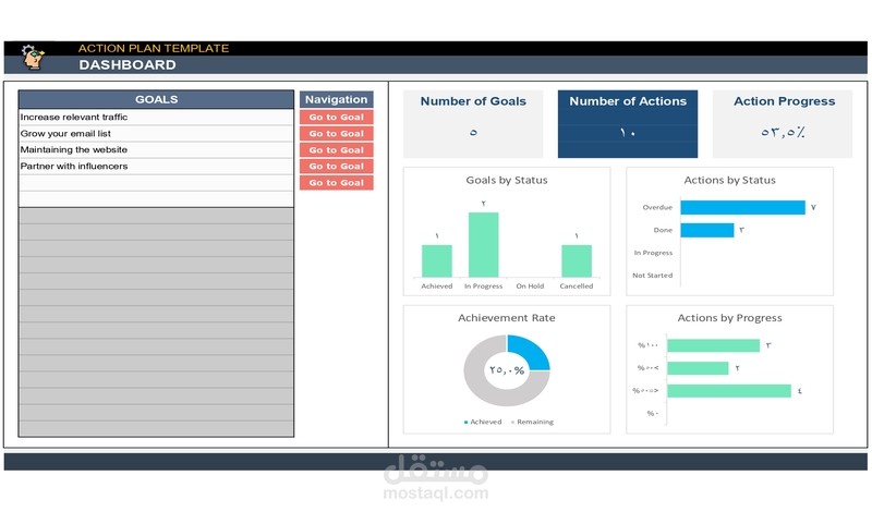 يمكنك بسهولة تتبع الخطوات التي يجب اتخاذها لتحقيق أهداف الموظفين وتقدمهم الحالي. بفضل مخططاته التلخيصية الديناميكية والتفاعلية، يمنحك قالب خطة العمل فهمًا واضحًا لجهود مشروعك وخطة مبيعاتك.