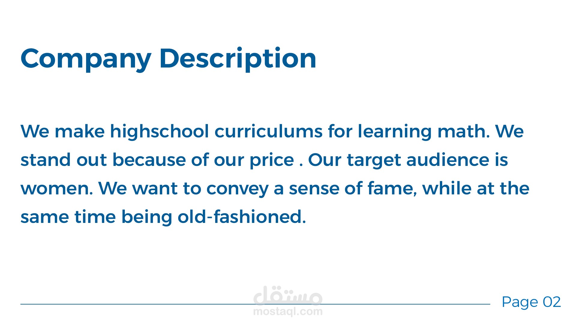 We make highschool curriculums for learning math. We stand out because of our price. Our target audience is women. We want to convey a sense of fame, while at the same time being old-fashioned.