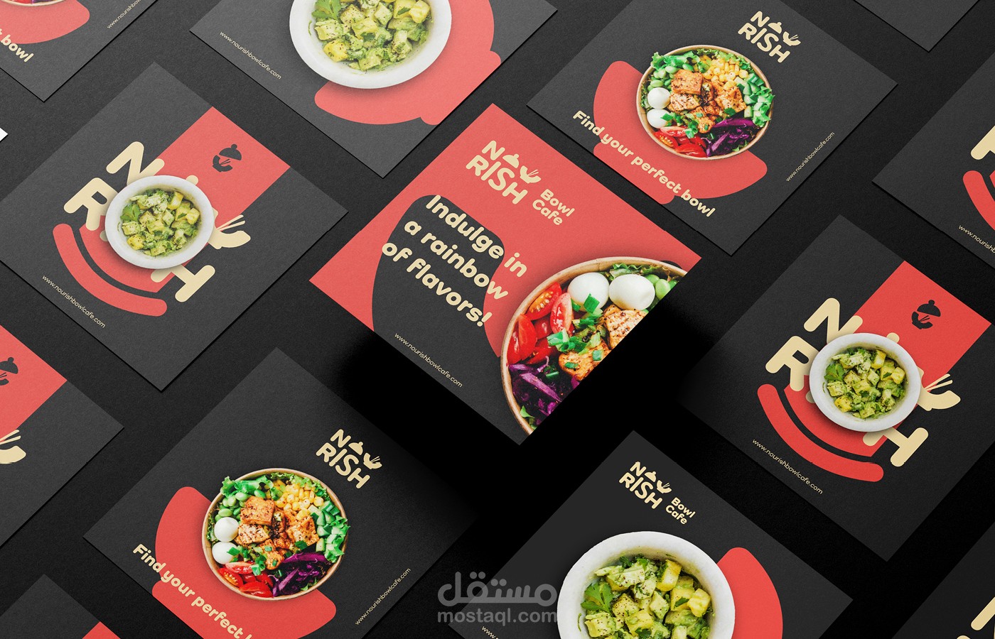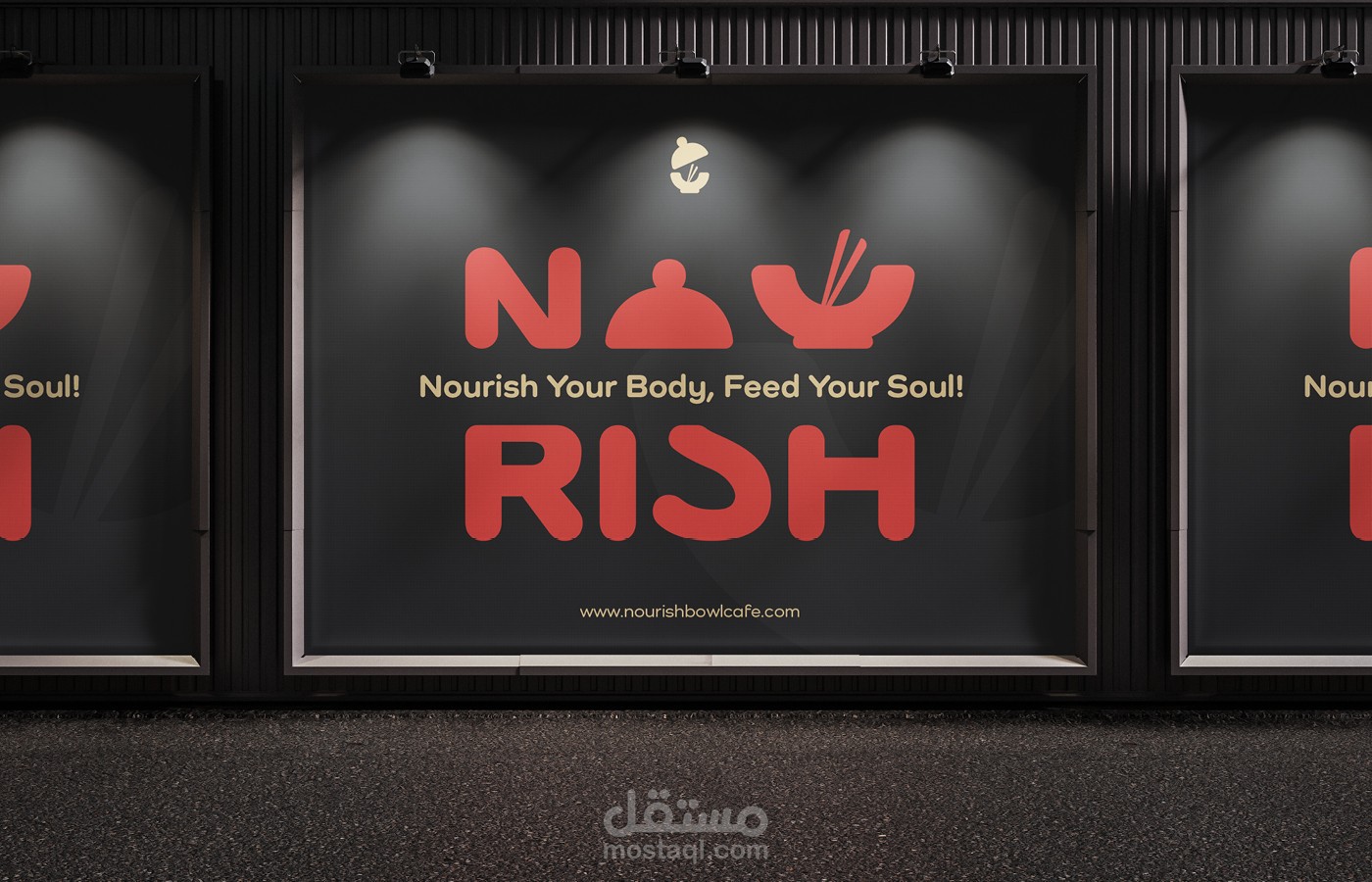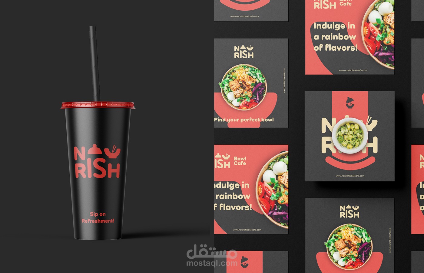 Nourish Bolw Cafe هي علامة تجارية لمطعم وجبات صحية لتنظيم النظام الغذائي وهذا الذي تشاهدون هو براندينغ كامل ل Nourish Bolw Cafe.