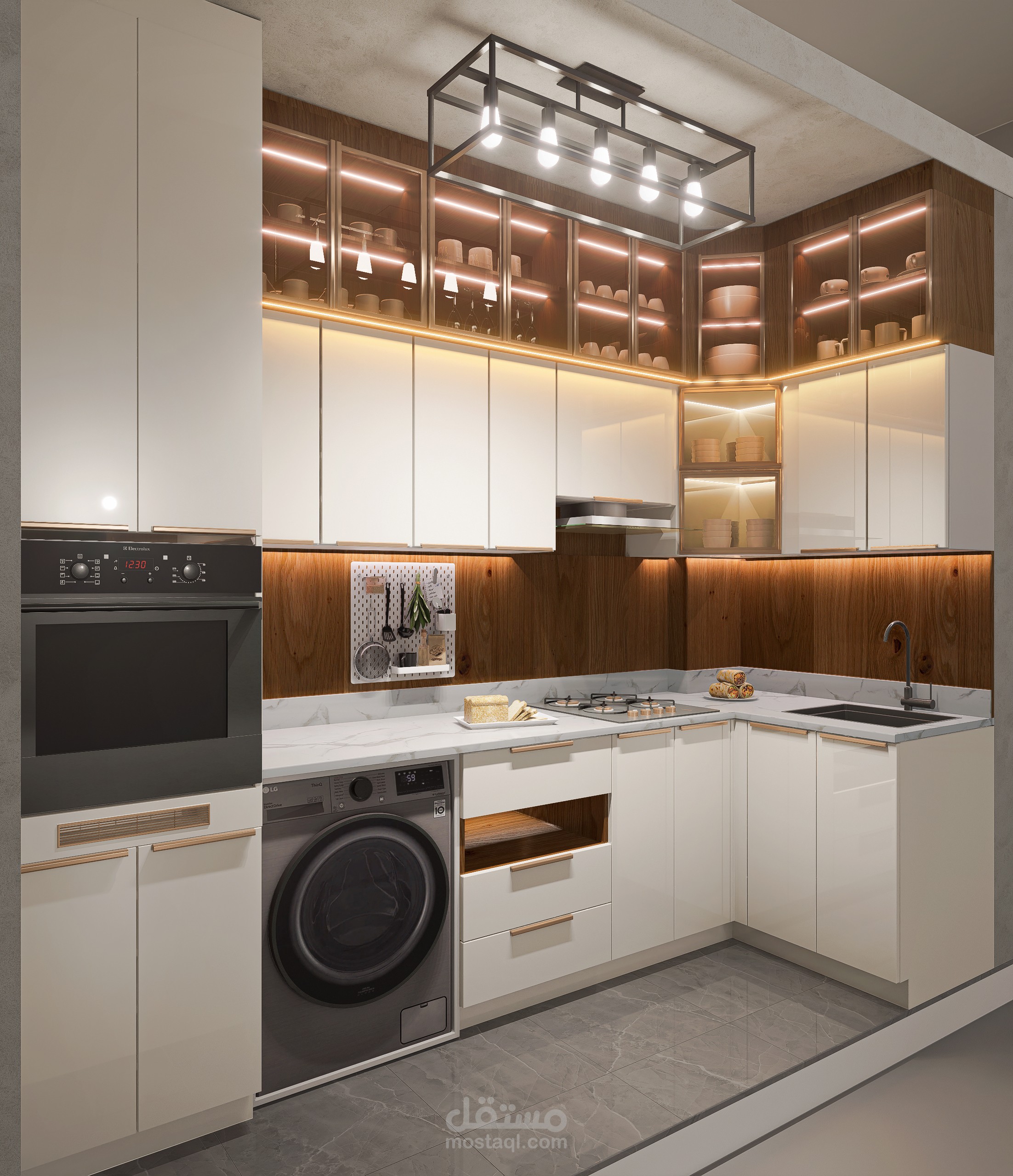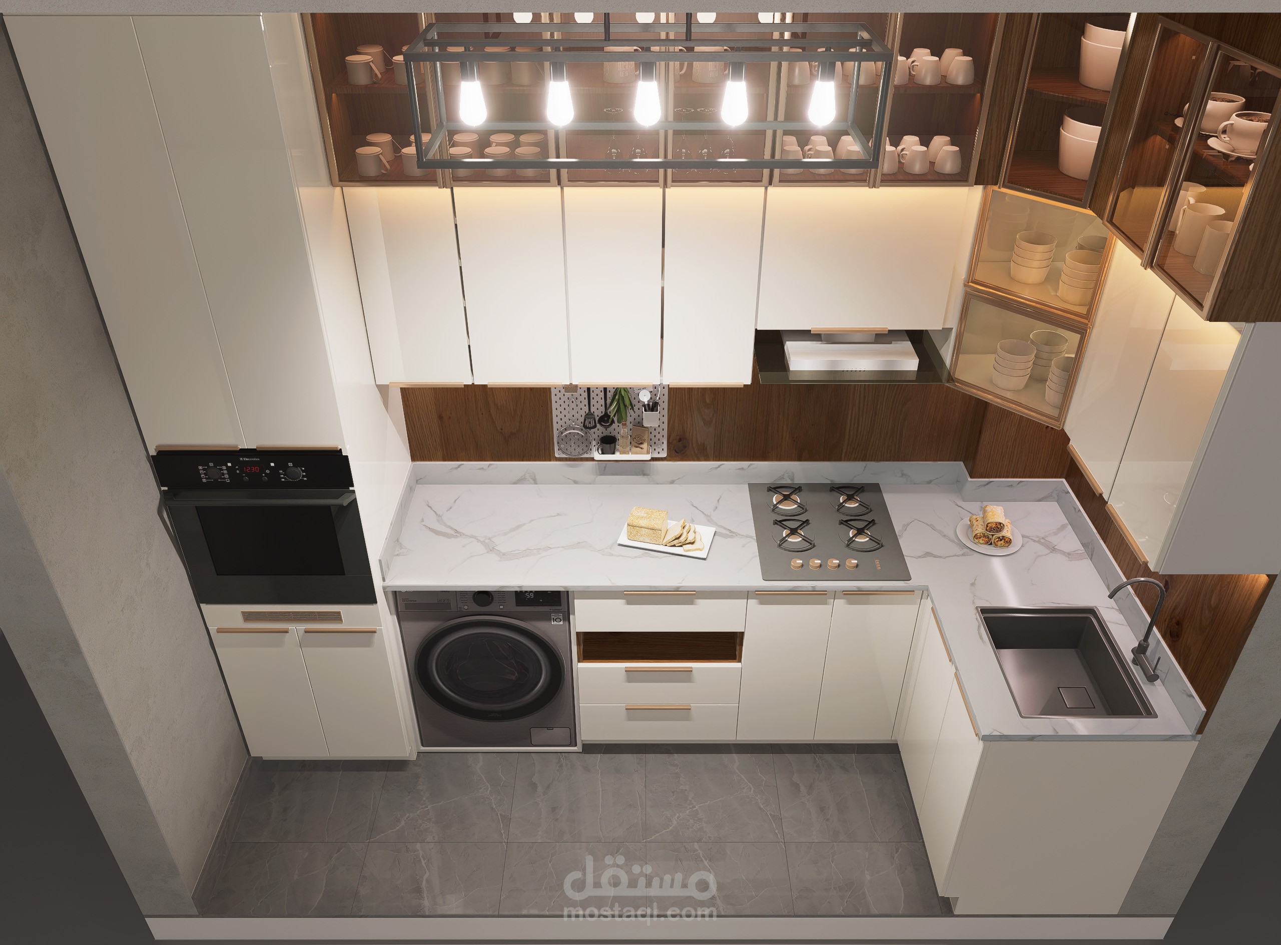 تصميم داخلي لمطبخ بمساحة 128*309 سم تقريباً 4 متر مربع .