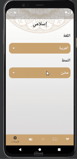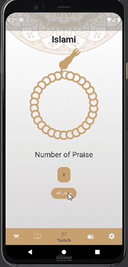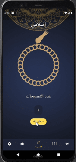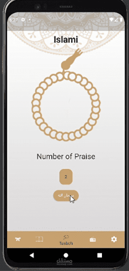 شاشة السبحة : يوجد بها زرار وtext محتواه"سبحان الله" ويتم الضغط على هذاا الزارا تزداد عدد مرات التسبيح