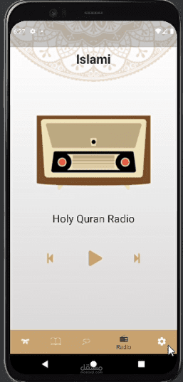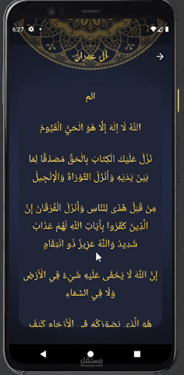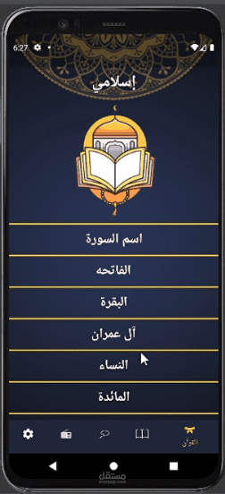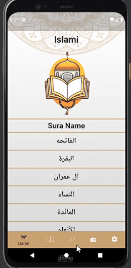 شاشة القرآن : تعرض اسماء السور القرأنية في list وعند الضغط على اي سورة سوف يعرض لنا هذه السورة