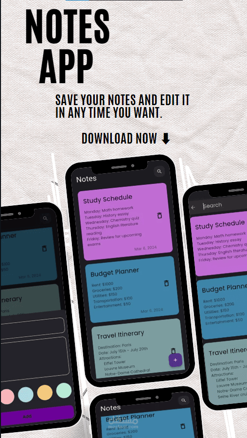But that's not all – we've made customization a breeze with a variety of vibrant colors to choose from, allowing you to personalize your notes to suit your style. And when it comes to finding what you need, our app's powerful search functionality ensures that no detail is ever lost.