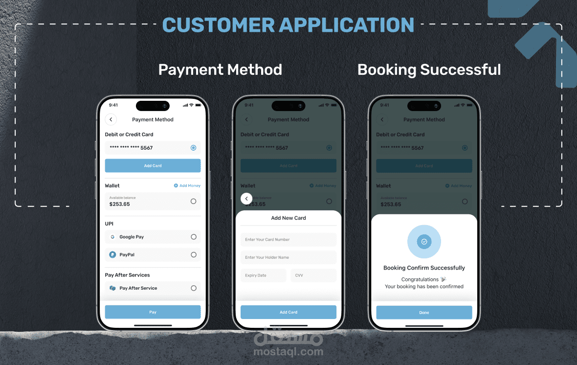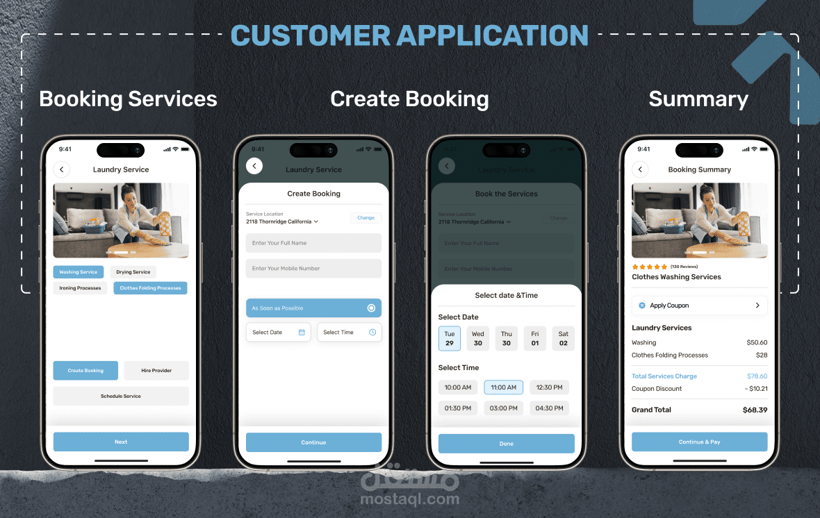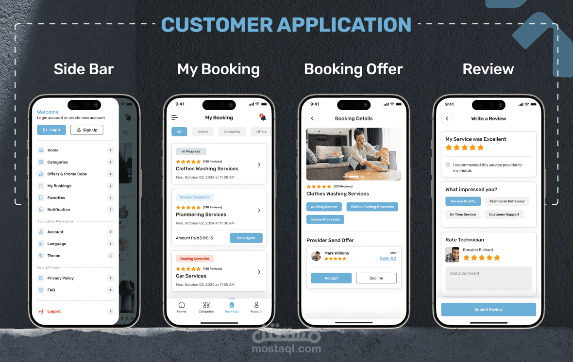 الميزات الرئيسية: تطبيق العملاء: تطبيق جوال سهل الاستخدام للعملاء لتصفح وحجز وإدارة مواعيد الخدمة بكل سهولة.